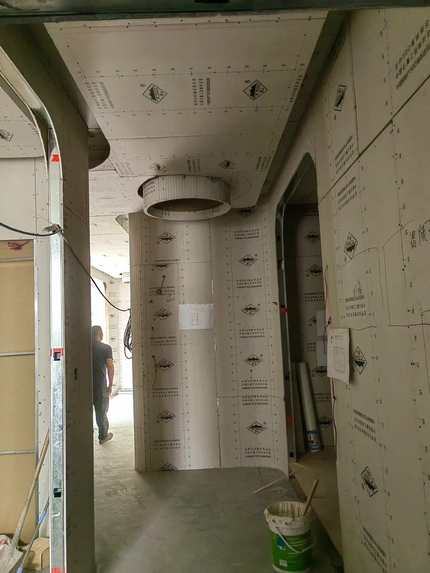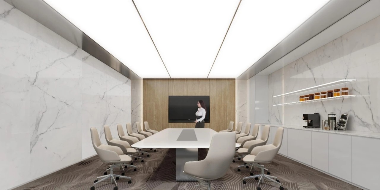 大会议室整个空间色调简洁明快,天花采用的是一整块灯膜,墙面配以木饰面吸音板,在弱化墙壁的厚重感的同时能够充分调节空间声音反射,灰色系地毯的运用使得会议室变得轻松、跳动。