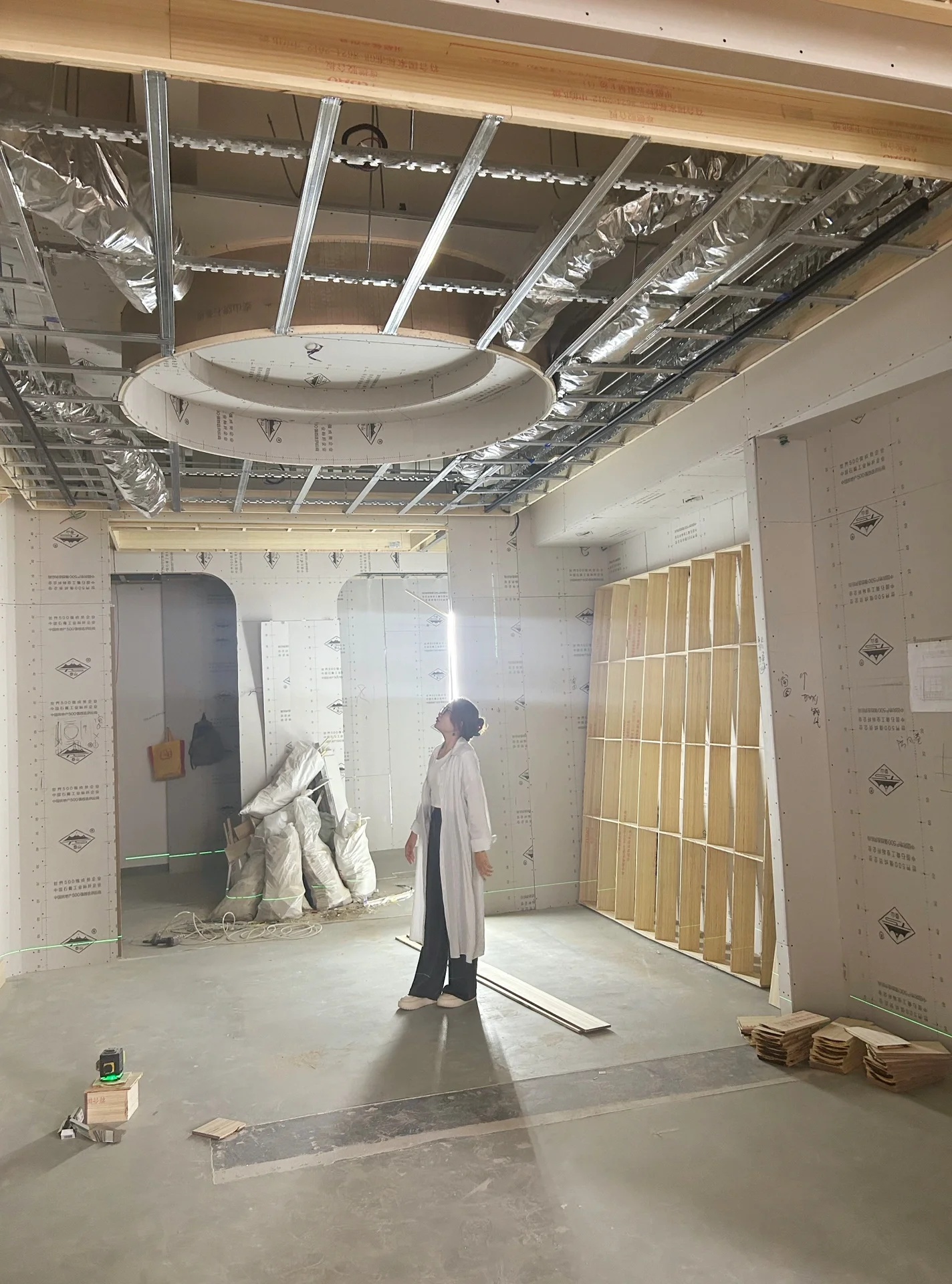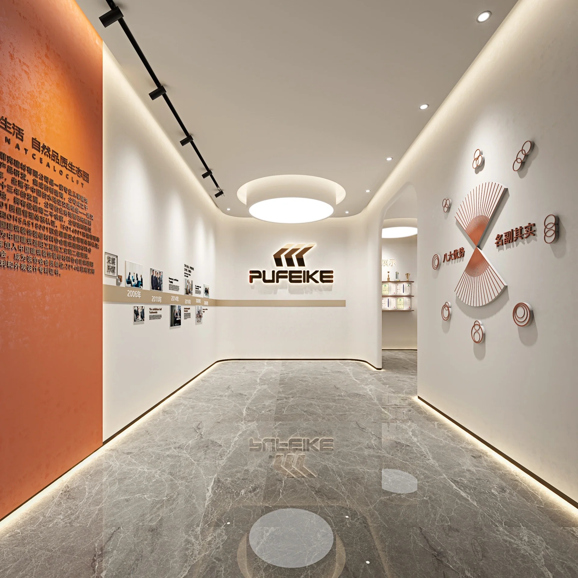 接待前厅处运用了从自然景观中提取的水元素,再通过水元素的重组和结构,运用自然材质结合当地特色,营造出一种,江水流动,江面上波光粼粼的氛围感。墙面运用了从人造景观中提取的直线条,结合由原木色与石材的柔与硬形成鲜明的对比。