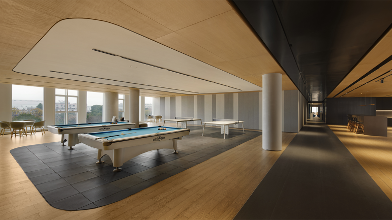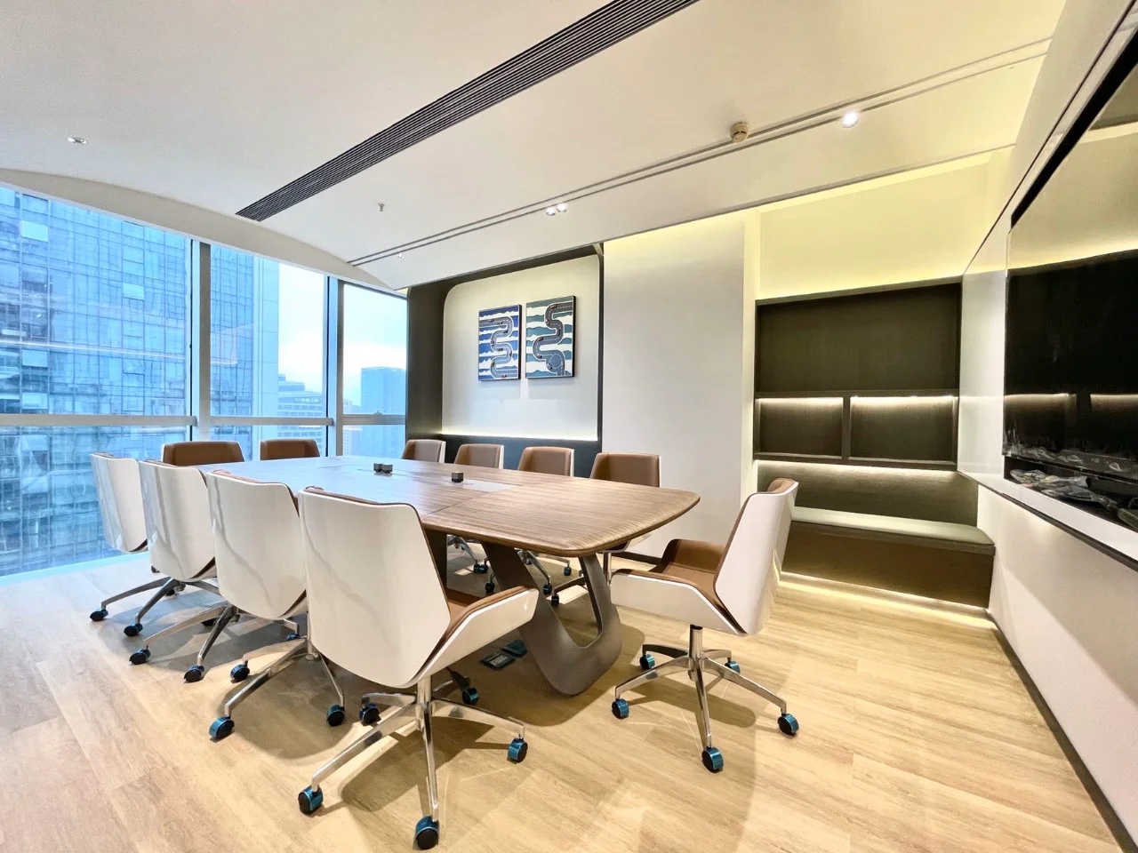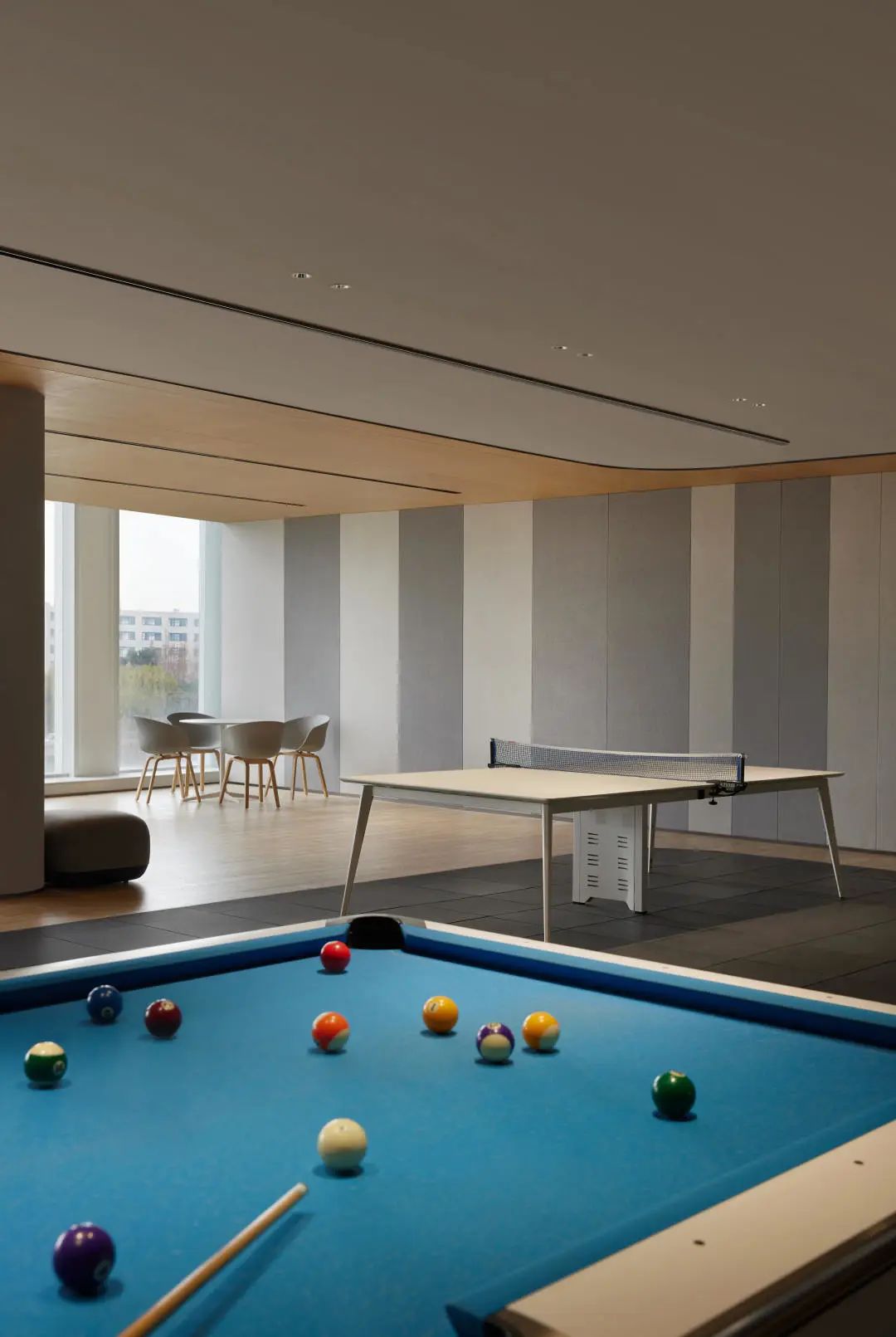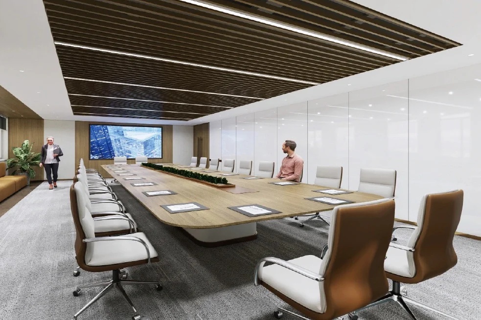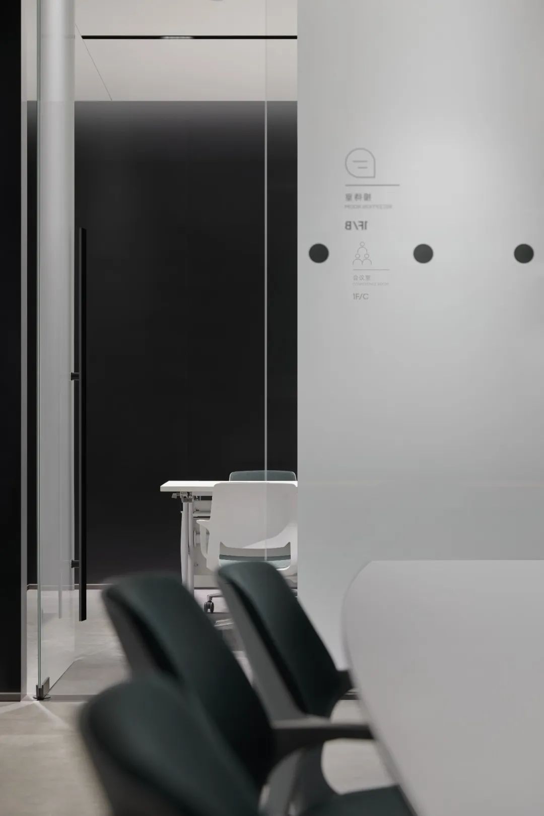 大堂右侧为中小型会议室,用于外部接待会议及面试,是较为轻松的办公场景。为了激活空间的环境友好,会议室包括一层的其他公共空间均面向户外河畔,明净的玻璃窗最大程度地利用日光来节约能源,结合节能照明、环保地毯材料,优化通风等手段以创造一个健康舒适环保的室内空间,为城市可持续发展的未来做贡献。