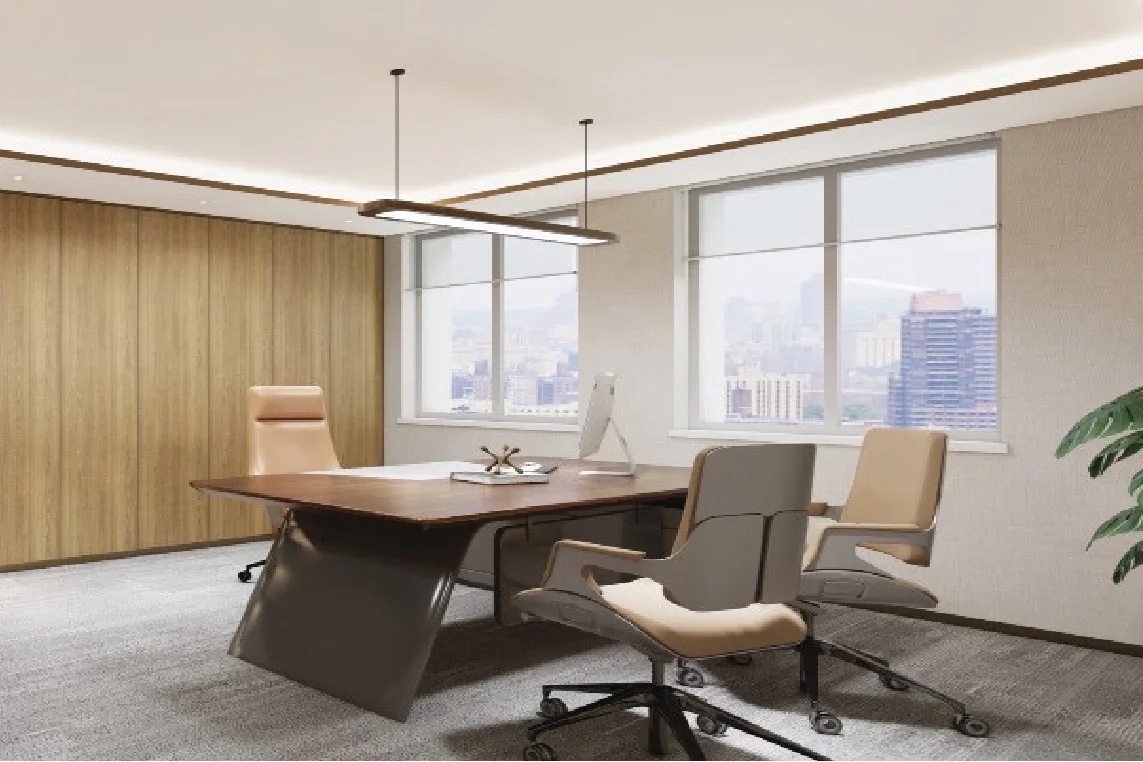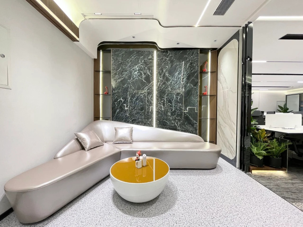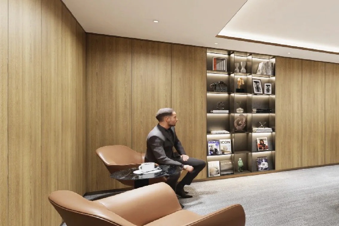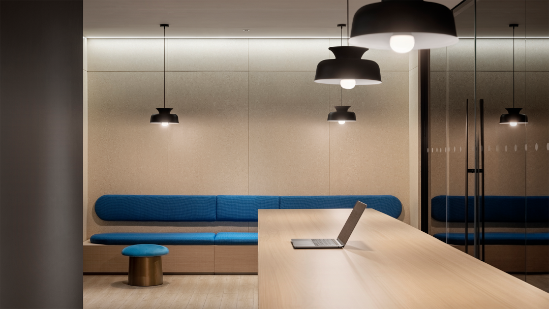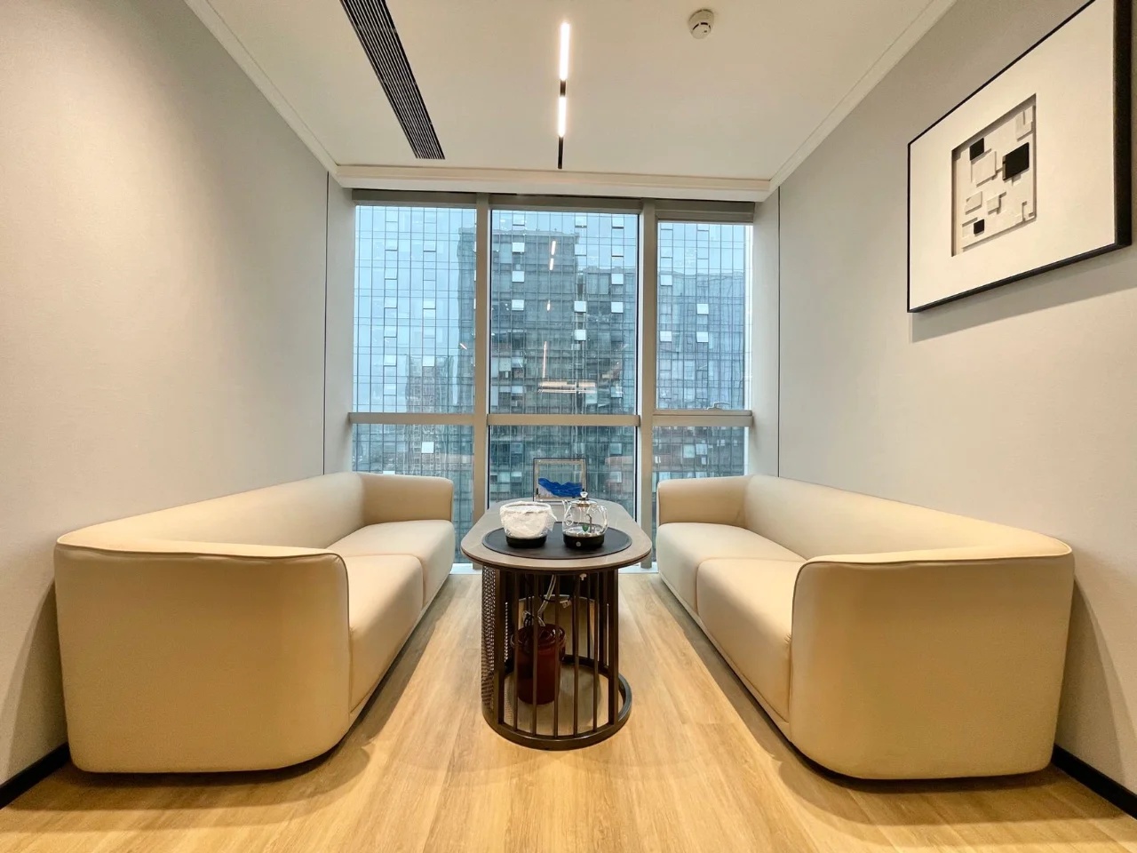 大堂右侧为中小型会议室,用于外部接待会议及面试,是较为轻松的办公场景。为了激活空间的环境友好,会议室包括一层的其他公共空间均面向户外河畔,明净的玻璃窗最大程度地利用日光来节约能源,结合节能照明、环保地毯材料,优化通风等手段以创造一个健康舒适环保的室内空间,为城市可持续发展的未来做贡献。