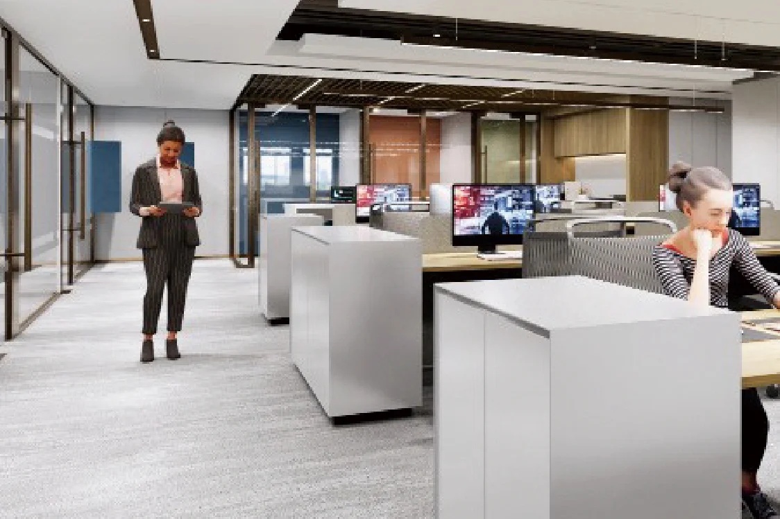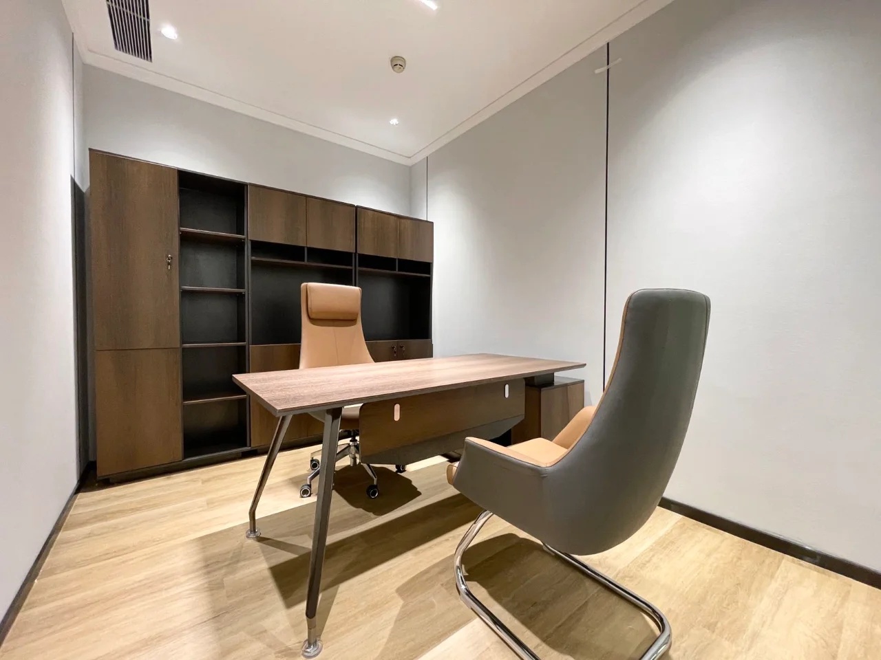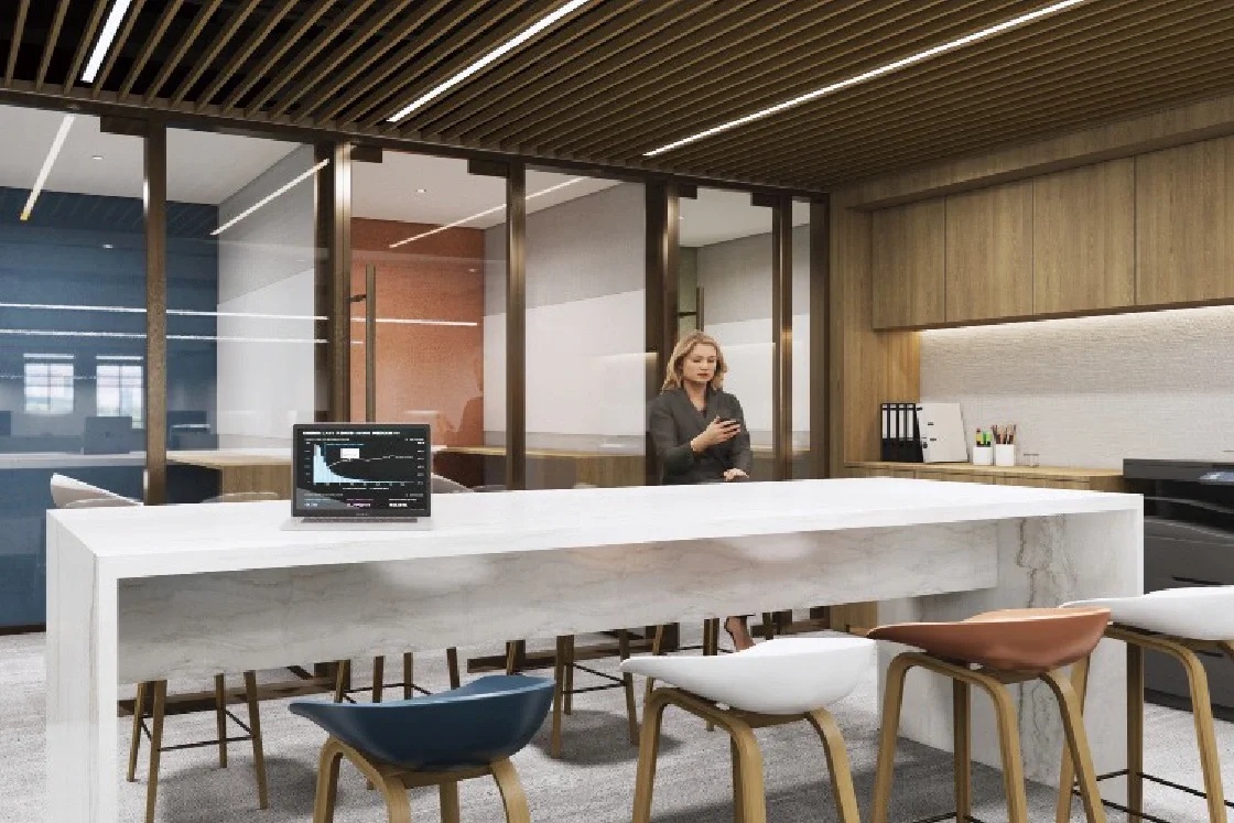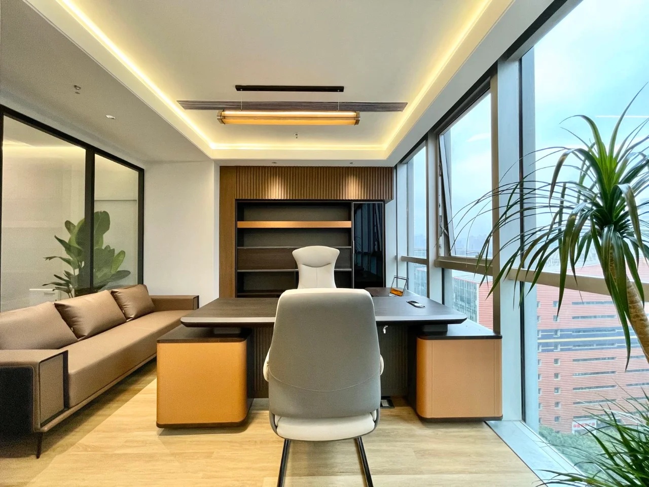 大堂右侧为中小型会议室,用于外部接待会议及面试,是较为轻松的办公场景。为了激活空间的环境友好,会议室包括一层的其他公共空间均面向户外河畔,明净的玻璃窗最大程度地利用日光来节约能源,结合节能照明、环保地毯材料,优化通风等手段以创造一个健康舒适环保的室内空间,为城市可持续发展的未来做贡献。