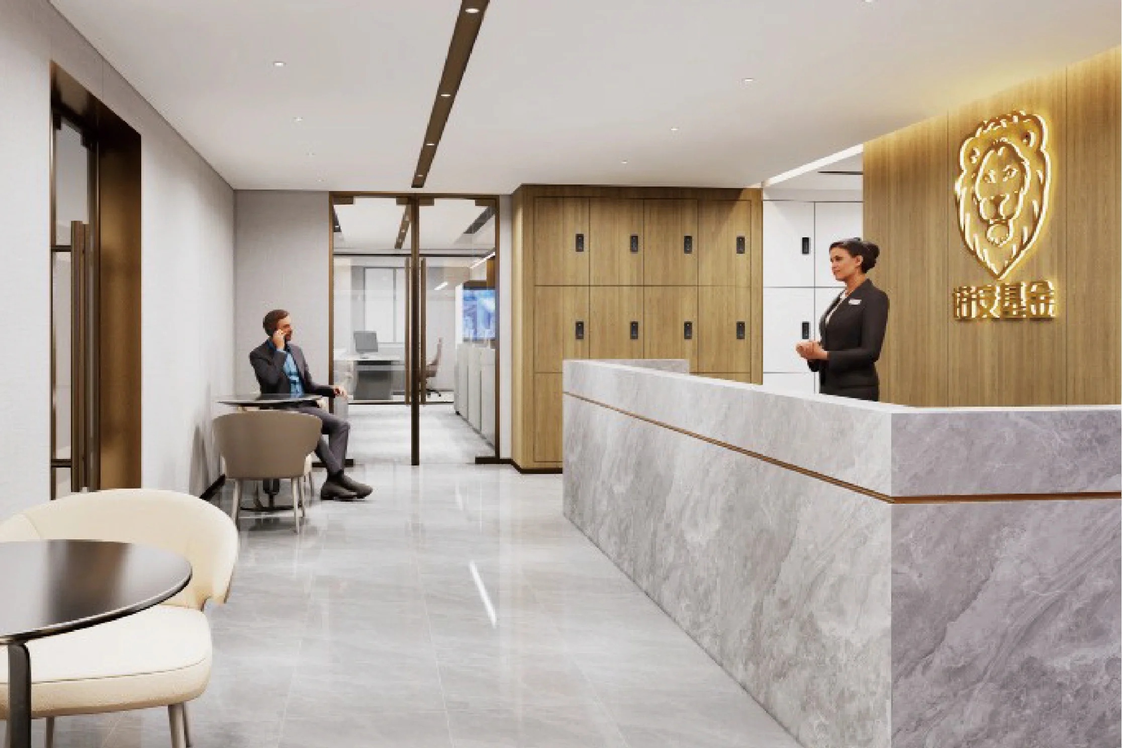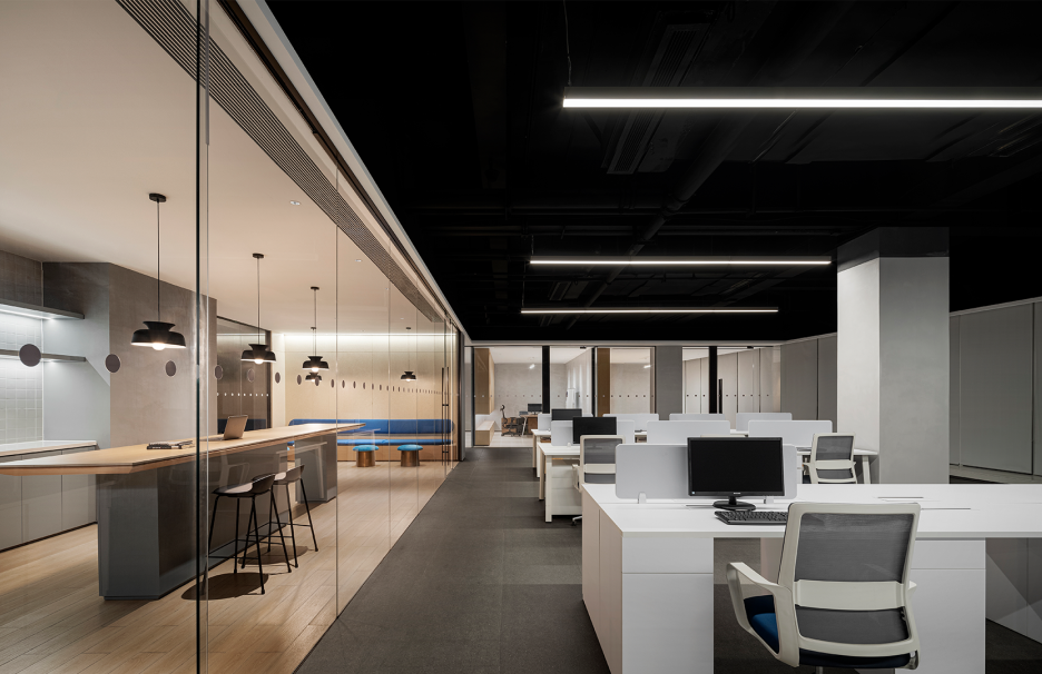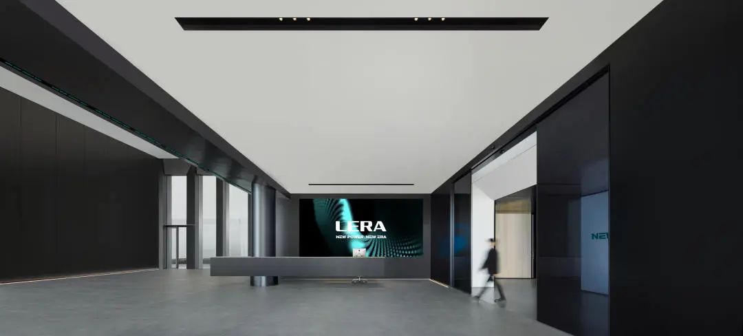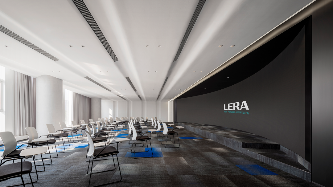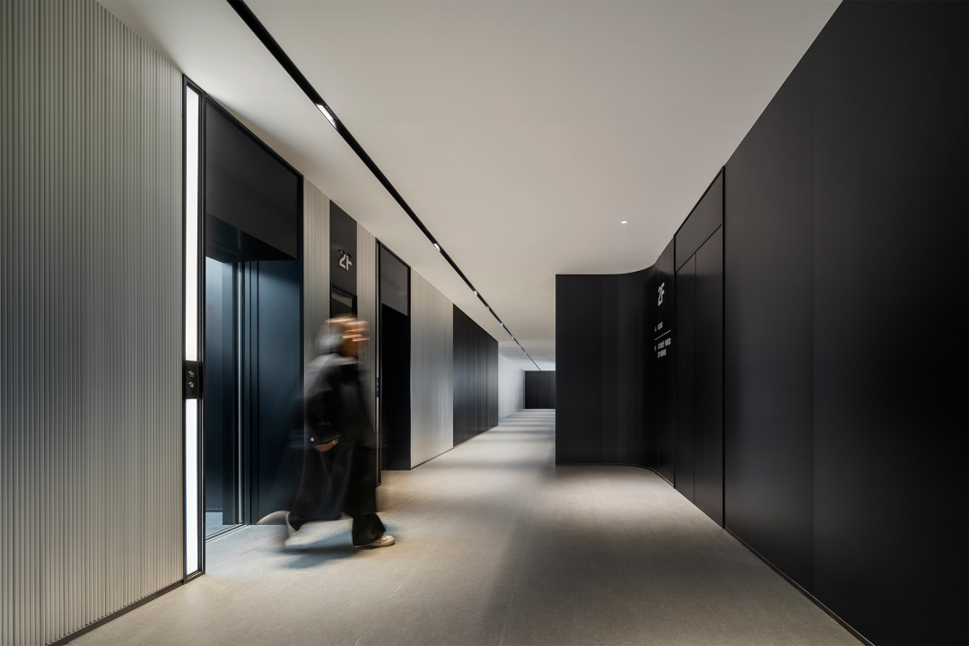 大堂承载对外展示接待和企业数百名职工的交通停留等复合功能,立品采用精炼留白的空间节奏来处理此区域。挑空的恢弘空间将制造业的专业性转化为结构性的简洁明了,黑白主色调的结合营造严谨的企业文化气质。5米长的悬挑前台与天花体块连接,形成视觉的整体感和延伸效果。