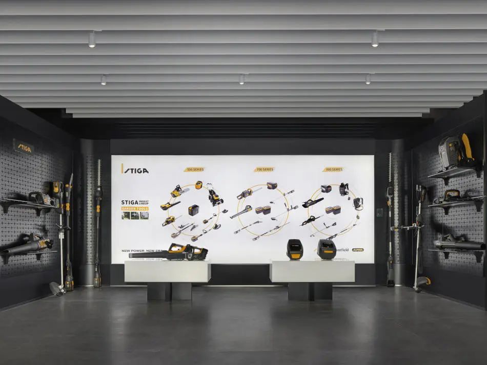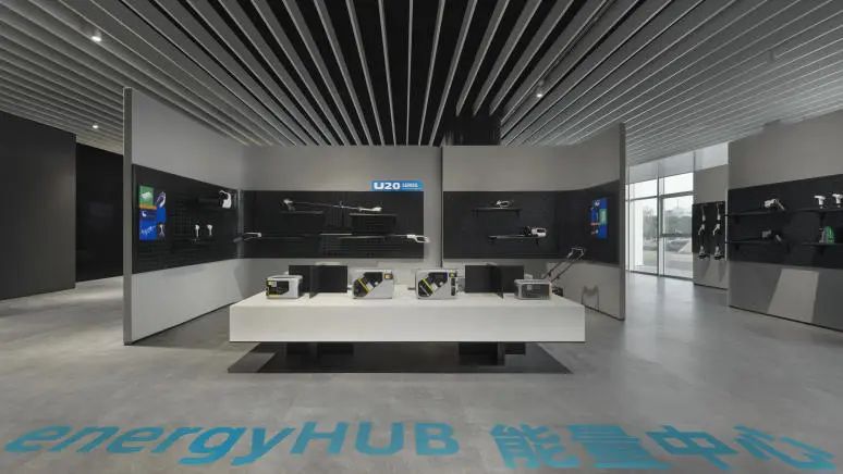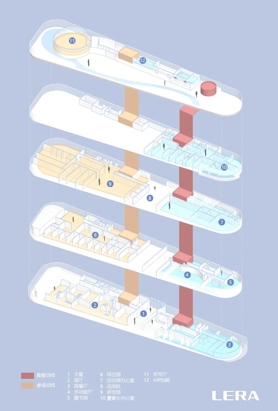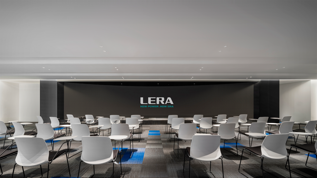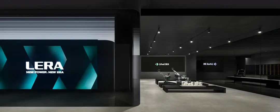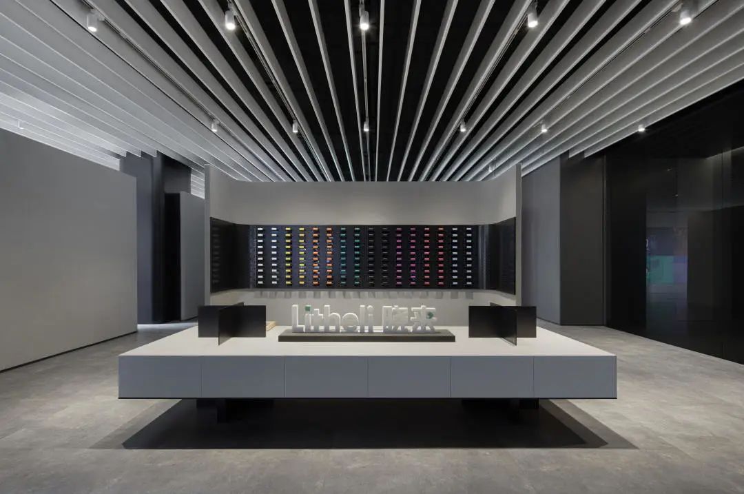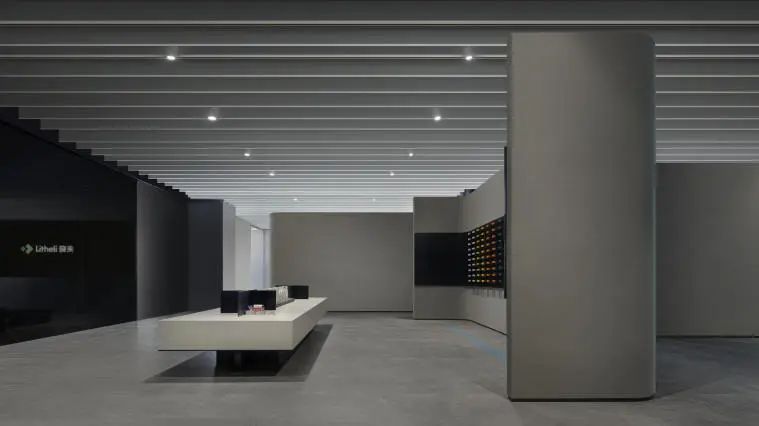 以大堂为中轴,立品在两侧分别梳理出满足“企业文化和产品展示”以及“轻办公+休闲运动”的两条动线。左侧为企业展厅,以入口展示模块为界,两侧空间分别对应动一集团OEM产品和自主品牌Litheli的产品展示。