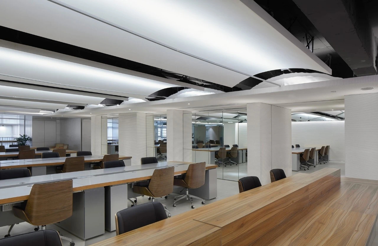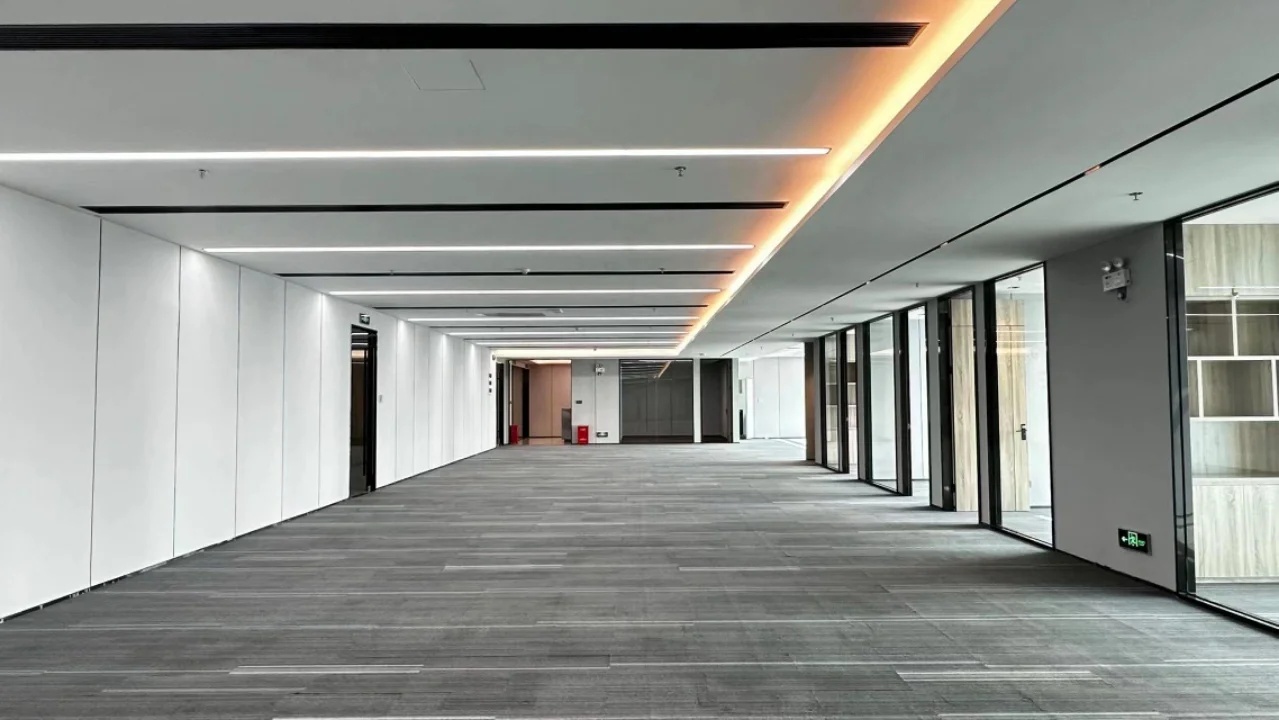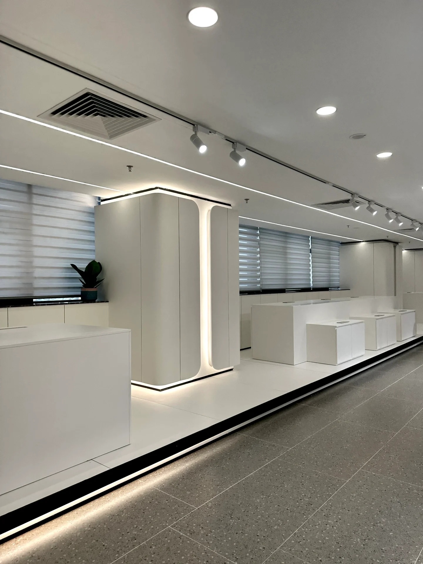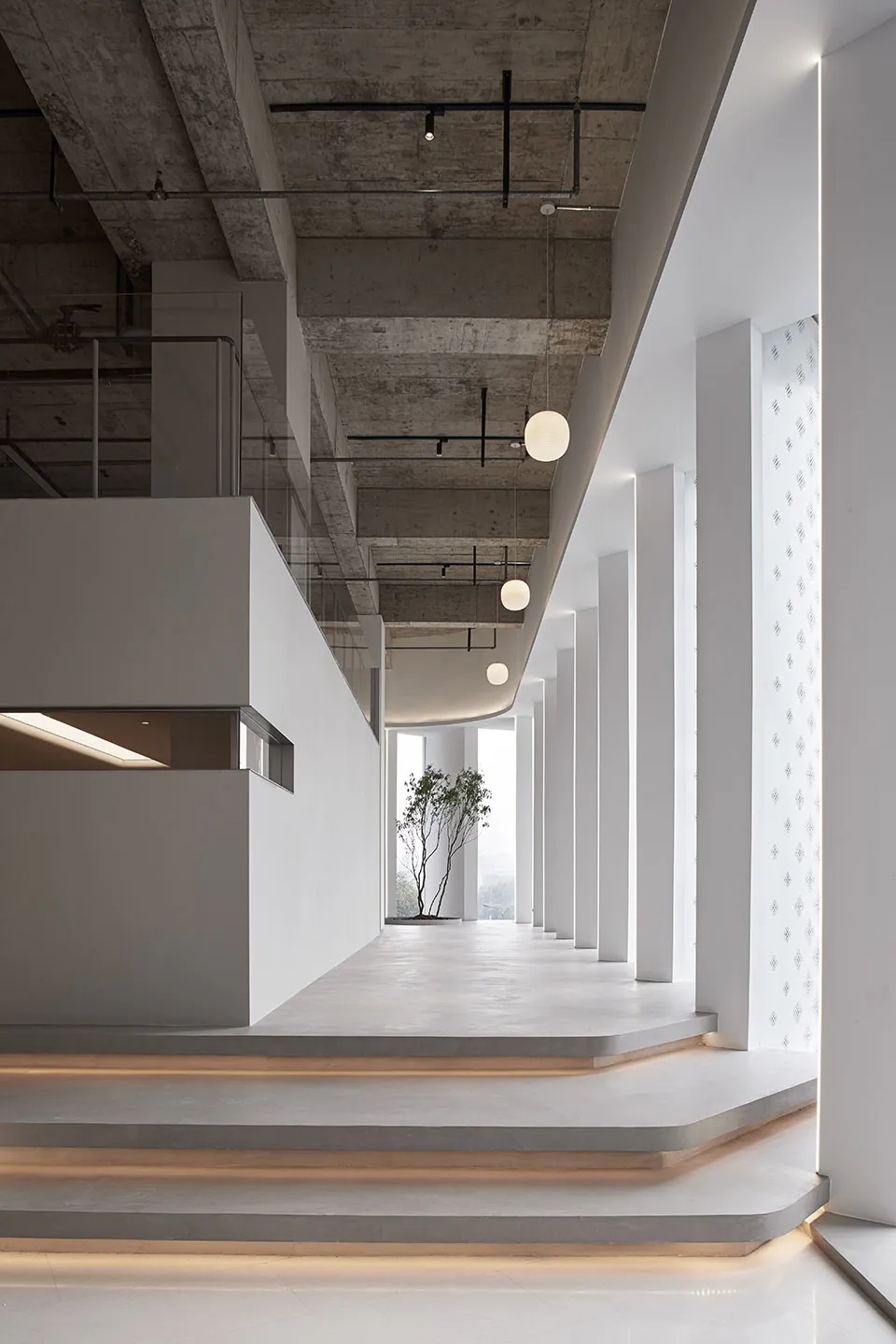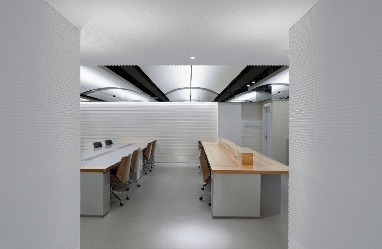 我们设计了许多个白色的长筒形天花板,用于形成大屋檐的意向。再用向上打光的灯条将其打亮,引导光线通过拱形天花再折射下来,形成一种明亮的,柔和弥散的光线氛围。长筒形的天花板遮挡住上方裸顶的杂乱管线,同时又微微向上拱起,让人感知上忽略掉了层高较低的影响。
