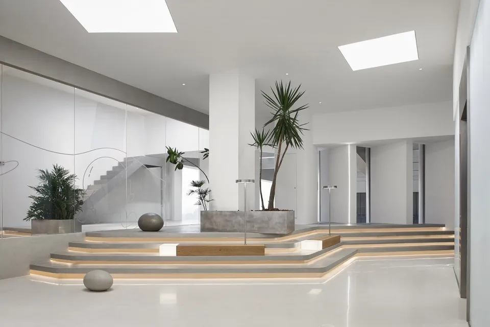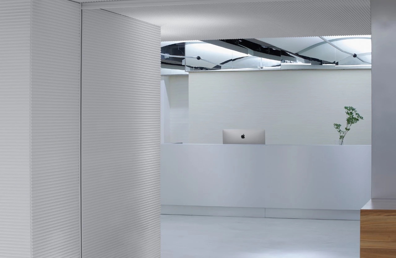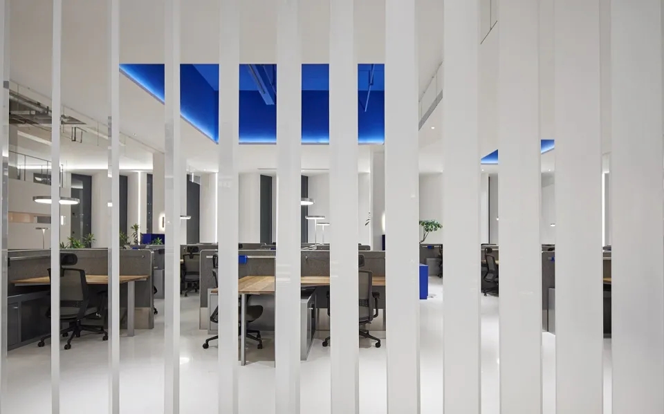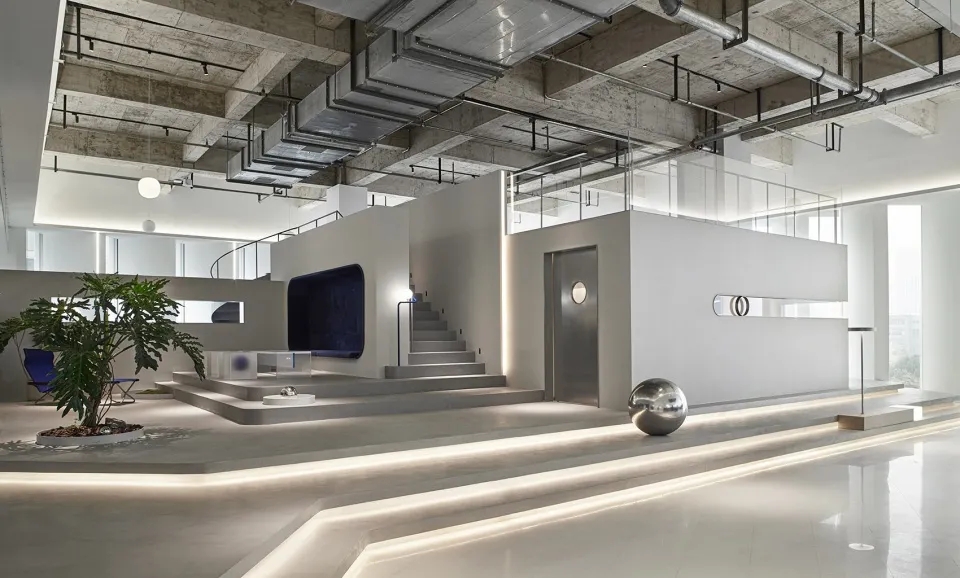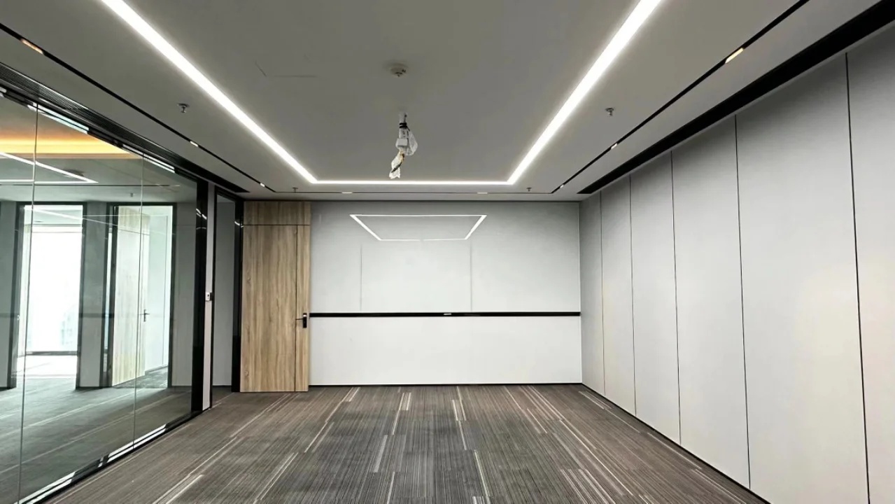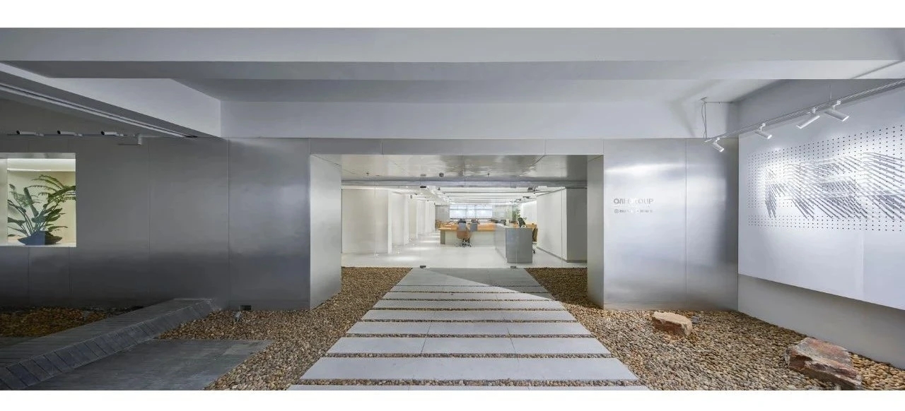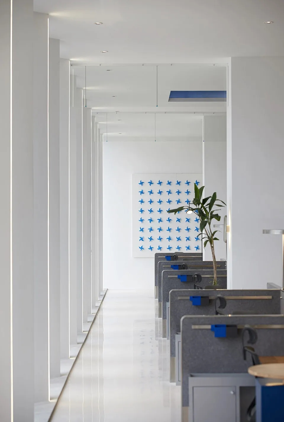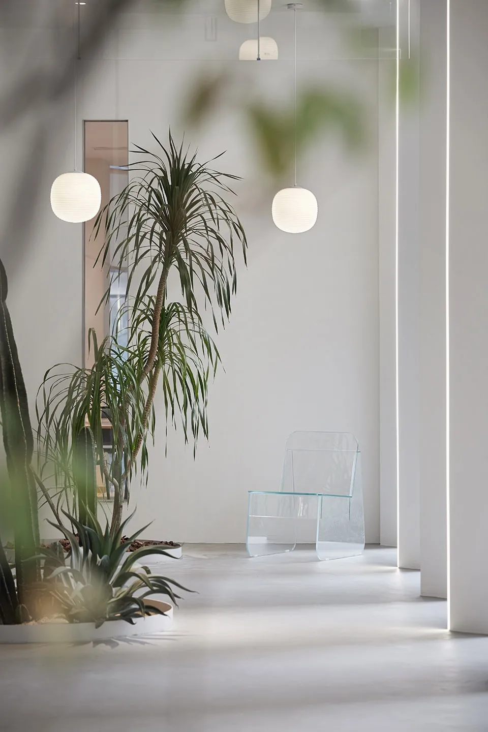 我们设计了许多个白色的长筒形天花板,用于形成大屋檐的意向。再用向上打光的灯条将其打亮,引导光线通过拱形天花再折射下来,形成一种明亮的,柔和弥散的光线氛围。长筒形的天花板遮挡住上方裸顶的杂乱管线,同时又微微向上拱起,让人感知上忽略掉了层高较低的影响。