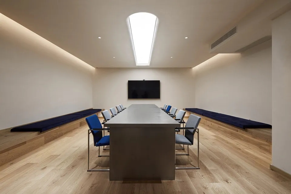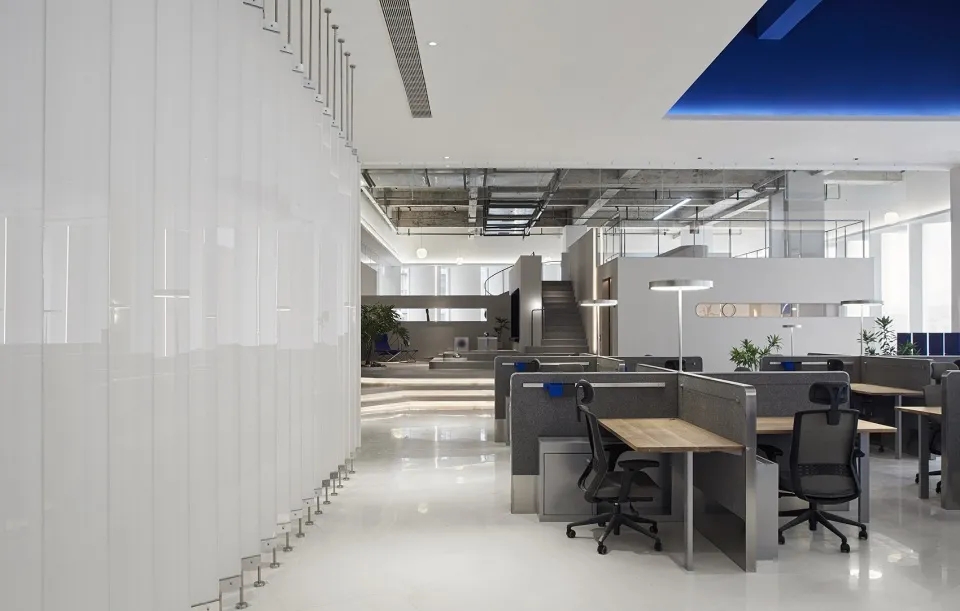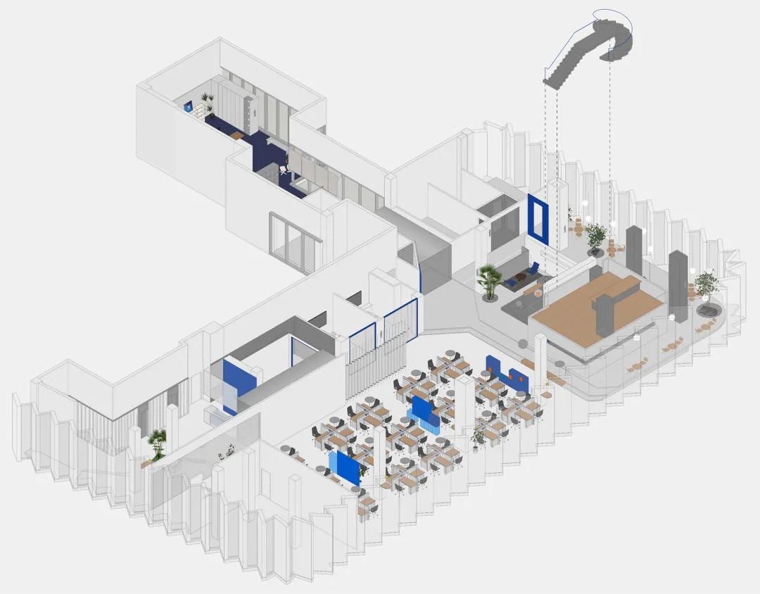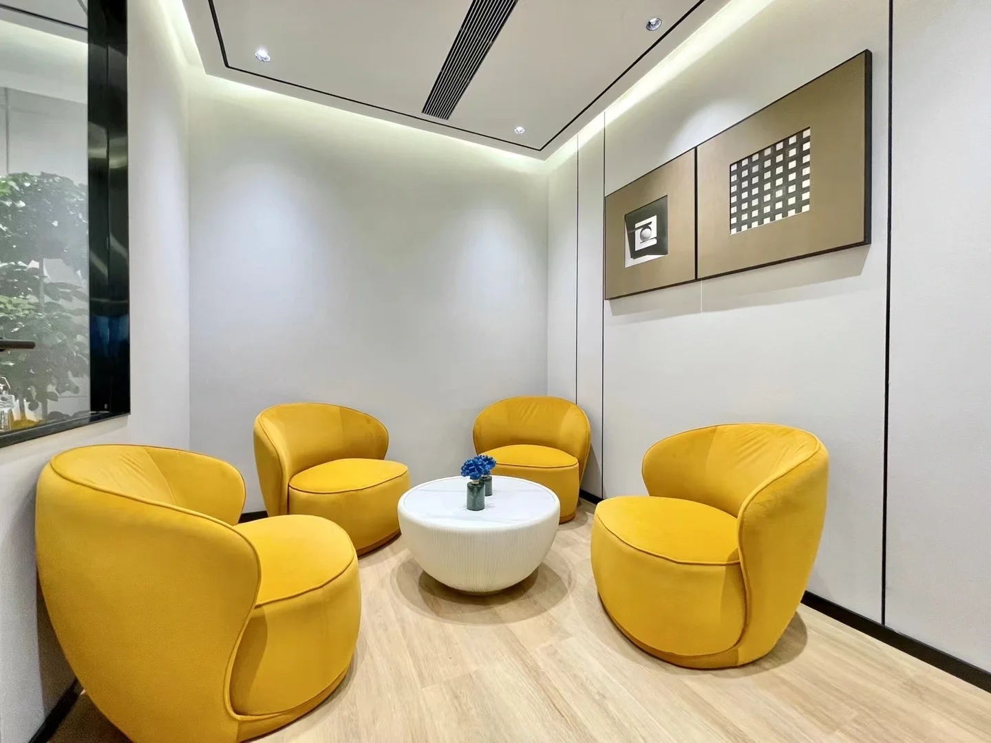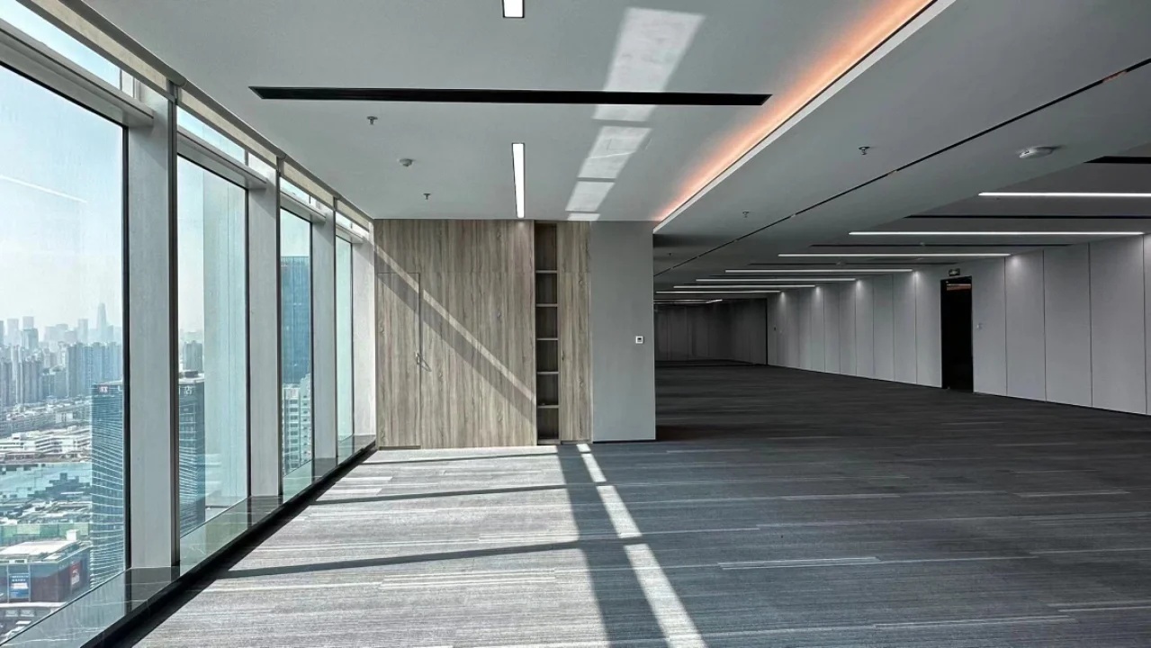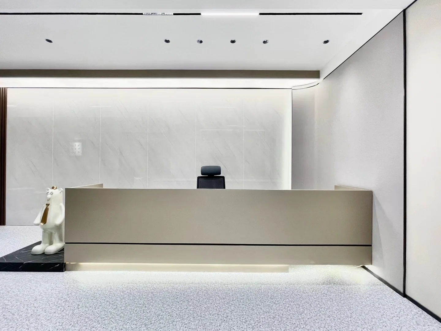 我们设计了许多个白色的长筒形天花板,用于形成大屋檐的意向。再用向上打光的灯条将其打亮,引导光线通过拱形天花再折射下来,形成一种明亮的,柔和弥散的光线氛围。长筒形的天花板遮挡住上方裸顶的杂乱管线,同时又微微向上拱起,让人感知上忽略掉了层高较低的影响。