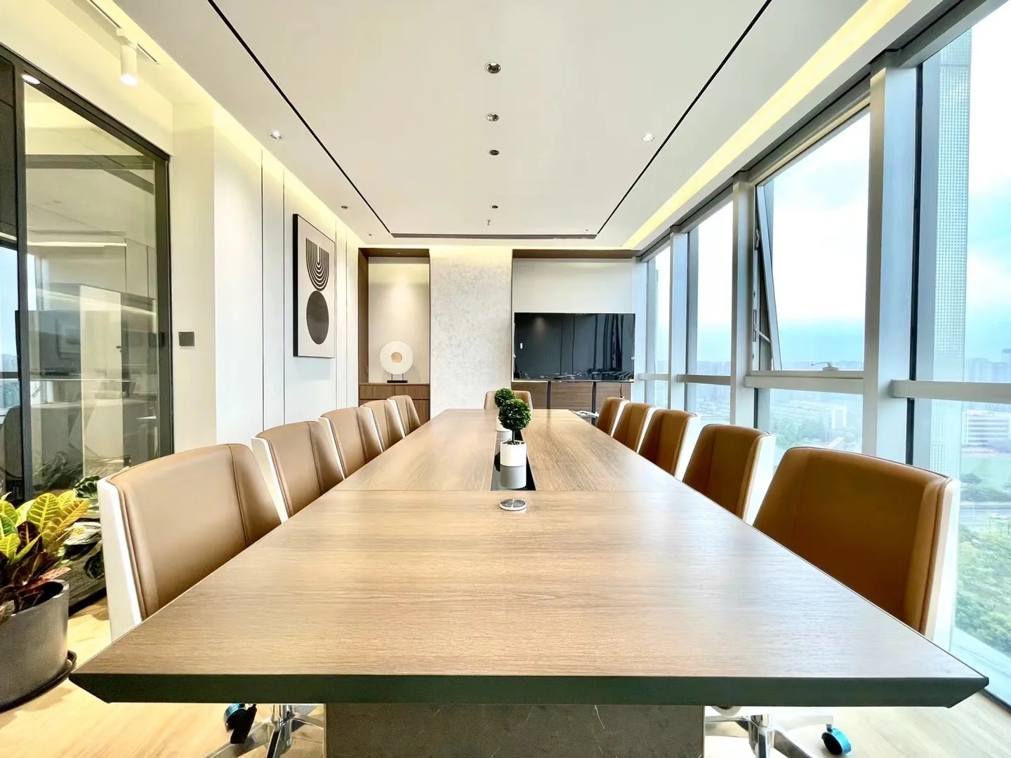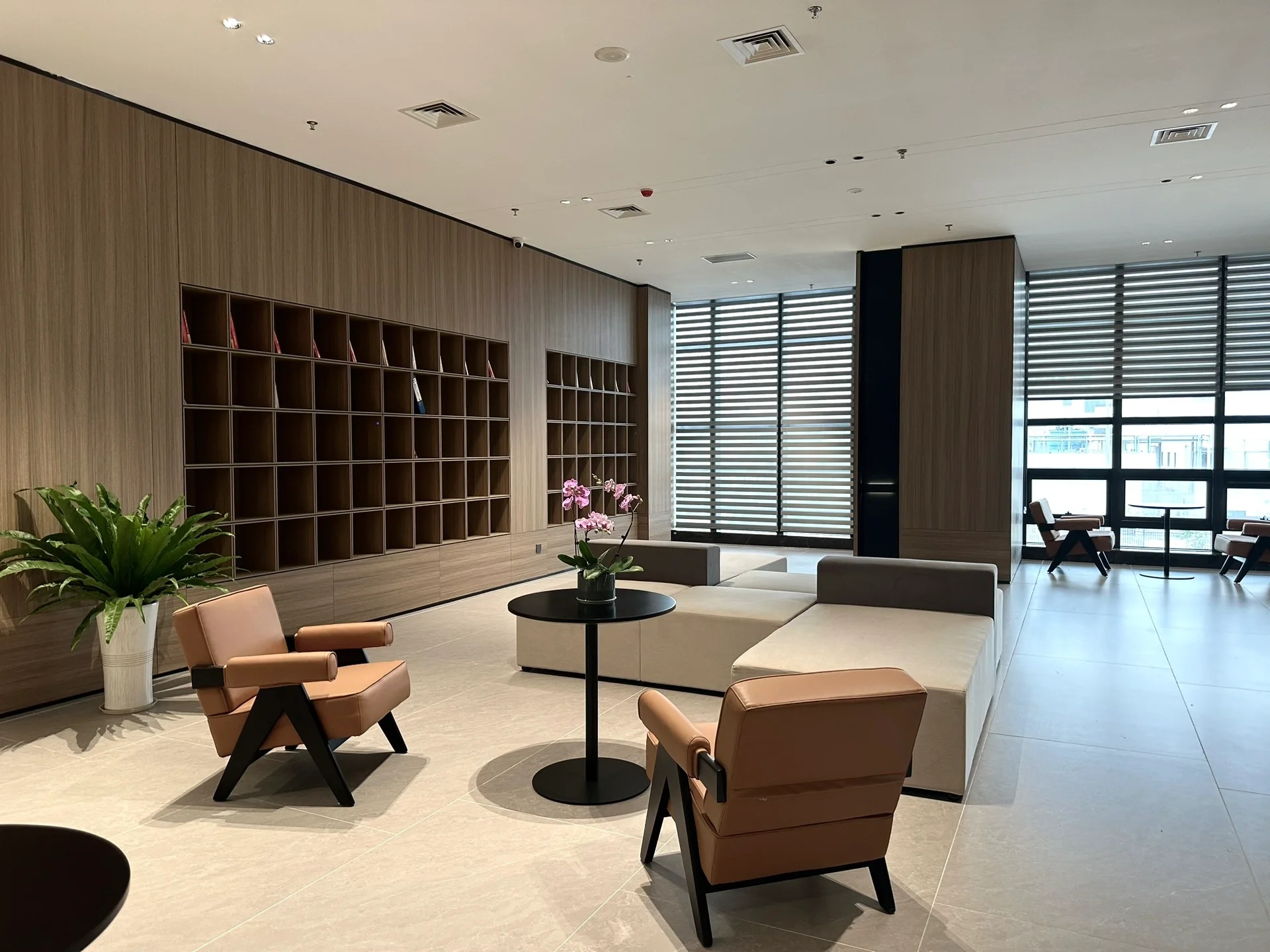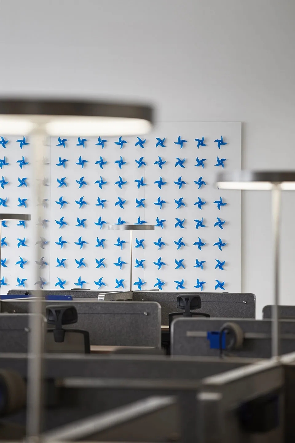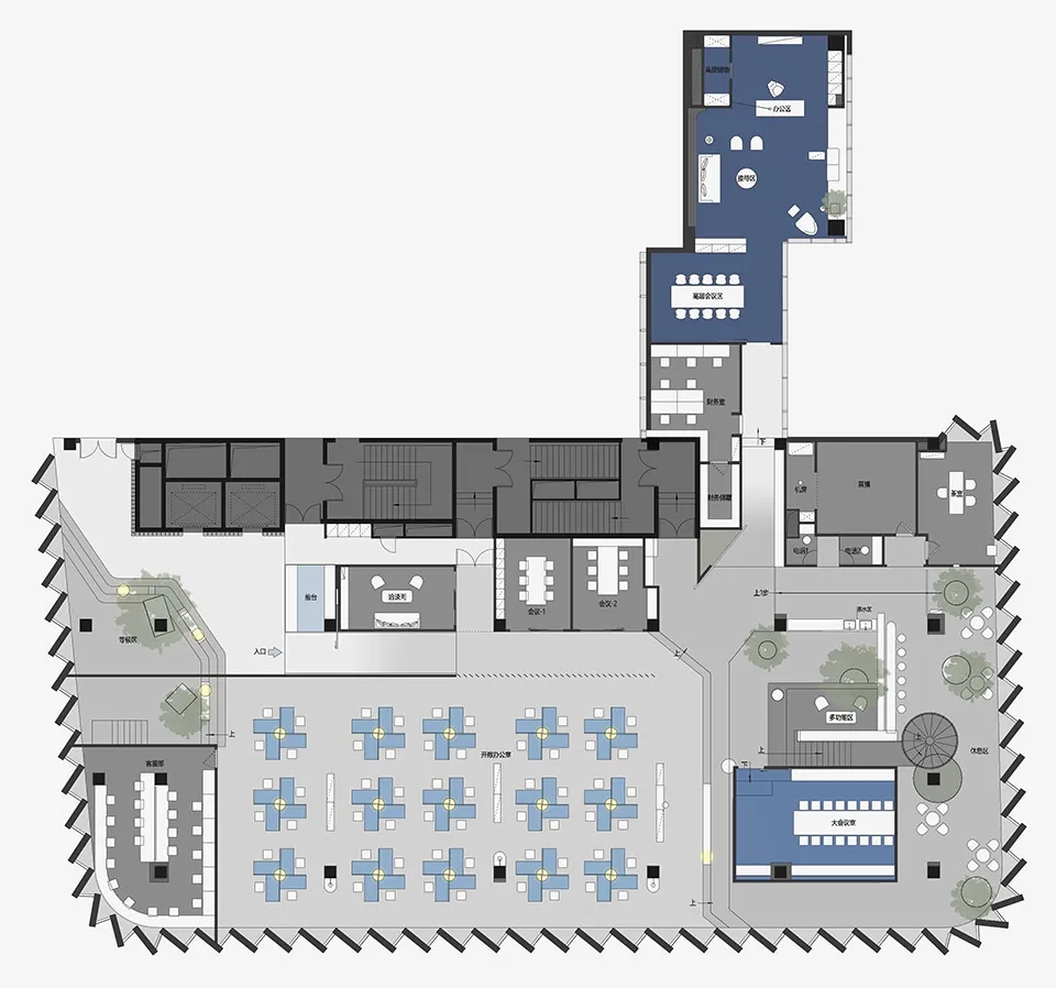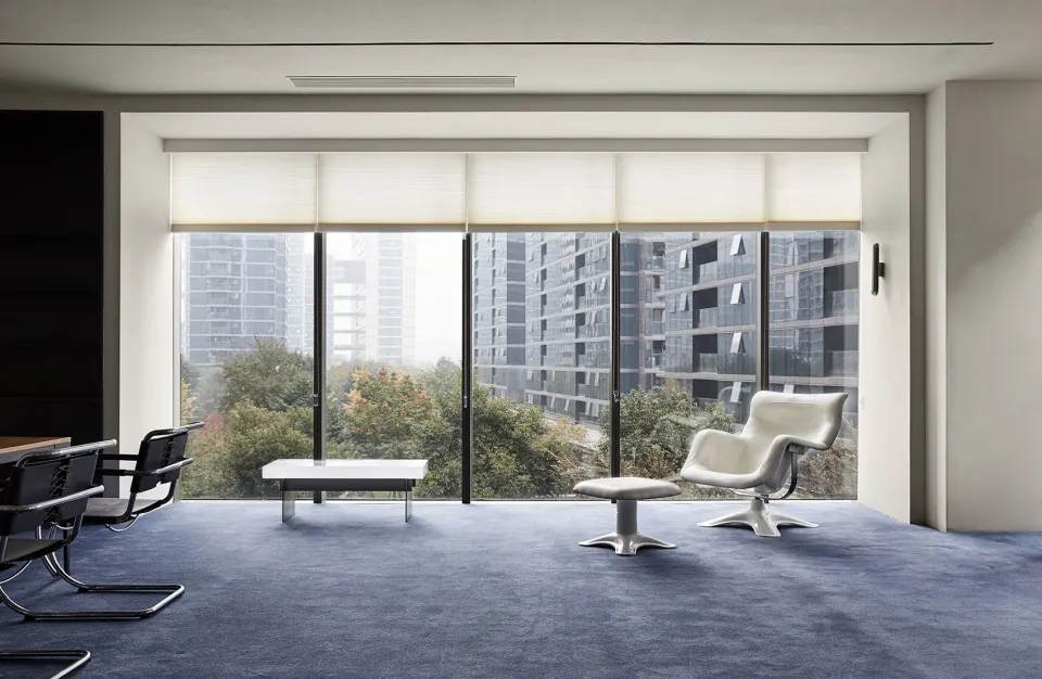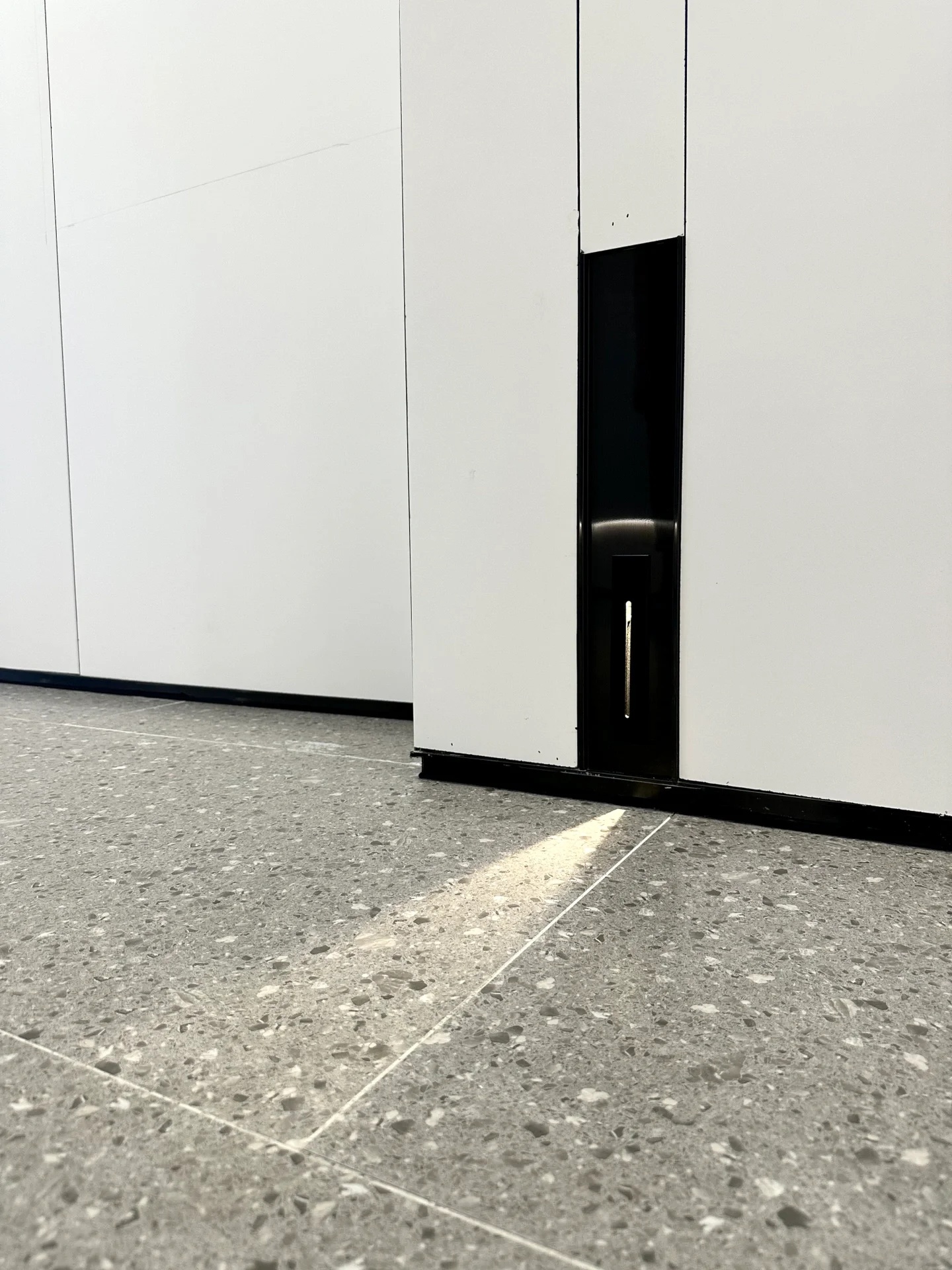 我们设计了许多个白色的长筒形天花板,用于形成大屋檐的意向。再用向上打光的灯条将其打亮,引导光线通过拱形天花再折射下来,形成一种明亮的,柔和弥散的光线氛围。长筒形的天花板遮挡住上方裸顶的杂乱管线,同时又微微向上拱起,让人感知上忽略掉了层高较低的影响。