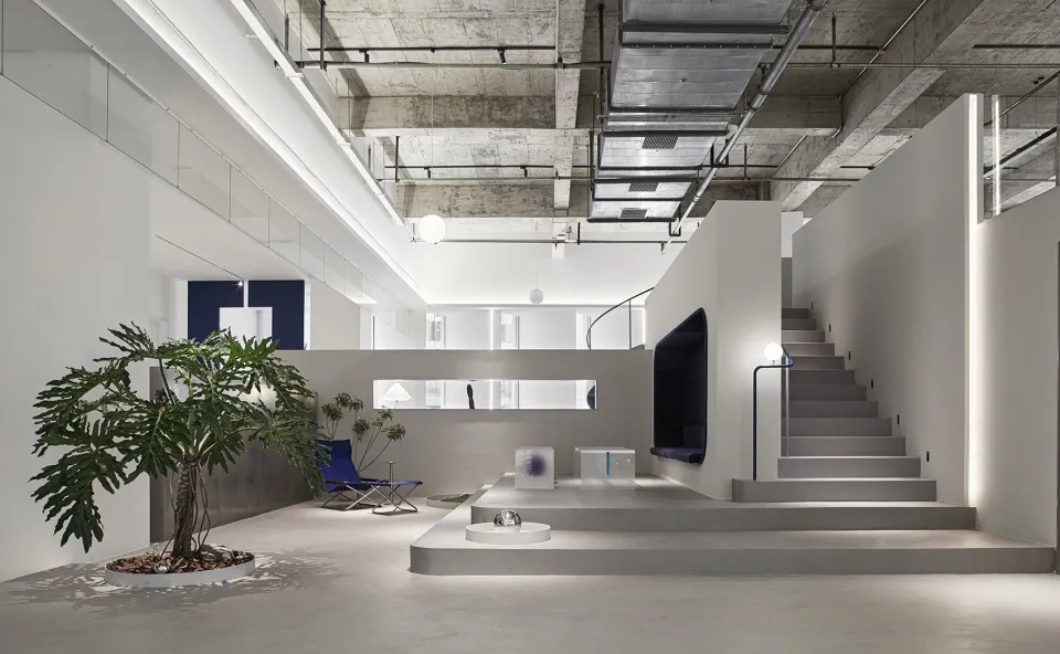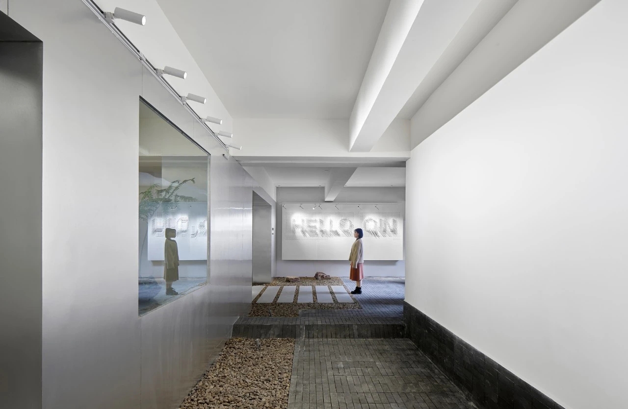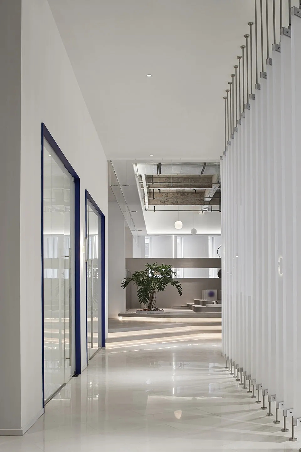 场地的现状条件是非常严峻的。客户租用的空间是相邻的独立两户,由厚重的墙体分隔为左右两个空间,两户之间仅可以通过外部的外廊连接。空间呈窄开间,大进深的长条矩形平面,中部区域的自然采光很弱。另外,梁的间距较密,梁下的高度也较低,仅有2.6米净高,让人略有压抑之感。