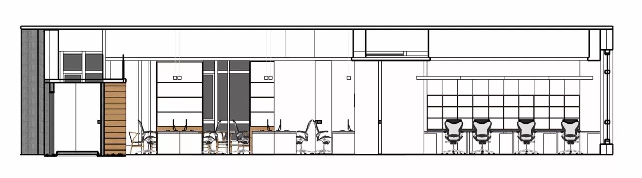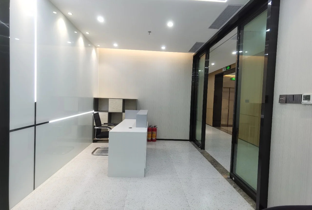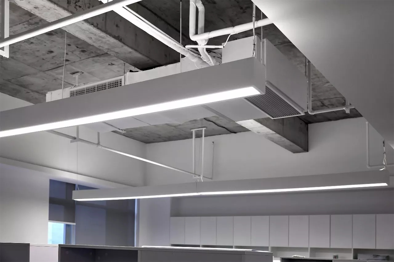办公空间的长吊灯是我们自己设计的,上下双面通透,让空间更有延展性。同时将导视系统融合在空间里,也是一个很好的处理方式,更好地保障了现代设计的完整度。