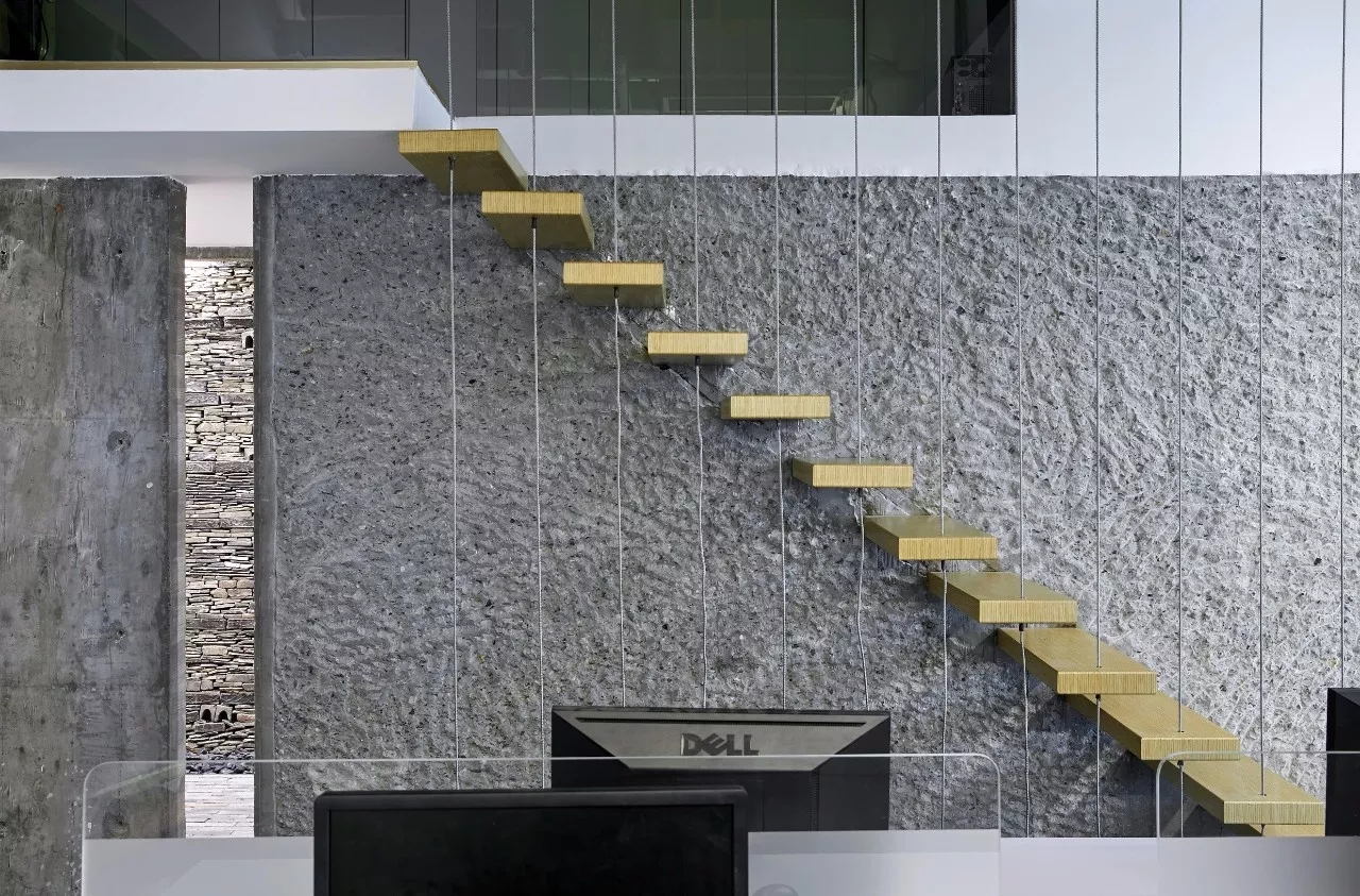 楼梯是建筑内的建筑,用结构来表现空间,是此次方案中的一个亮点,浩然的办公室夹层空间的楼梯,设计师采用了钢索拉伸的结构方式,一个小尺度的构件,却也对空间产生了巨大的影响,仿佛能看到有双结实有力的工匠之手,轻缓而又细致地为你所在的空间护航。