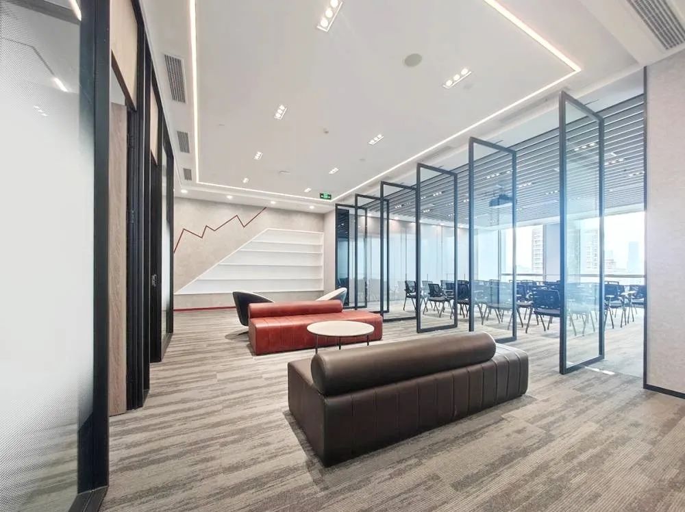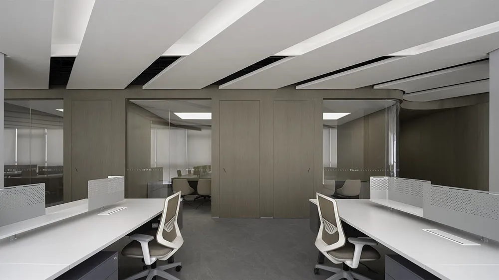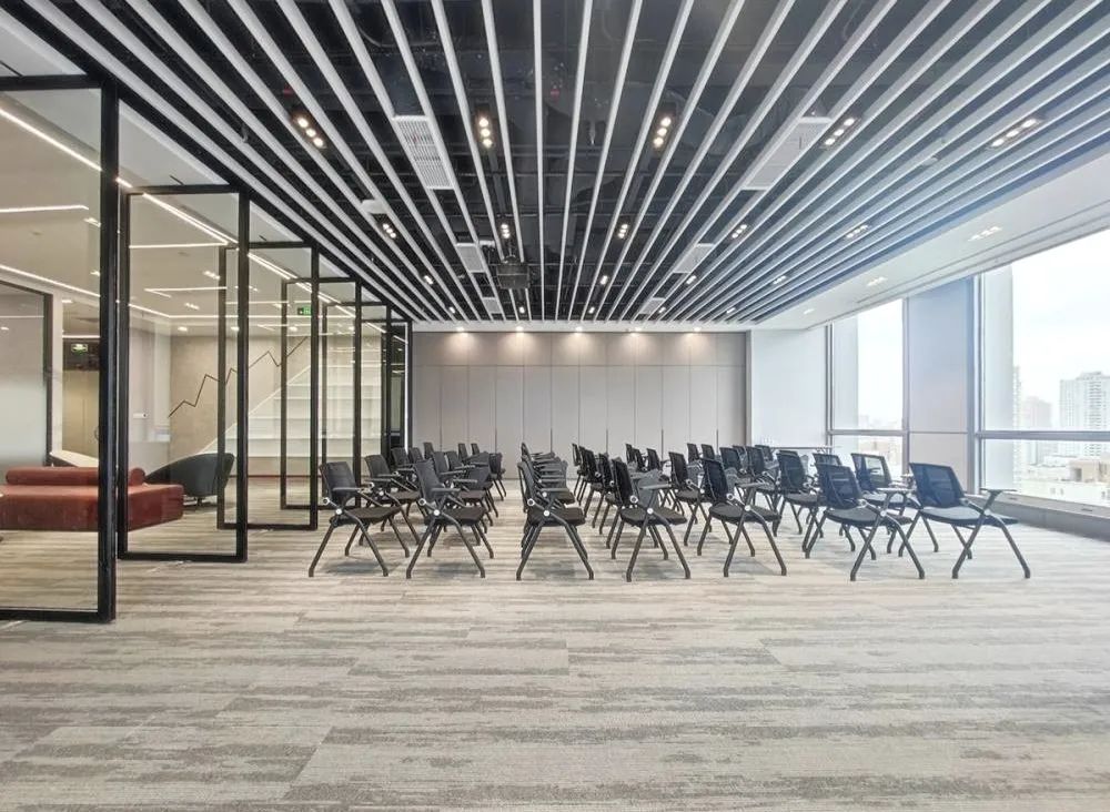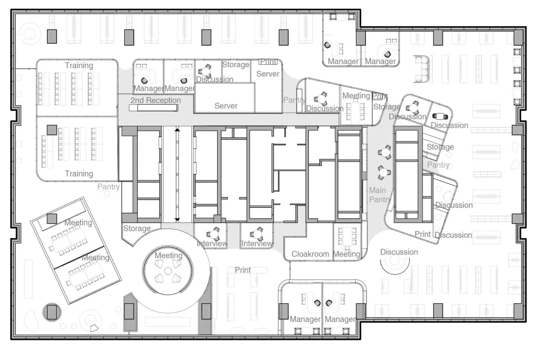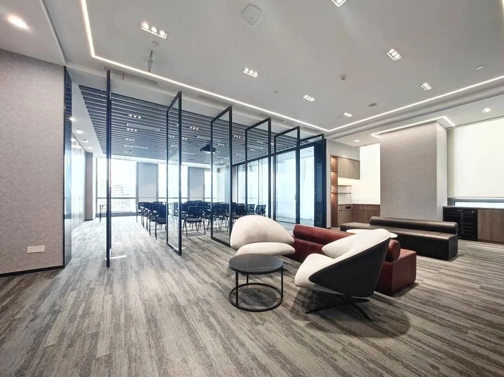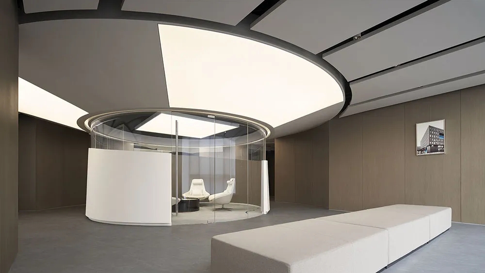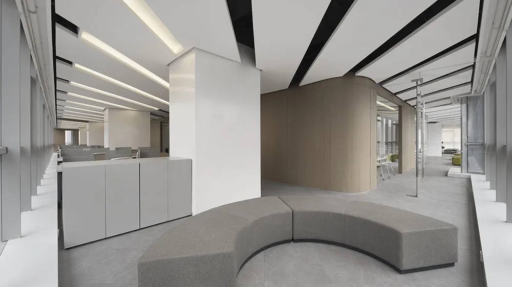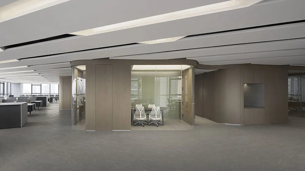 沿着开放办公区域,均匀的布置了讨论区域,打印区域,以及小型的茶水间。设计了双层天花并使用了隐藏灯源的柔性慢反射光做主照明。这个空间可由移动的隔墙的分割成为两个较小的会议室。在大会议室外的区域可以用作会议或培训开始前的等待区域。