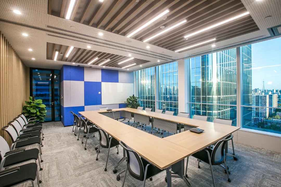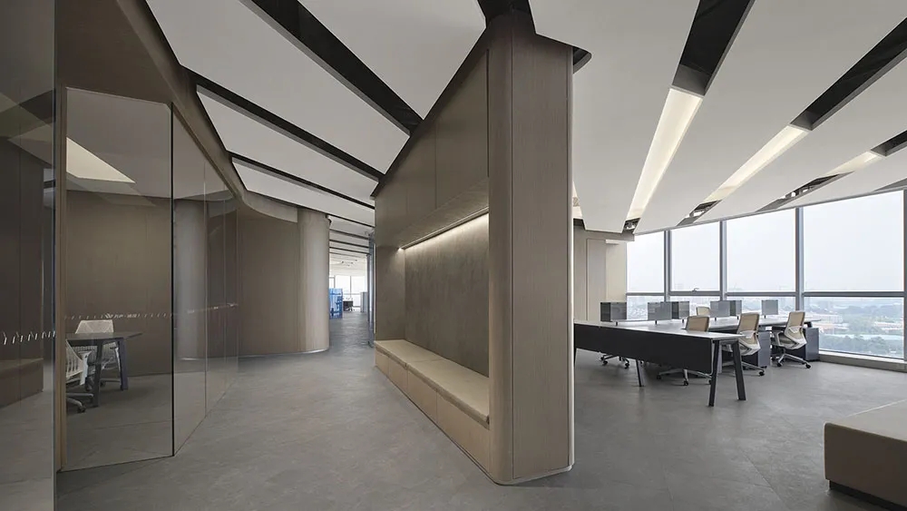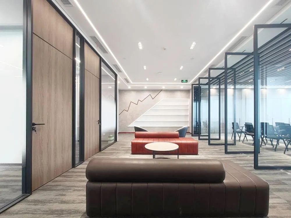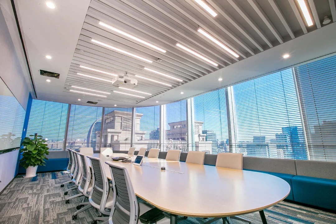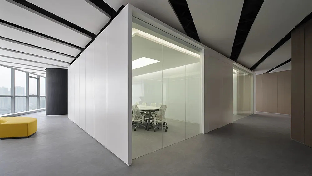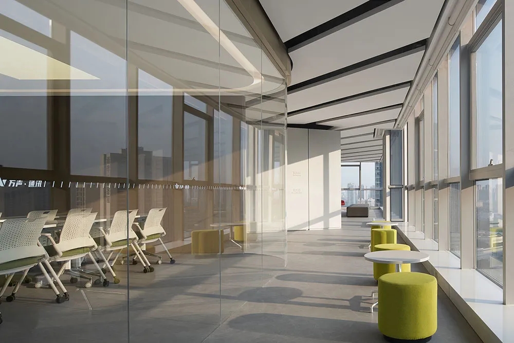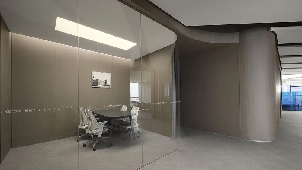 沿着开放办公区域,均匀的布置了讨论区域,打印区域,以及小型的茶水间。设计了双层天花并使用了隐藏灯源的柔性慢反射光做主照明。这个空间可由移动的隔墙的分割成为两个较小的会议室。在大会议室外的区域可以用作会议或培训开始前的等待区域。