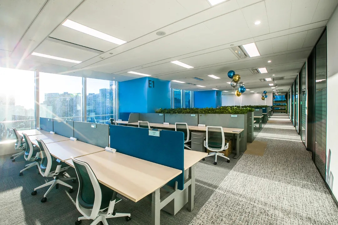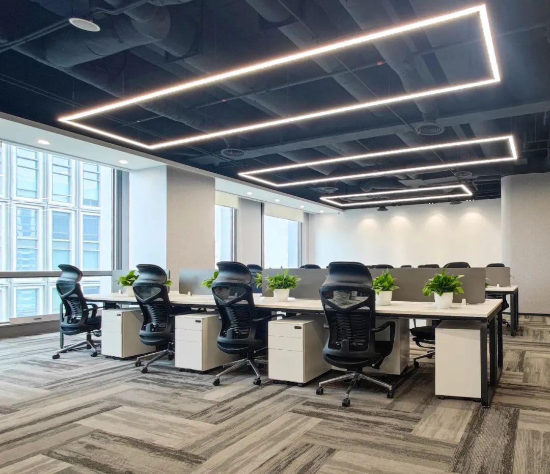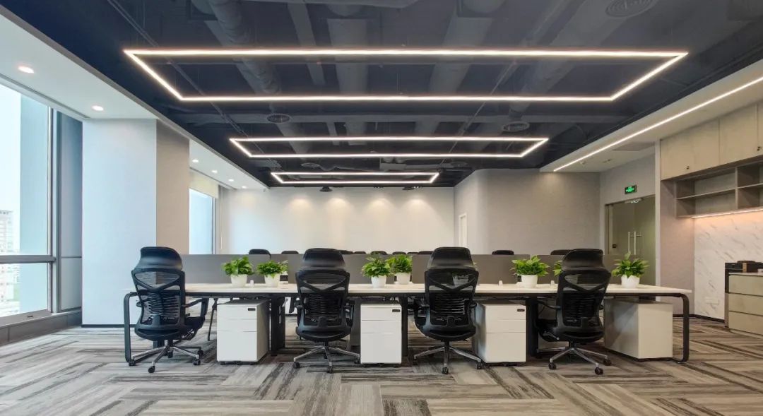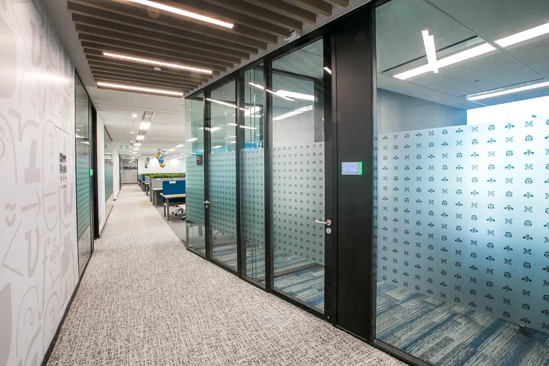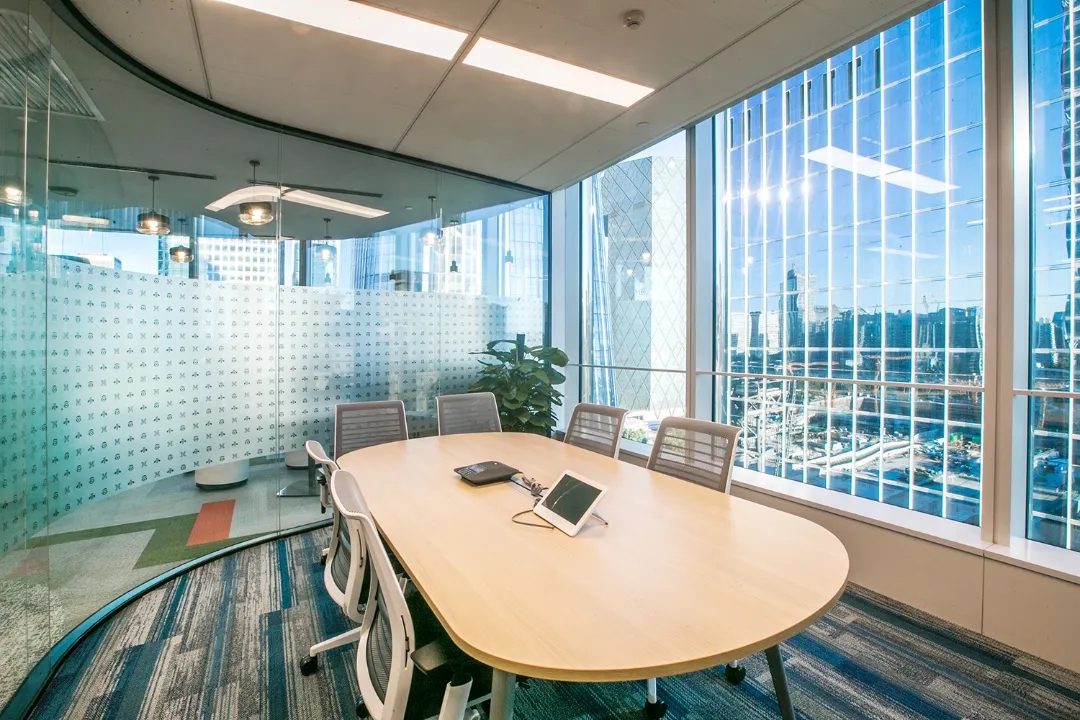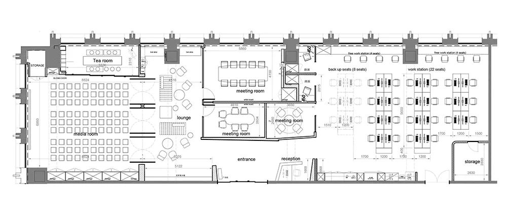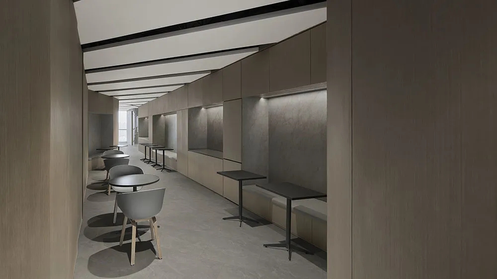 沿着开放办公区域,均匀的布置了讨论区域,打印区域,以及小型的茶水间。设计了双层天花并使用了隐藏灯源的柔性慢反射光做主照明。这个空间可由移动的隔墙的分割成为两个较小的会议室。在大会议室外的区域可以用作会议或培训开始前的等待区域。