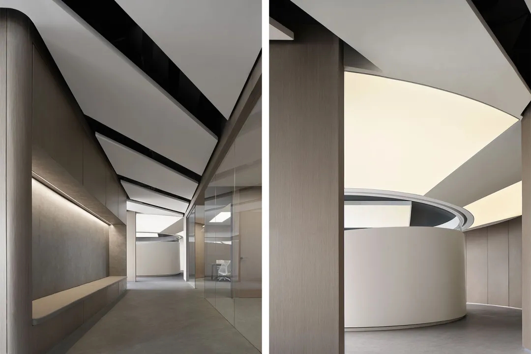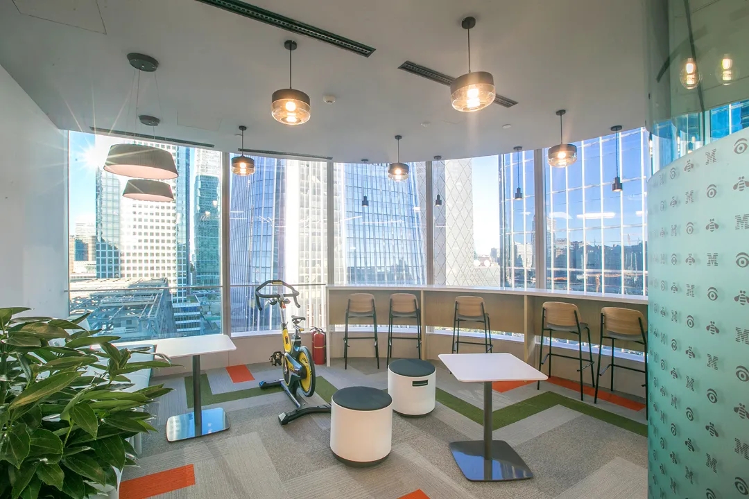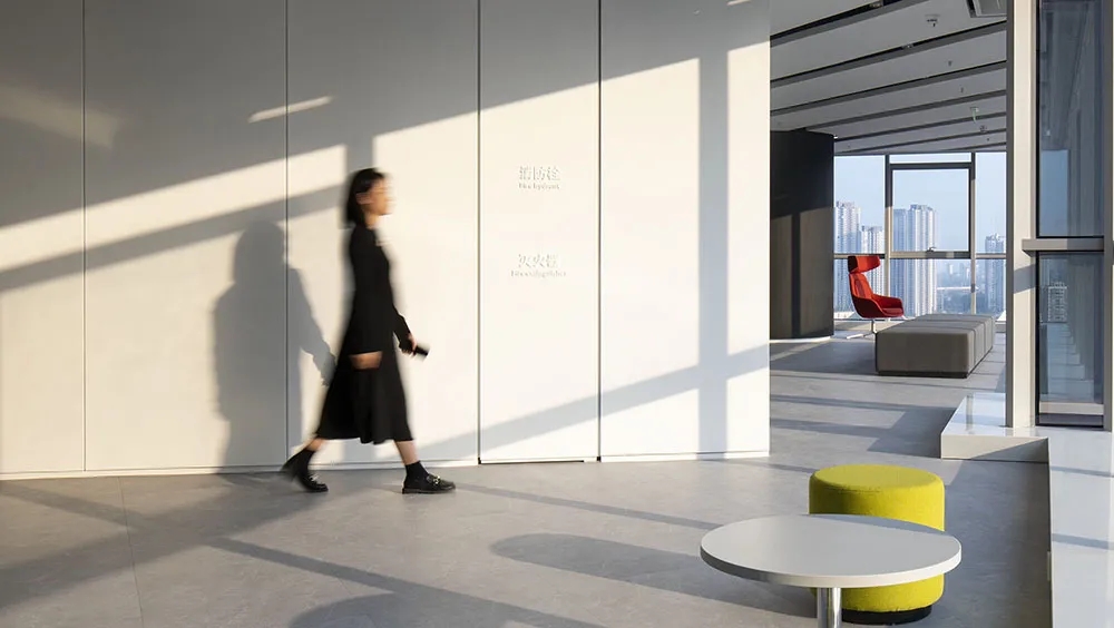将所需的功能分解成更小的尺寸,也打破房间之间的“键”以便房间不再排成一排,借用城市规划里的多中心的思想,将重复性的功能重新分配组合成中心,然后将它们散落在整个楼层, 励员工间的互动。这样一来,当员工在空间中移动时,他要么沐浴在阳光下或是期待在尽头阳光。最重要的是,无论在哪个角落,员工总是与城市、季节和时间联系在一起。