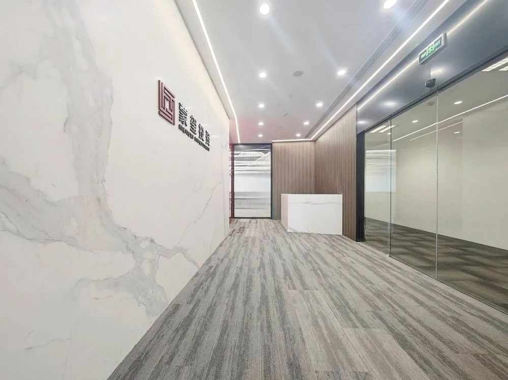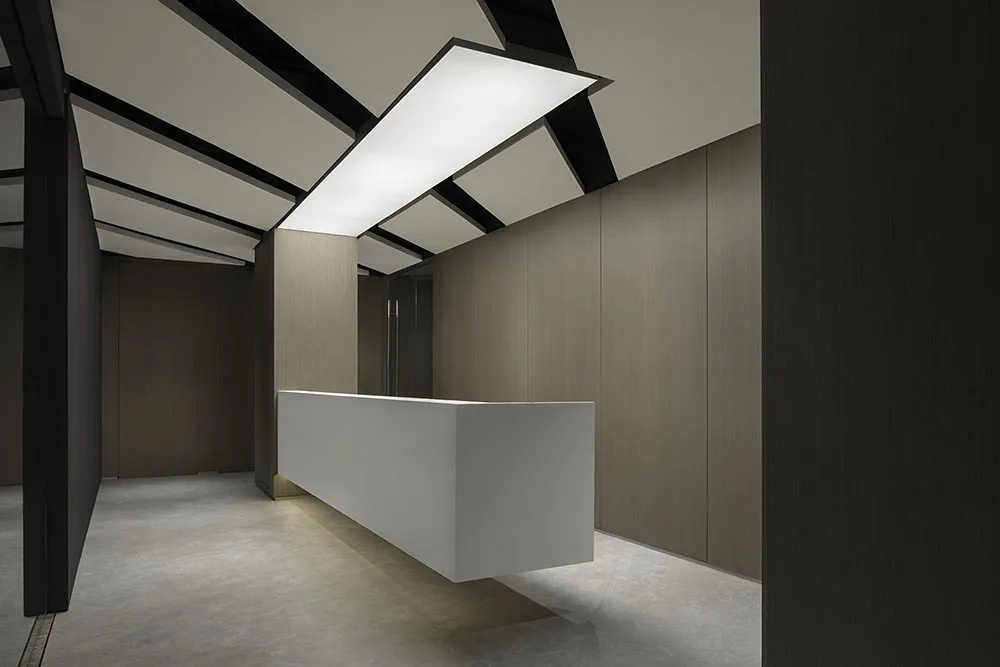 两个进入空间的入口,以分散不同的人群,如客户、员工、实习生和其子公司的访客。在供子公司用的第二入口,我们设计了一个超过4米的浮动接待台。电梯大厅的另一端是办公室的主入口。我们在那里放置了一个封闭的贵宾室,一方面确保不会望穿开放空间,另一方面,它可以分开来开会的访客与员工。