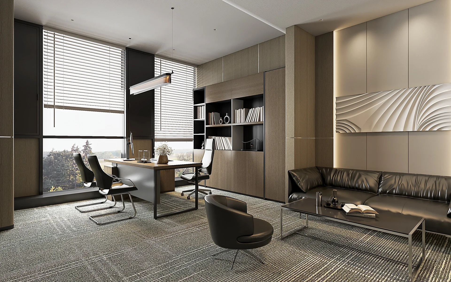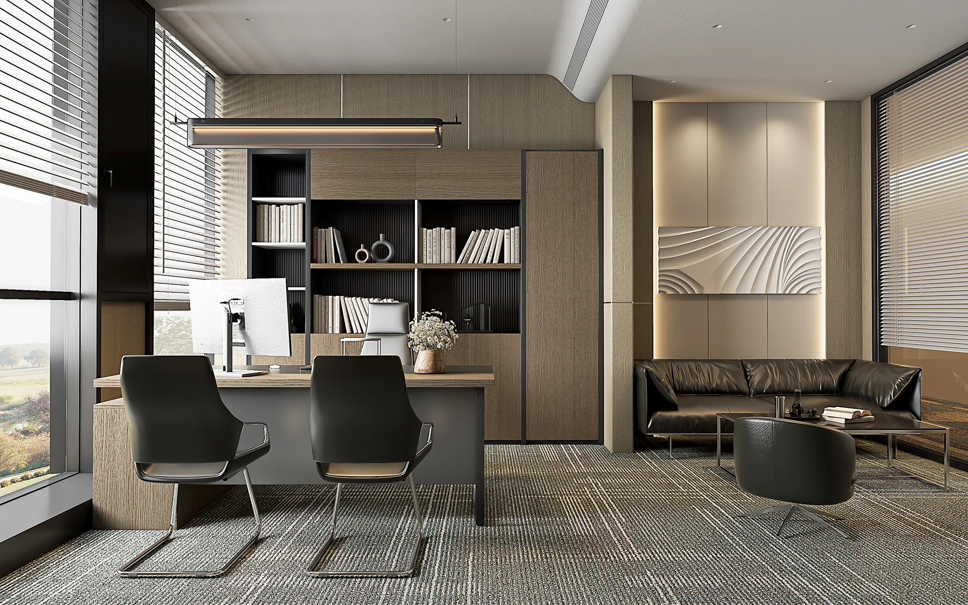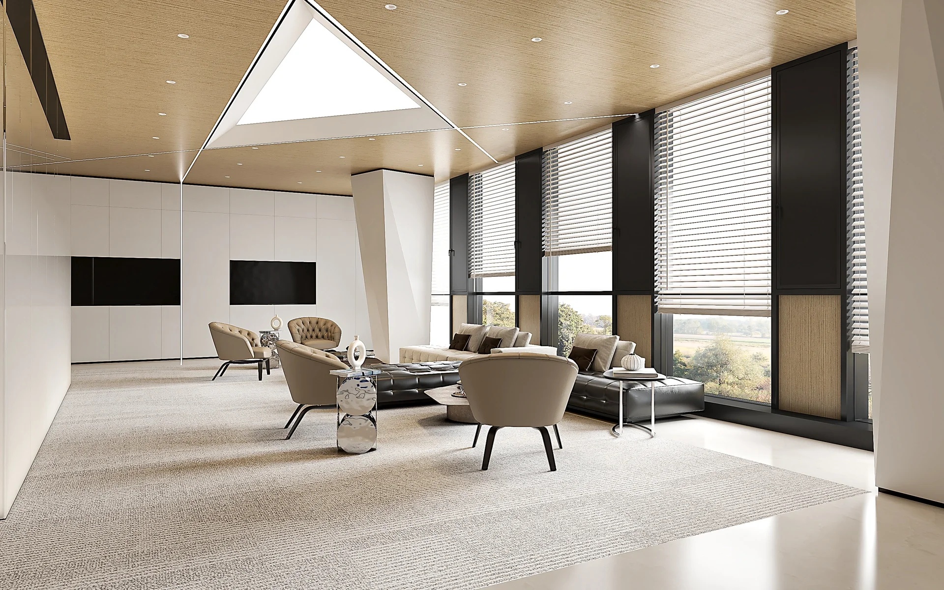 总裁办公室简约而不失精致,于细节中彰显品味与身份。设计延续整体格调量身定制了一个兼具收纳、环保、审美的大面积墙体书柜,突出明与暗、凹与凸的对比,流露优雅大方的气质。