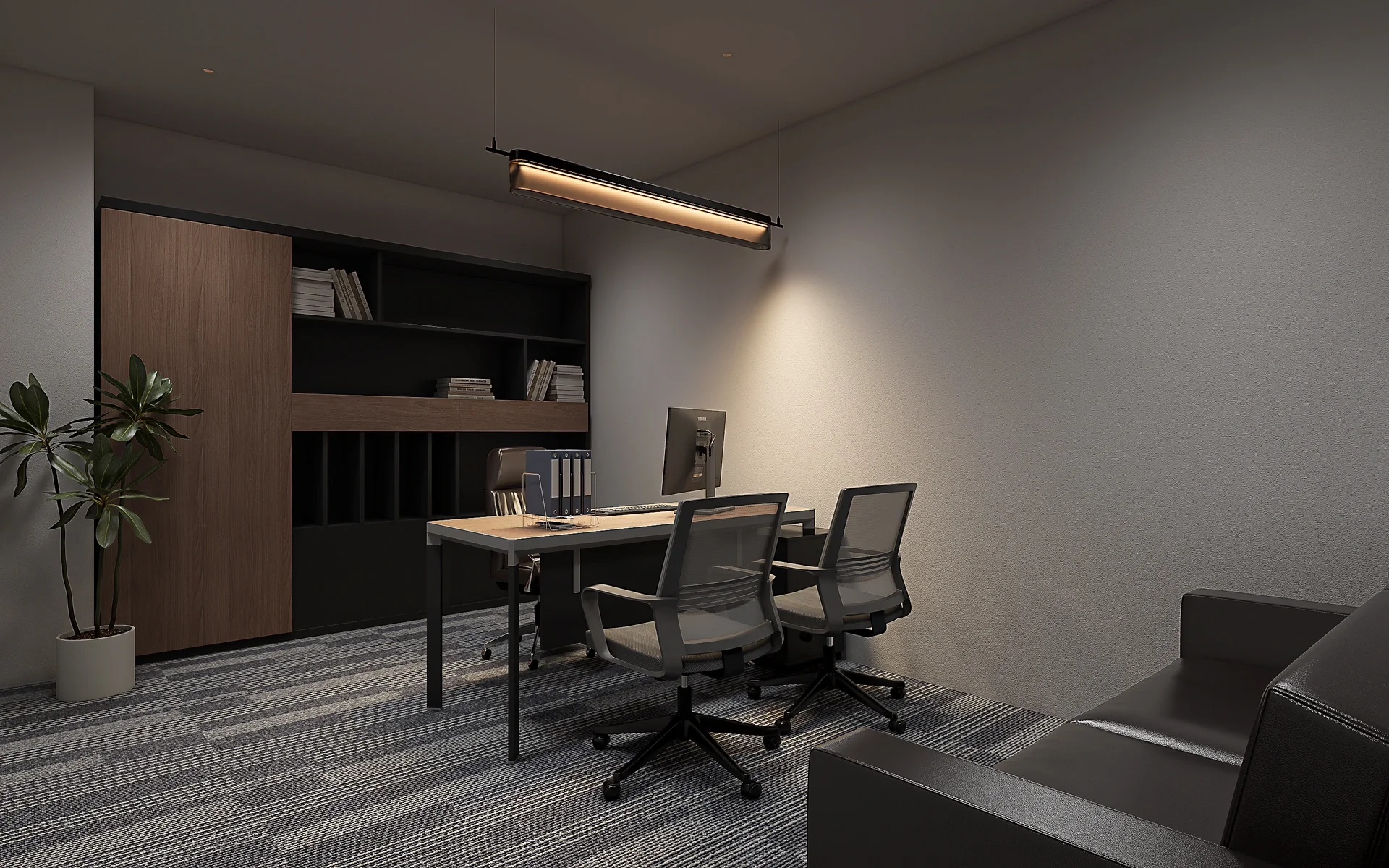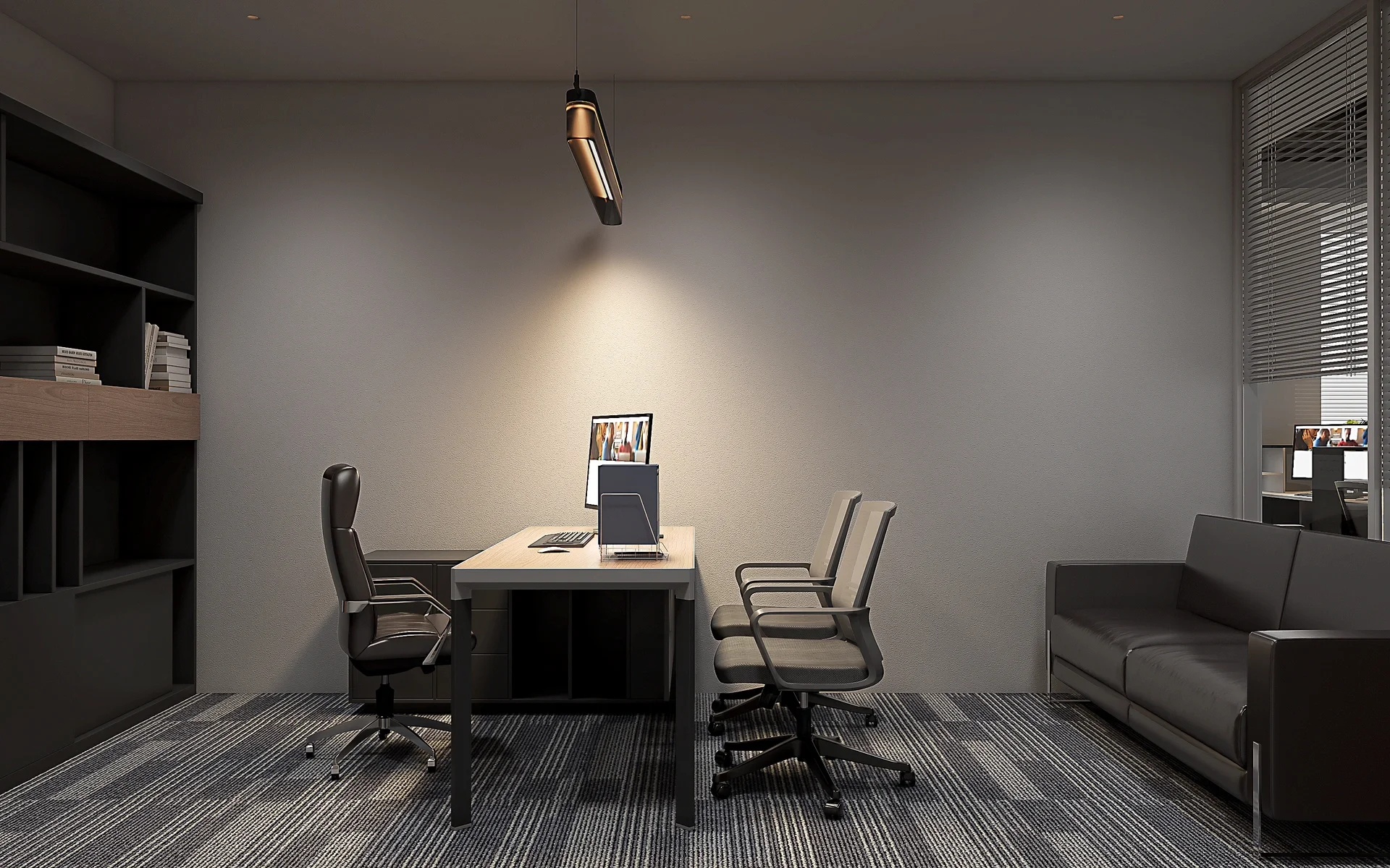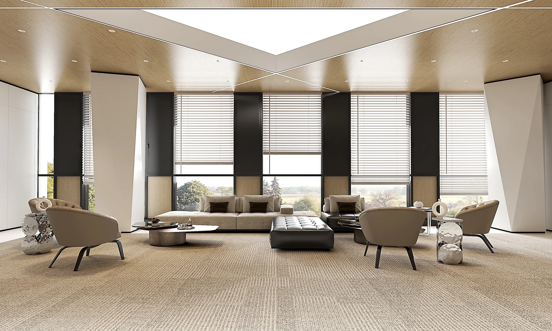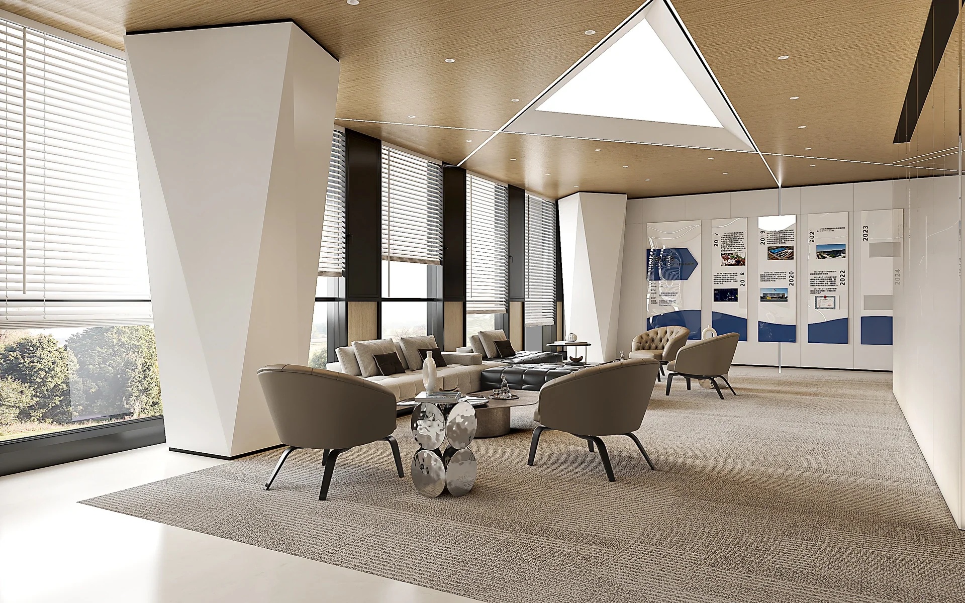 总裁办公室简约而不失精致,于细节中彰显品味与身份。设计延续整体格调量身定制了一个兼具收纳、环保、审美的大面积墙体书柜,突出明与暗、凹与凸的对比,流露优雅大方的气质。