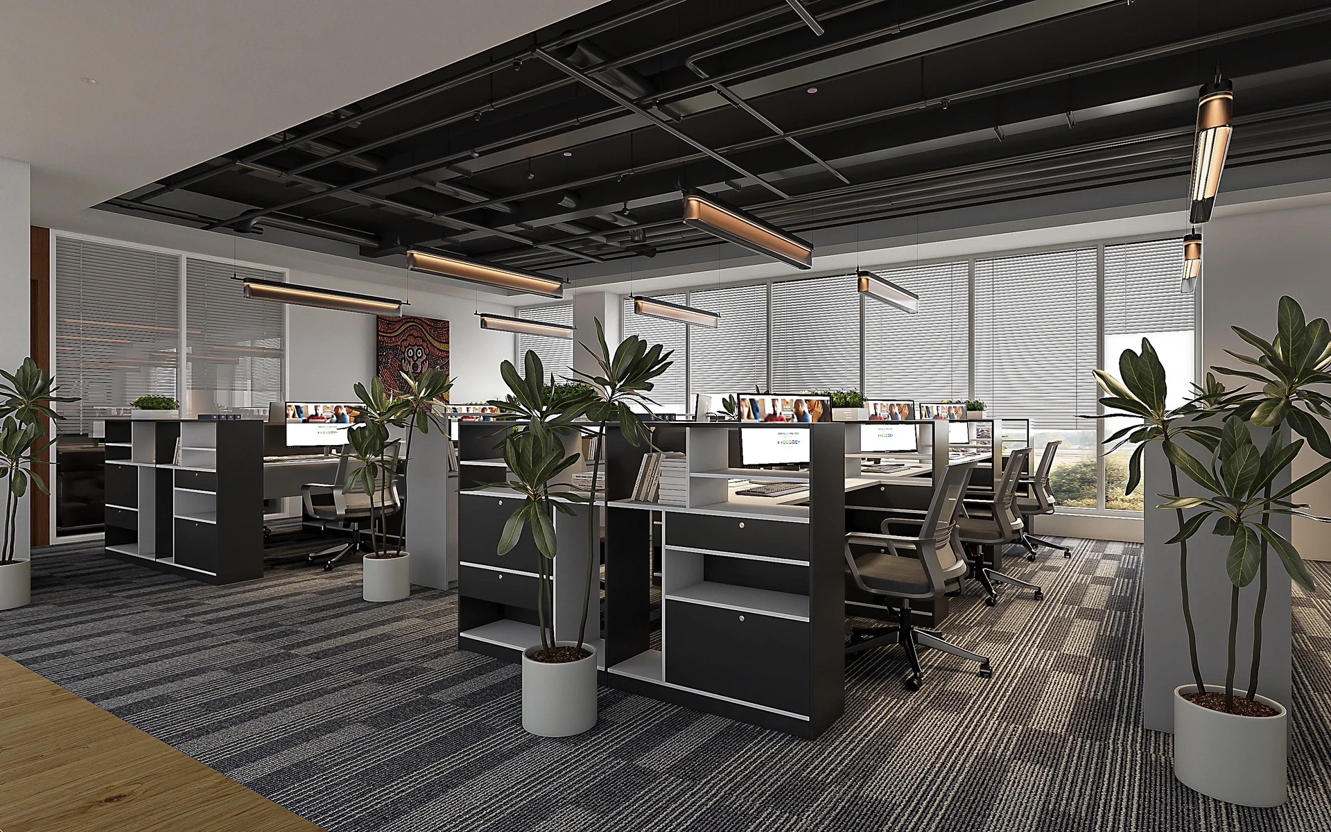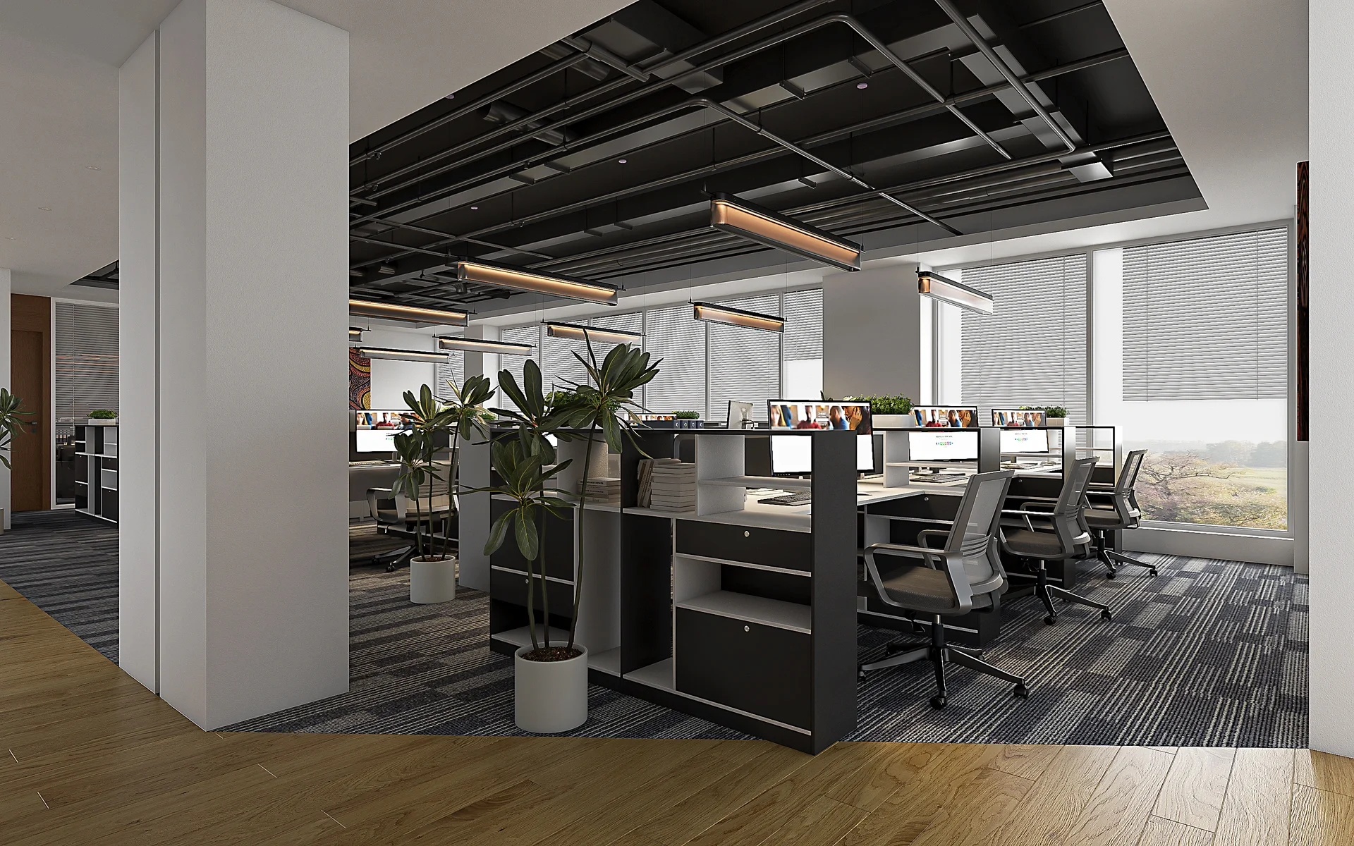 圆形装置是办公室的共享区,承载着沟通、探讨与观念的碰撞。垂直面上的大圆形,在平面上则是一个长的椭圆,拥有最好的景观面。设计师将它与游艇的形式结合,打造奢适的高端商务氛围。它的正面角度仿佛一个舵机,在空间中昭示企业发展的方向感。而自然变化中天光的加持,又让这一路发展呈现最美的景致。员工区呈现开放交流的状态,与共享区保有视觉上的联系,阳光毫无阻碍的洒入,给日常工作提供一个充满活力的氛围,便于员工间的密切合作,最大化地强调效率和健康。