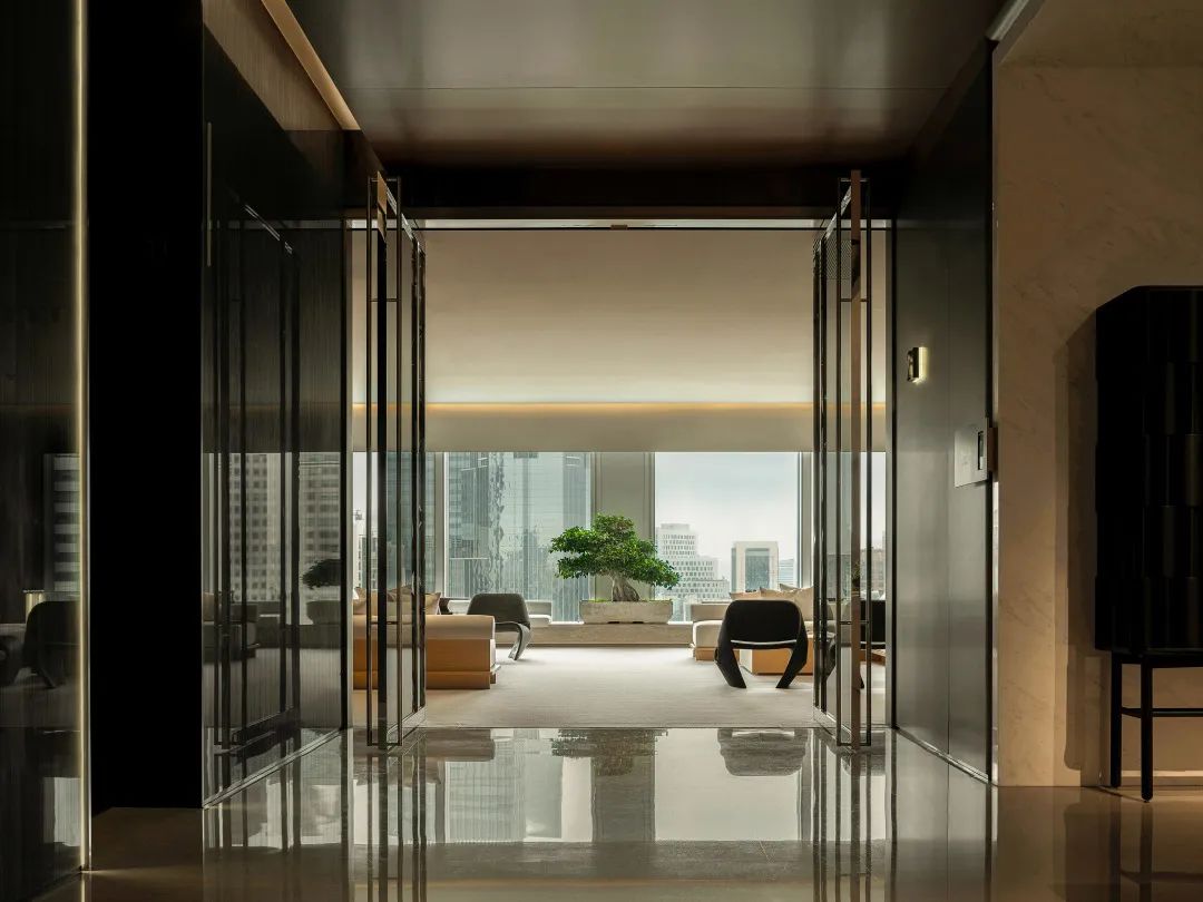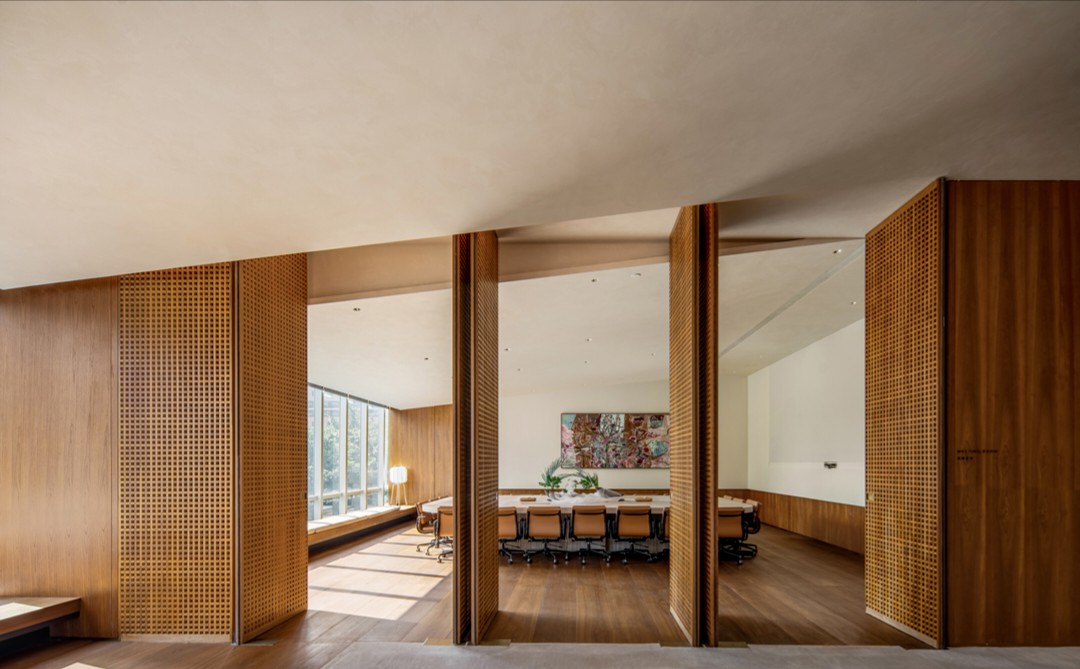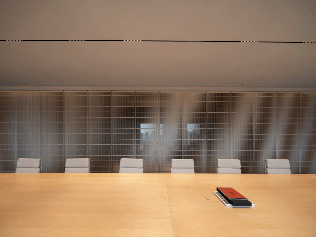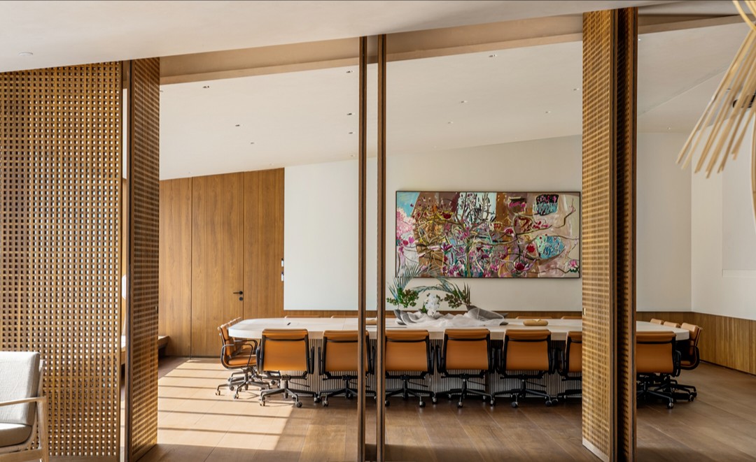会议室全部采用透明玻璃隔断,阳光透过南侧玻璃照进走廊。