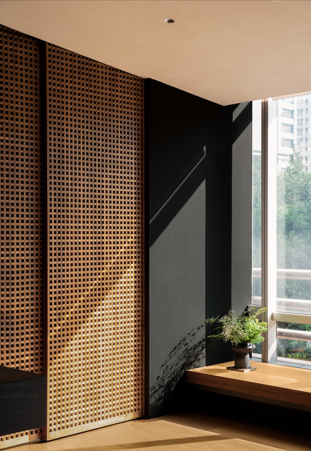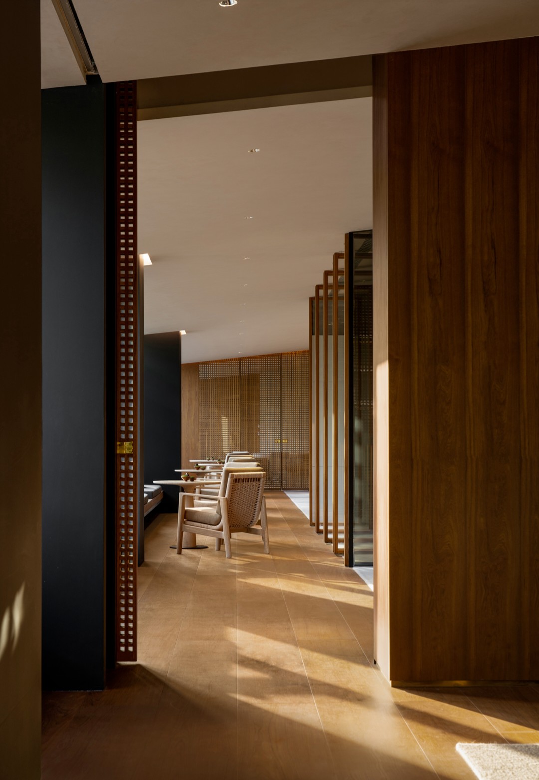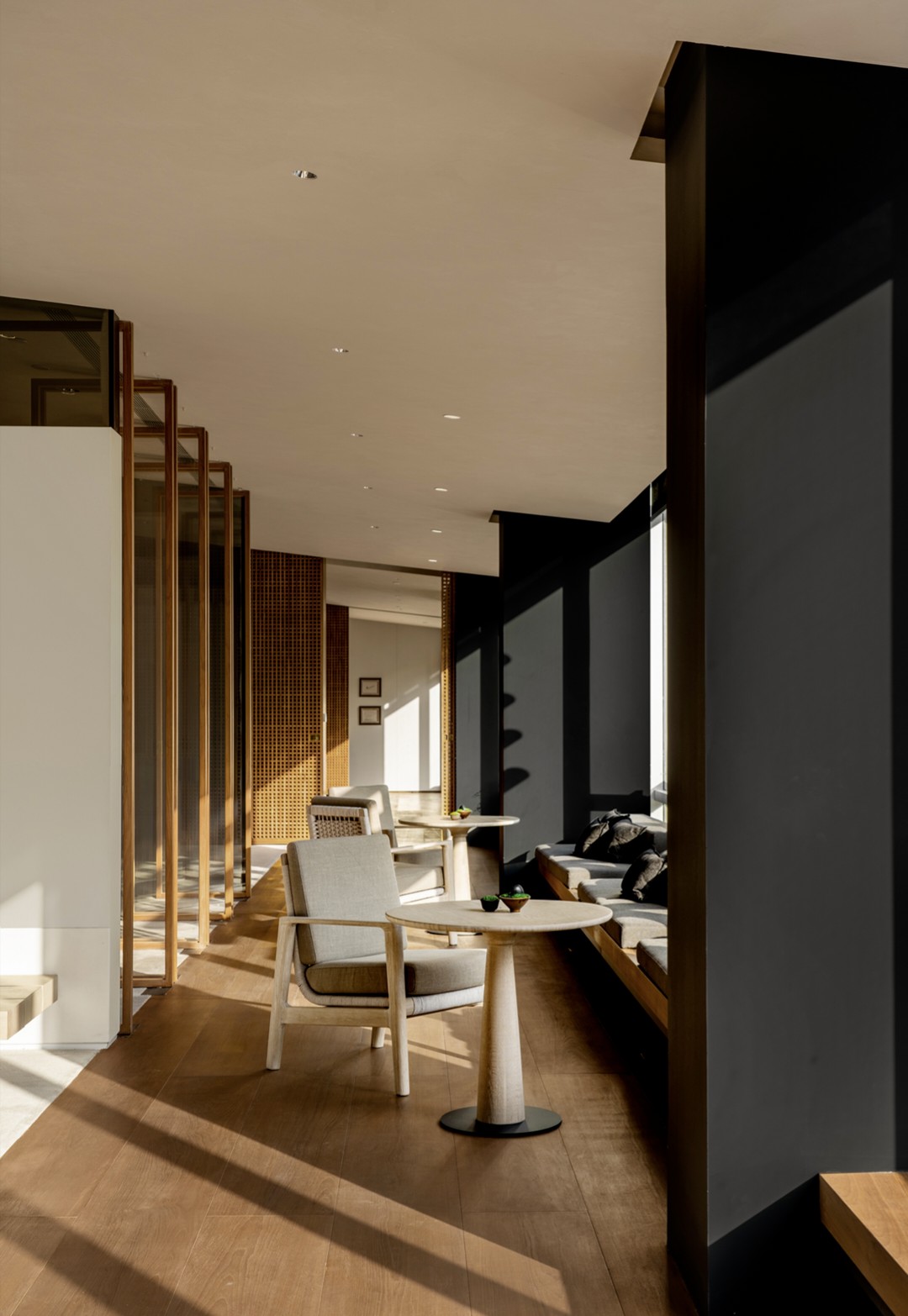 会议室全部采用透明玻璃隔断,阳光透过南侧玻璃照进走廊。