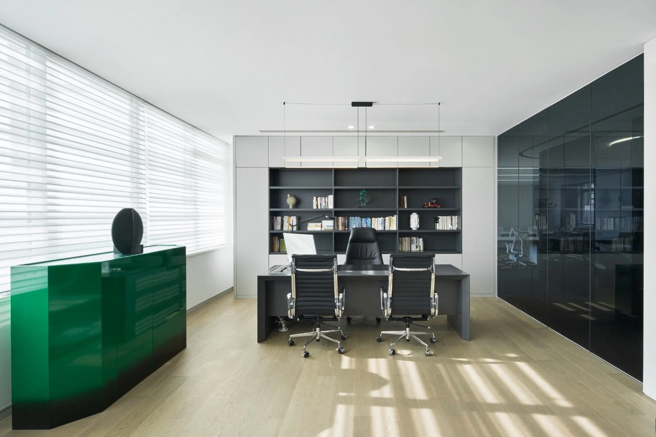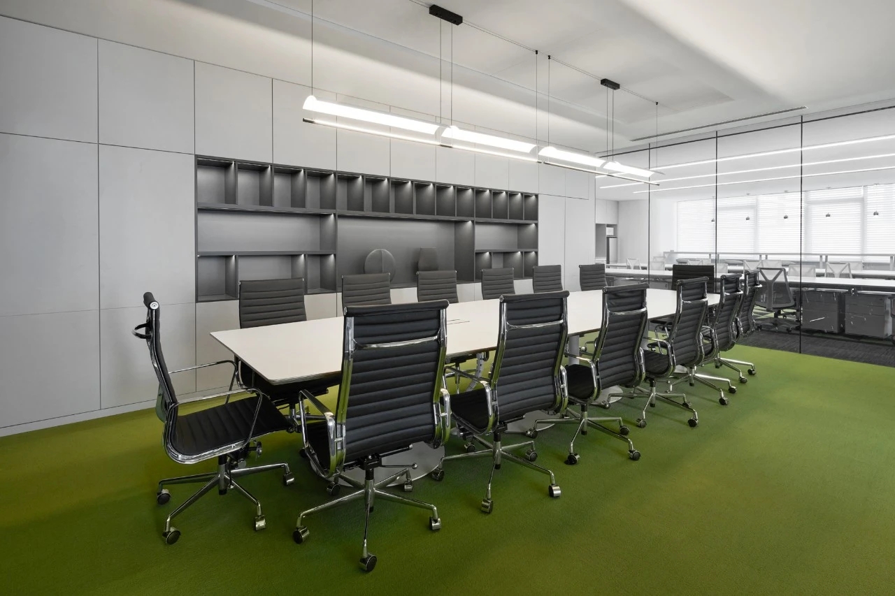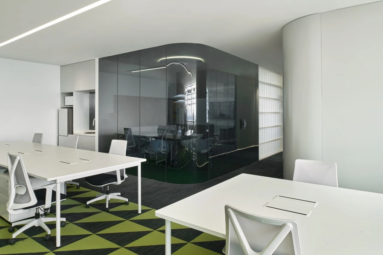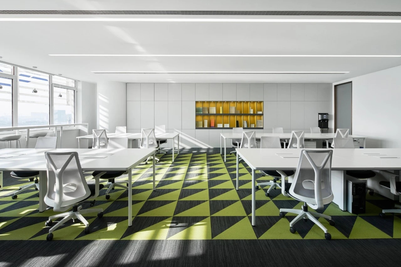 入口绿色背景墙,表达企业代理建材品牌的环保理念。黑绿相间的拼花地毯衬托白色桌椅,传递轻盈愉快的空间情绪。