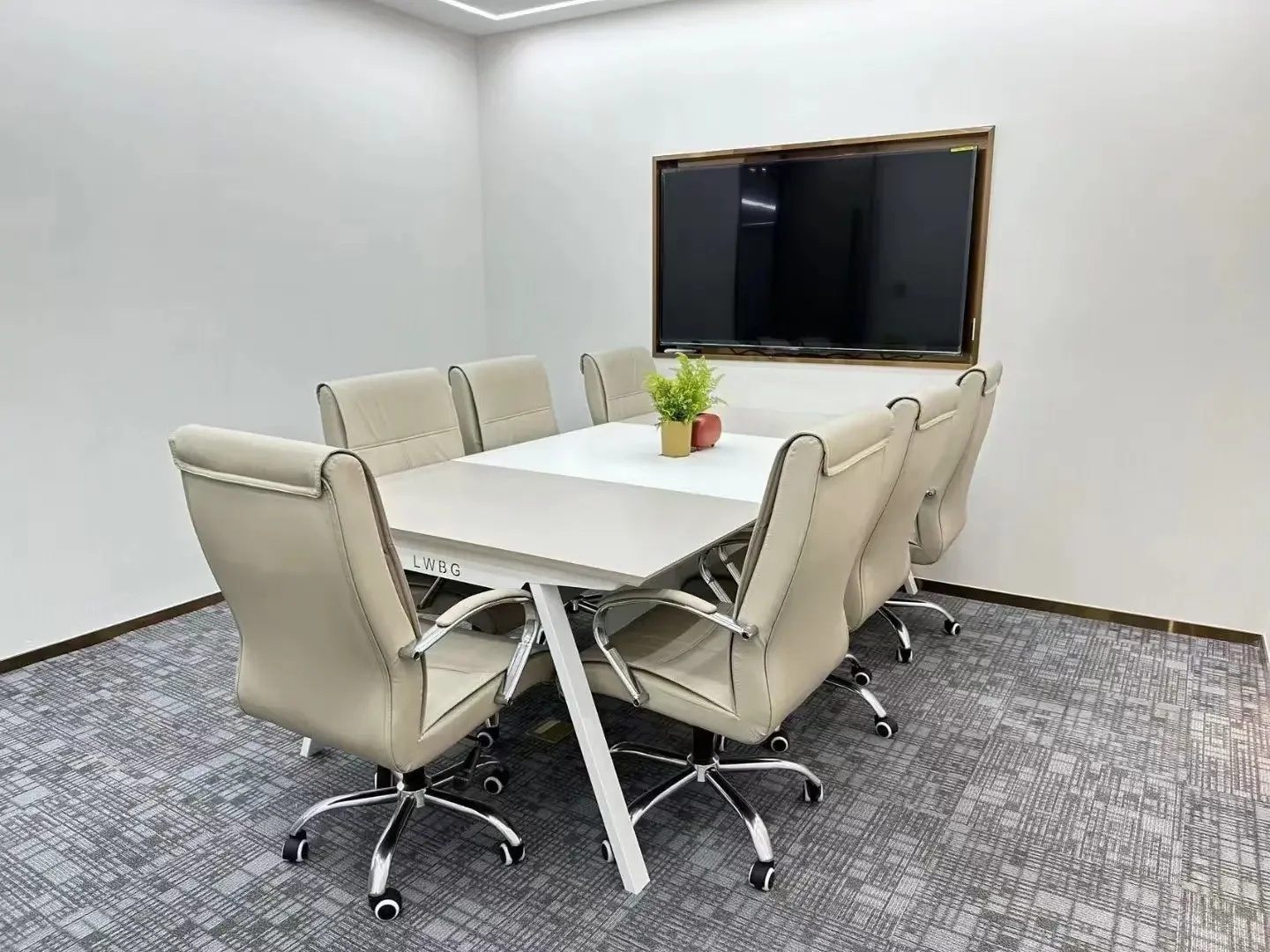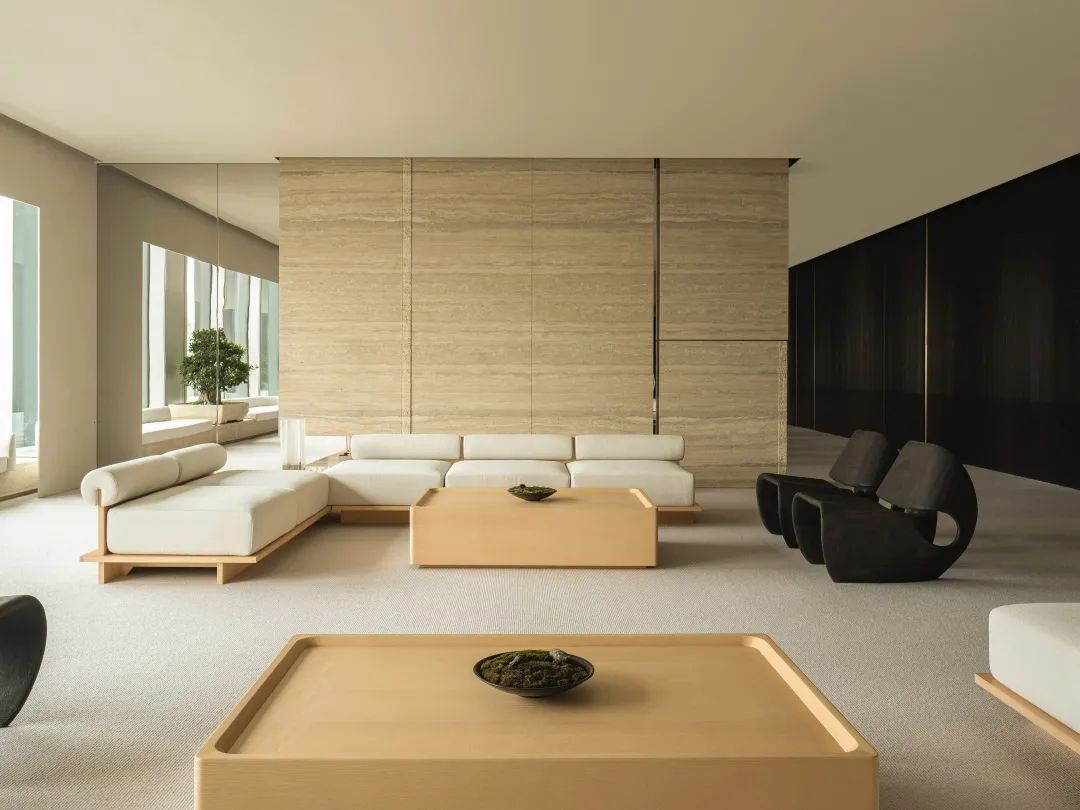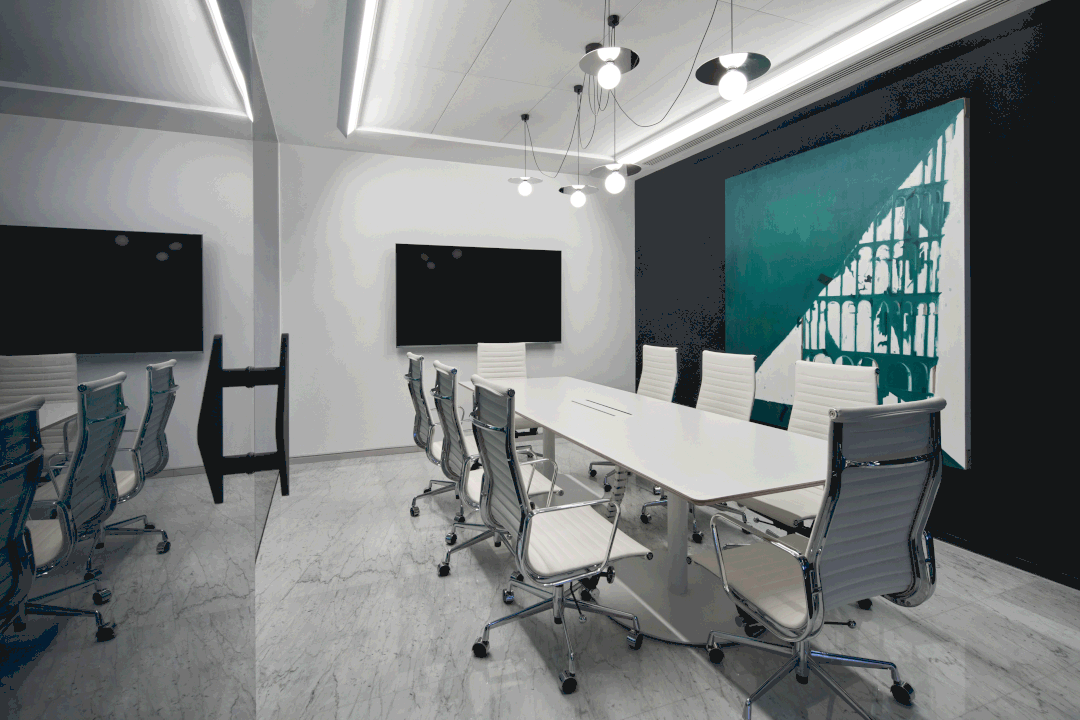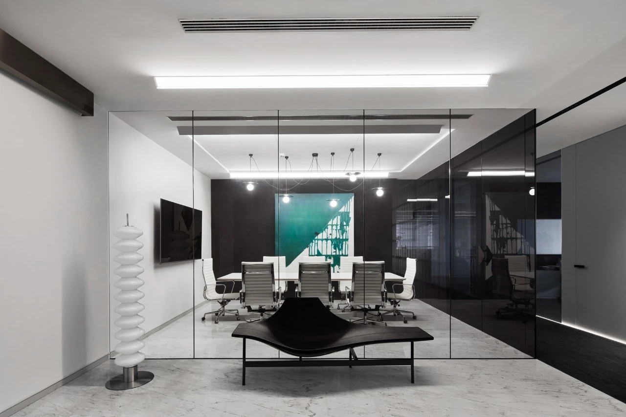 入口绿色背景墙,表达企业代理建材品牌的环保理念。黑绿相间的拼花地毯衬托白色桌椅,传递轻盈愉快的空间情绪。