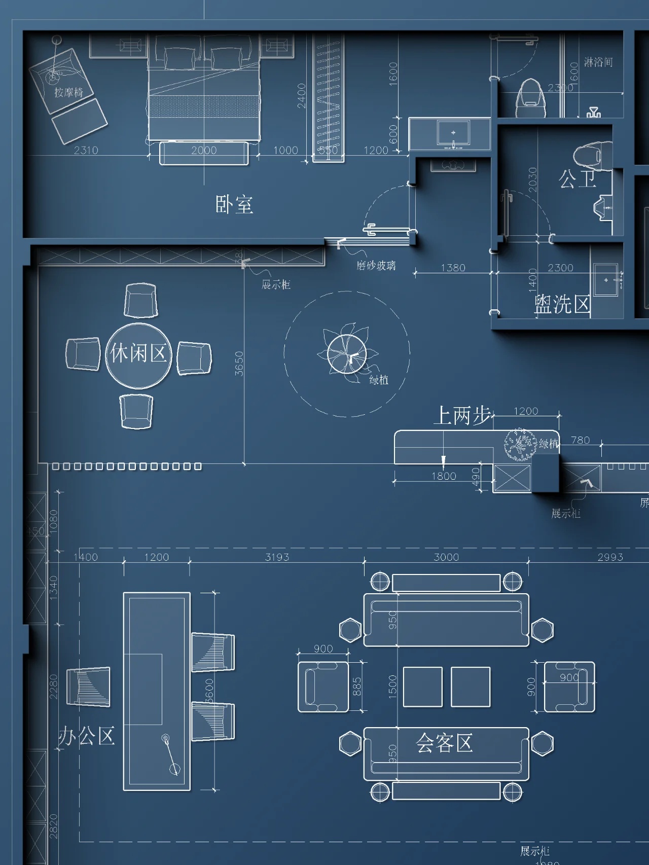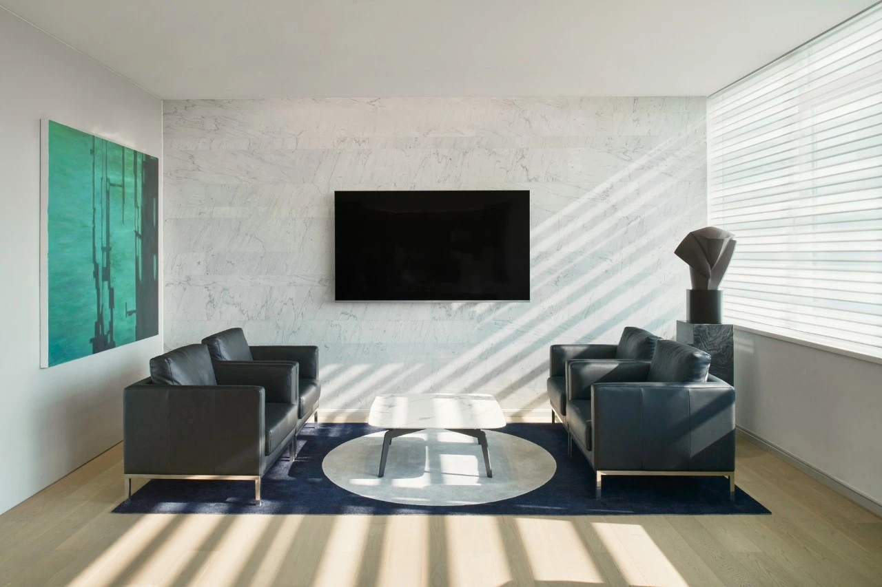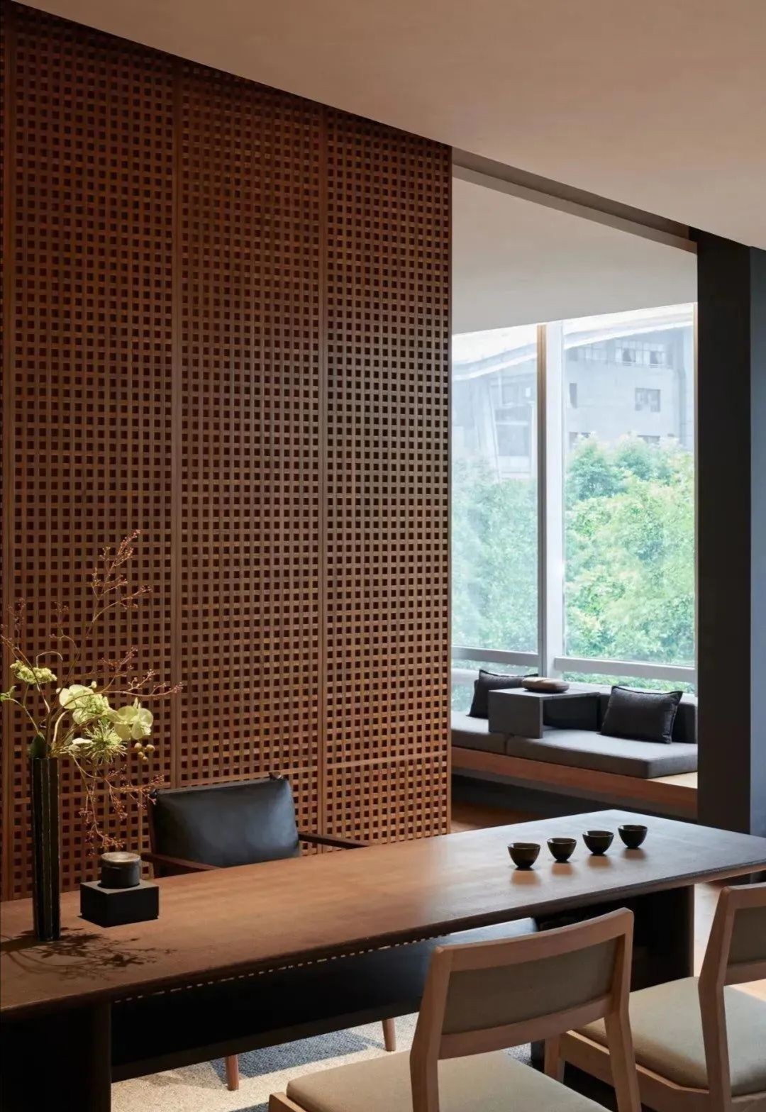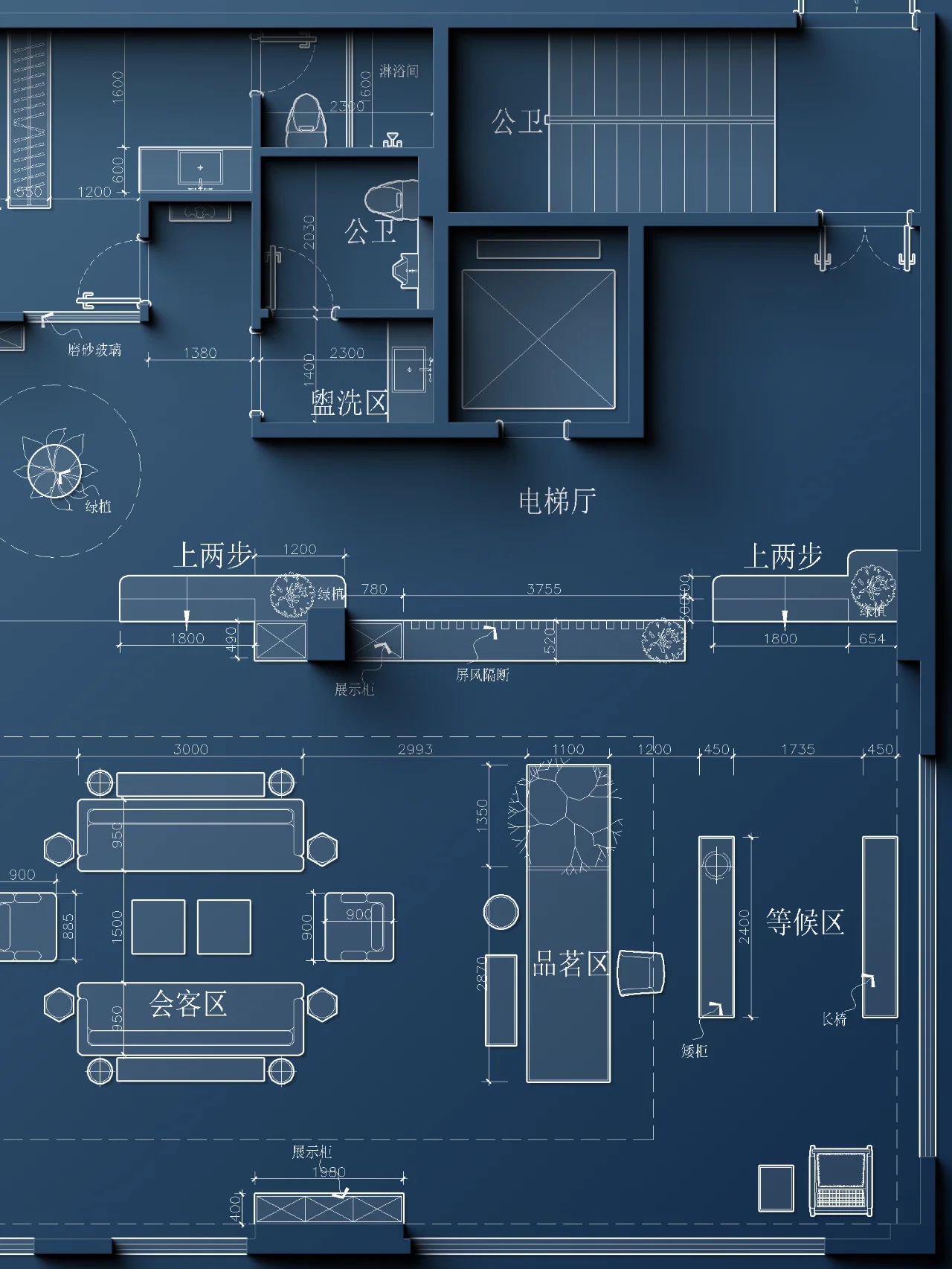 入口绿色背景墙,表达企业代理建材品牌的环保理念。黑绿相间的拼花地毯衬托白色桌椅,传递轻盈愉快的空间情绪。