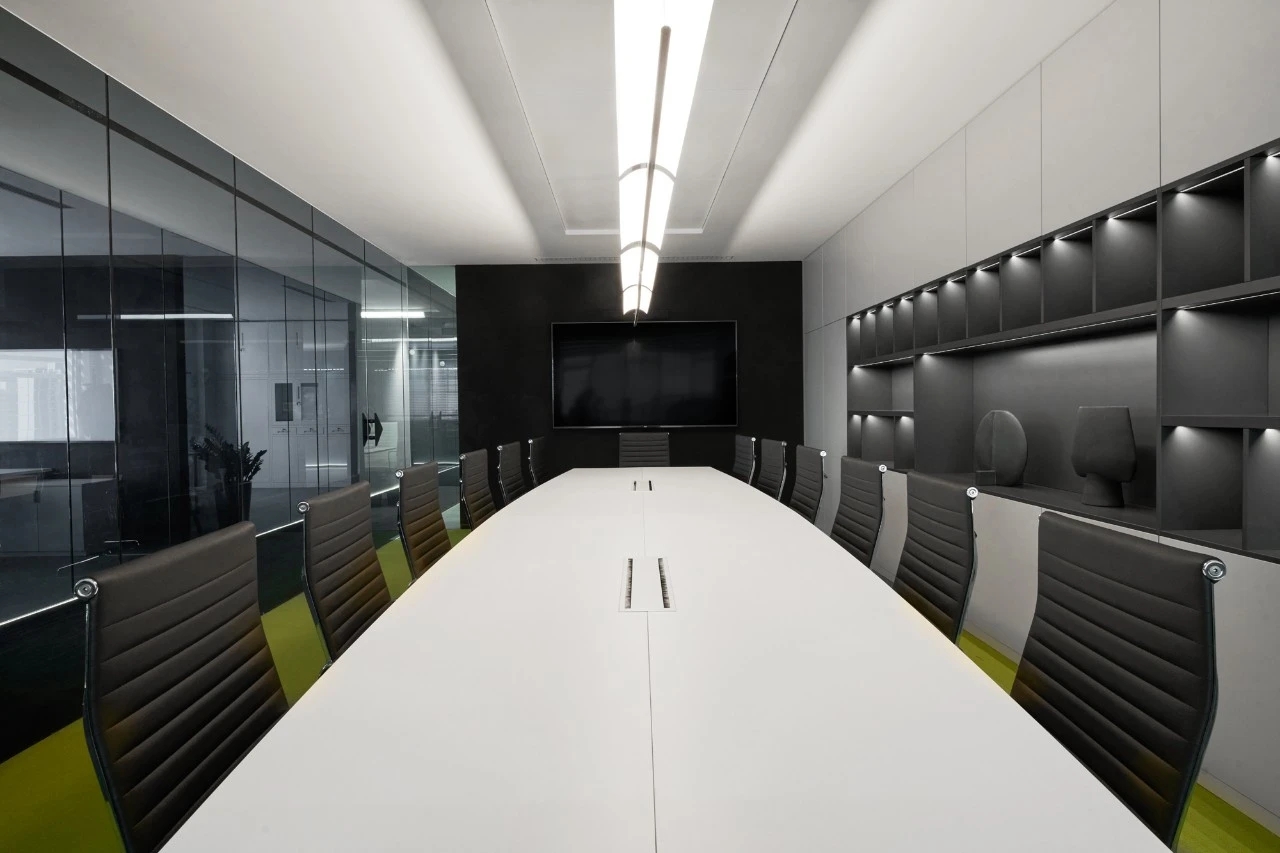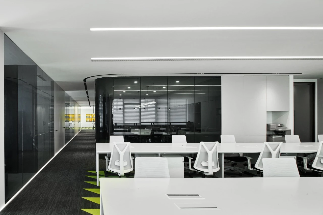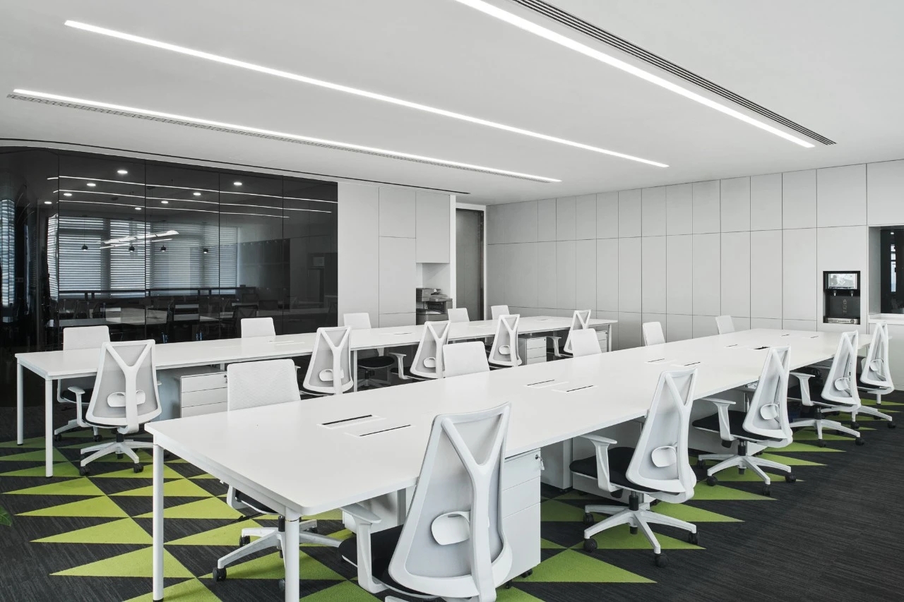 办公区采用隐缝吸音岩棉板吊顶,令员工安静舒适。储物柜妥善安置产品资料、个人物品,让职场干净整洁。
