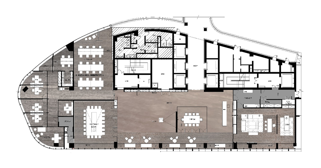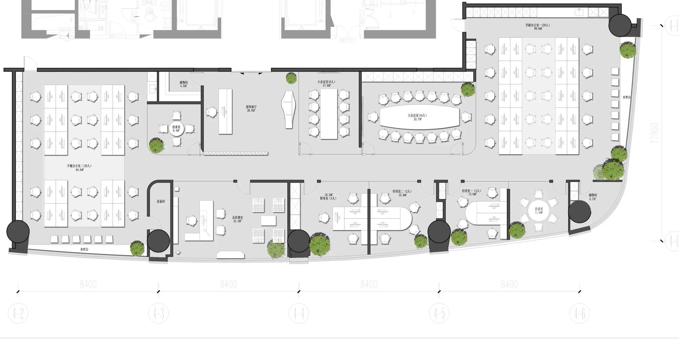 三明治布局的平面,左右四个市场部门,中间是管理层和会议区。