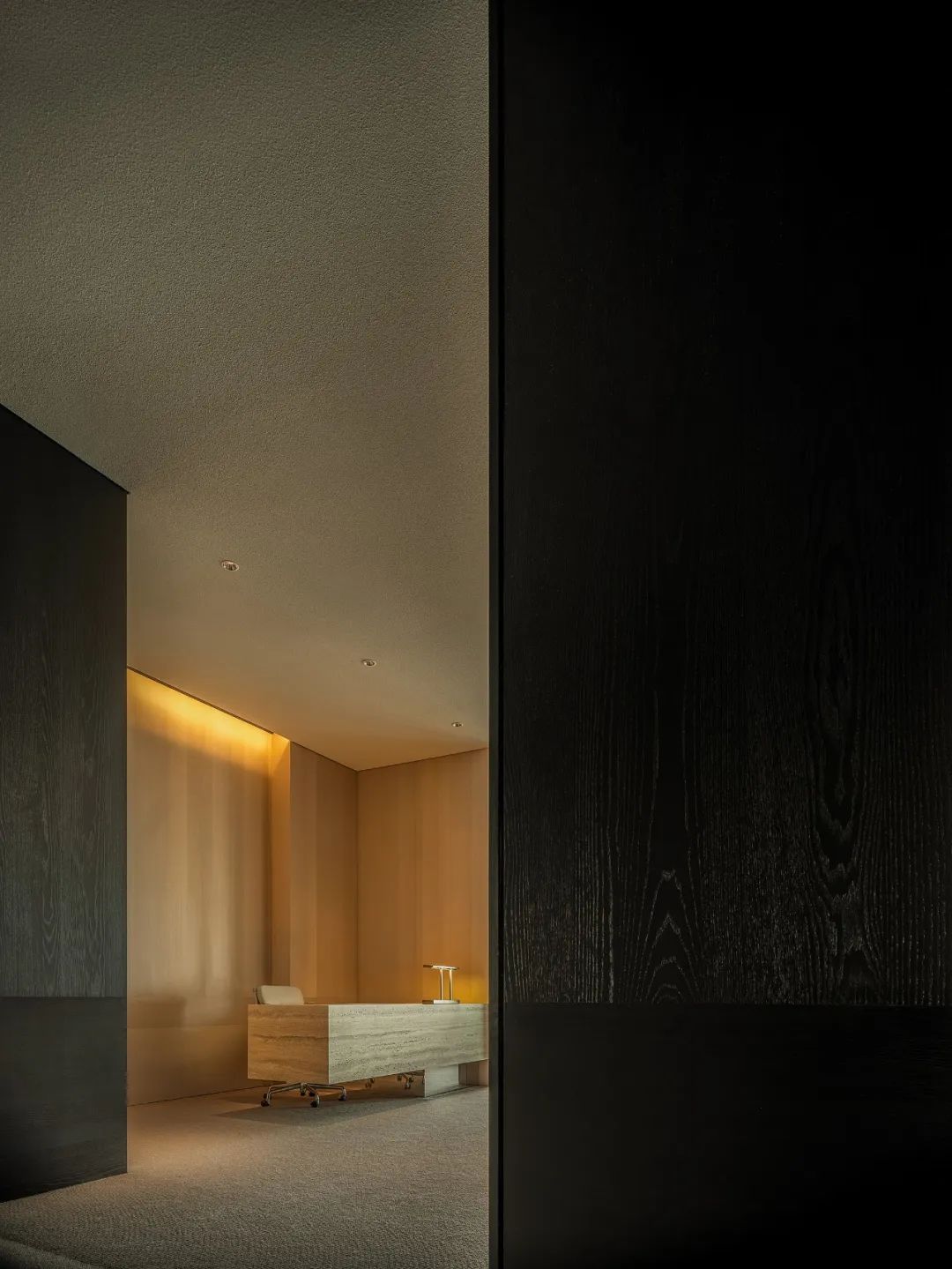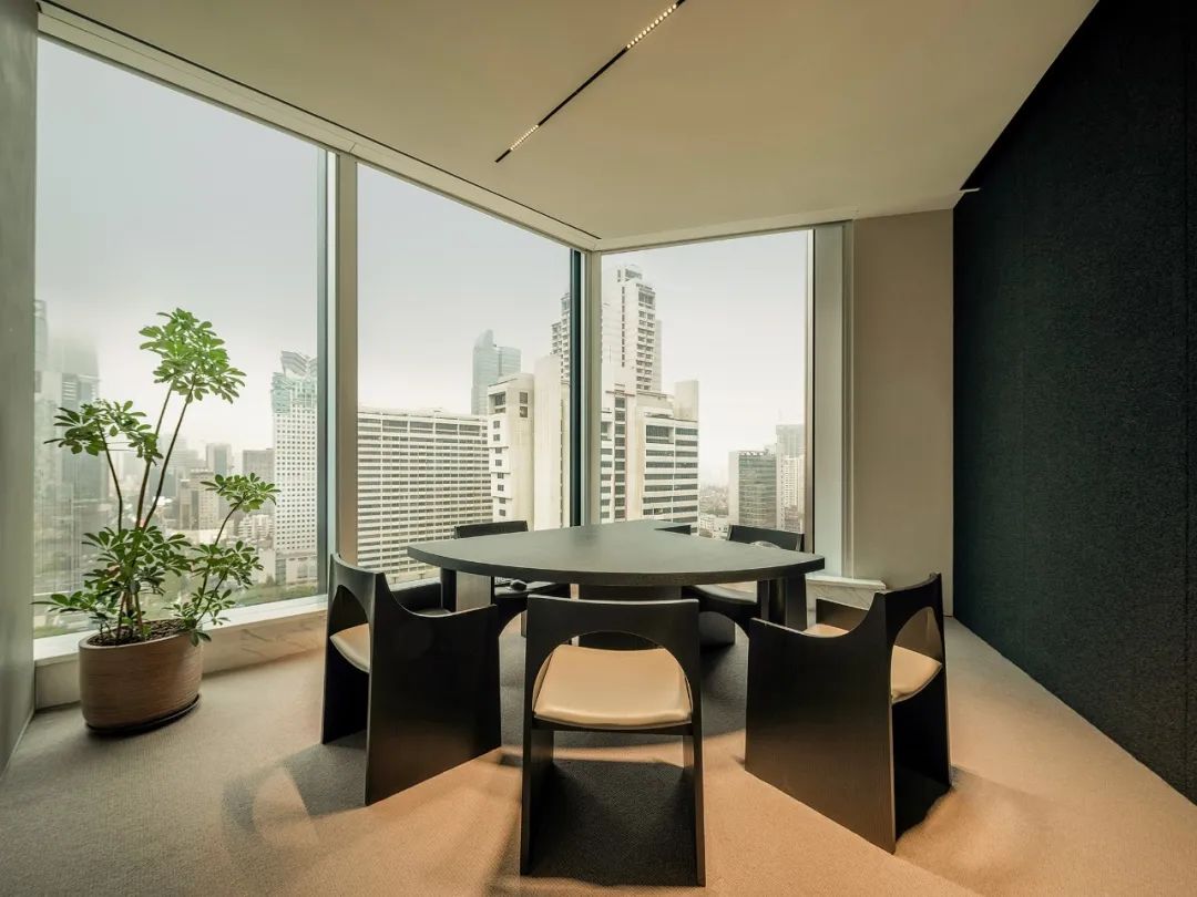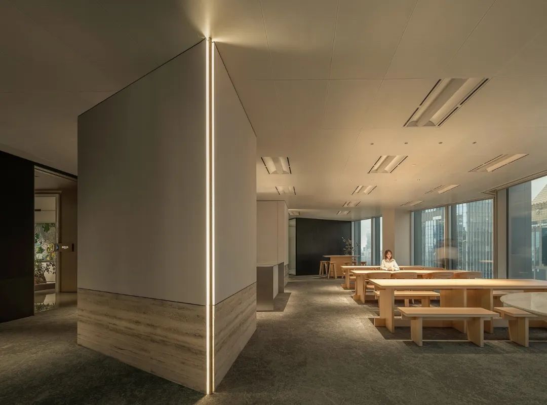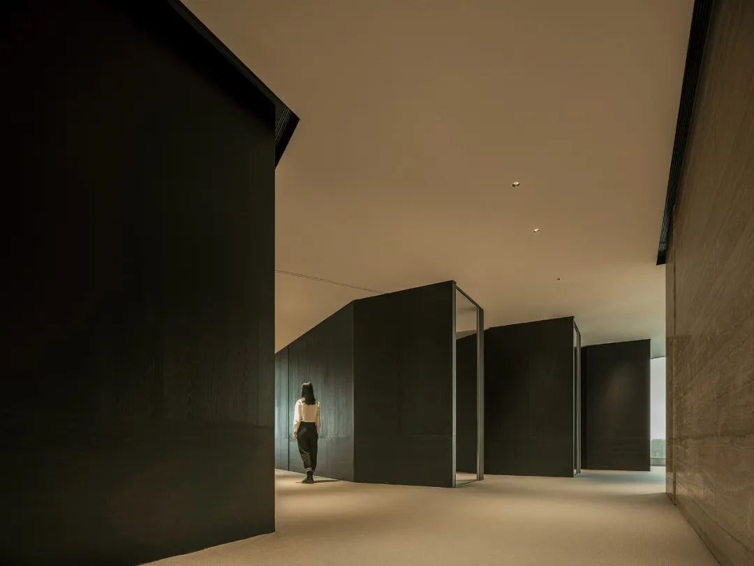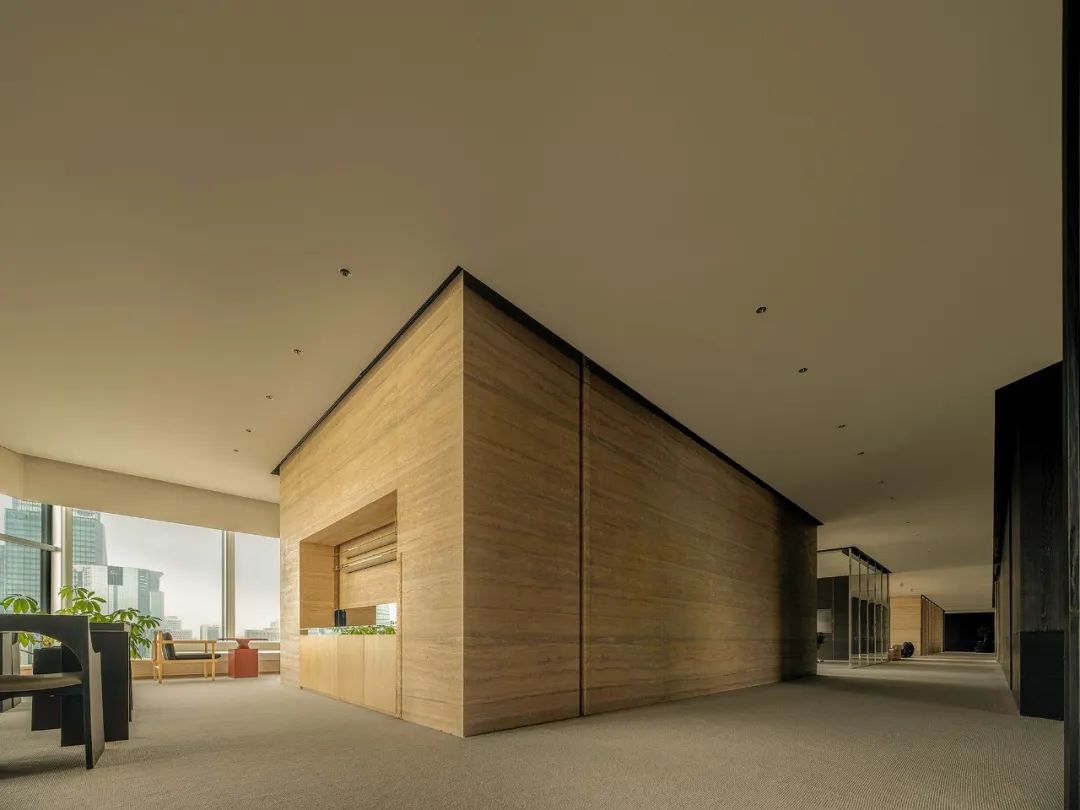 自由办公区运用黑色橡木作为基底,宽旷深邃,静默有力。办公区往内收合的“抑”,与接待区向外海纳的“扬”,形成反差,创造了不同情境下的转场体验。开与合的对比,抑与扬的反差,藏与露的统一,创造出静谧与光明的转场。