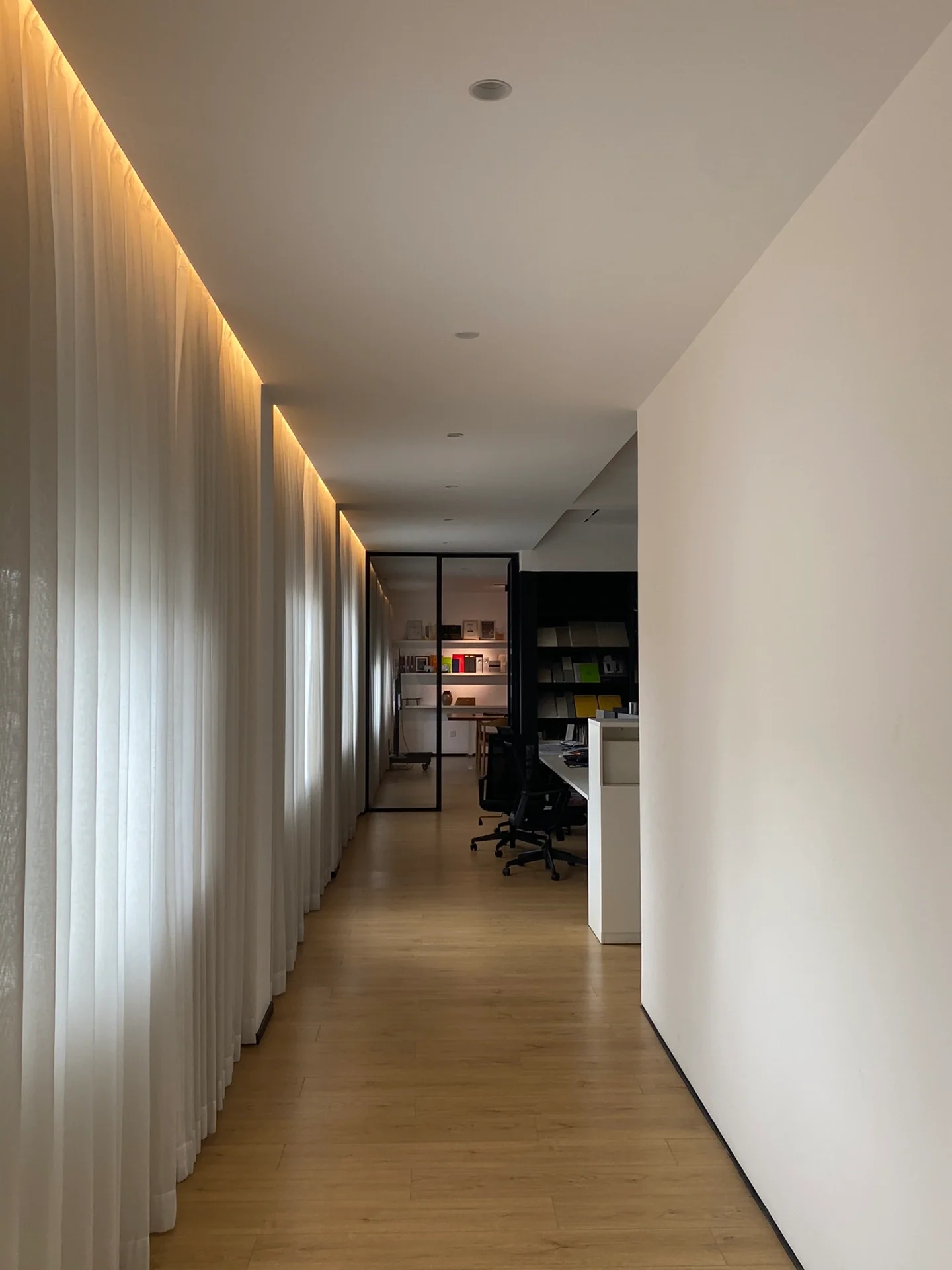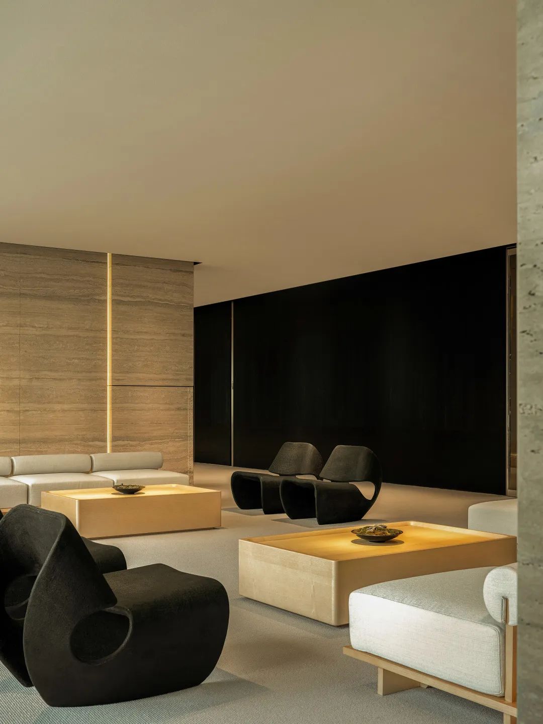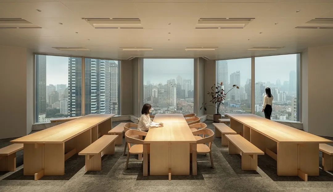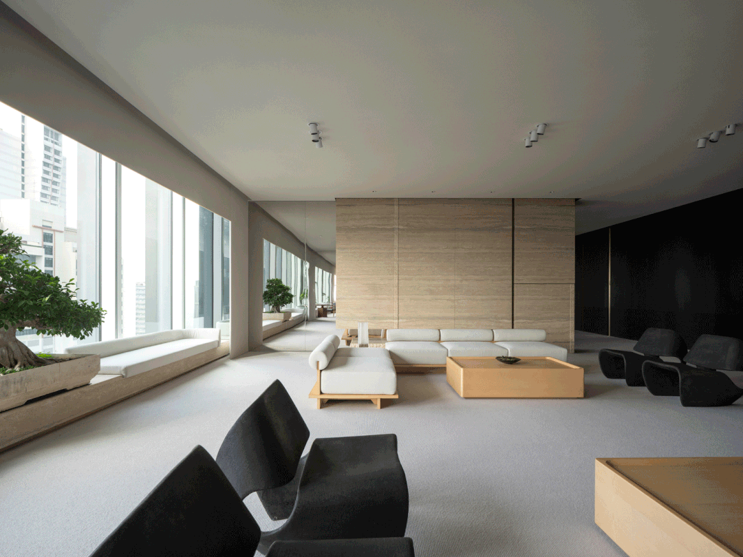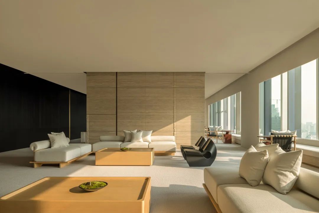 自由办公区运用黑色橡木作为基底,宽旷深邃,静默有力。办公区往内收合的“抑”,与接待区向外海纳的“扬”,形成反差,创造了不同情境下的转场体验。开与合的对比,抑与扬的反差,藏与露的统一,创造出静谧与光明的转场。