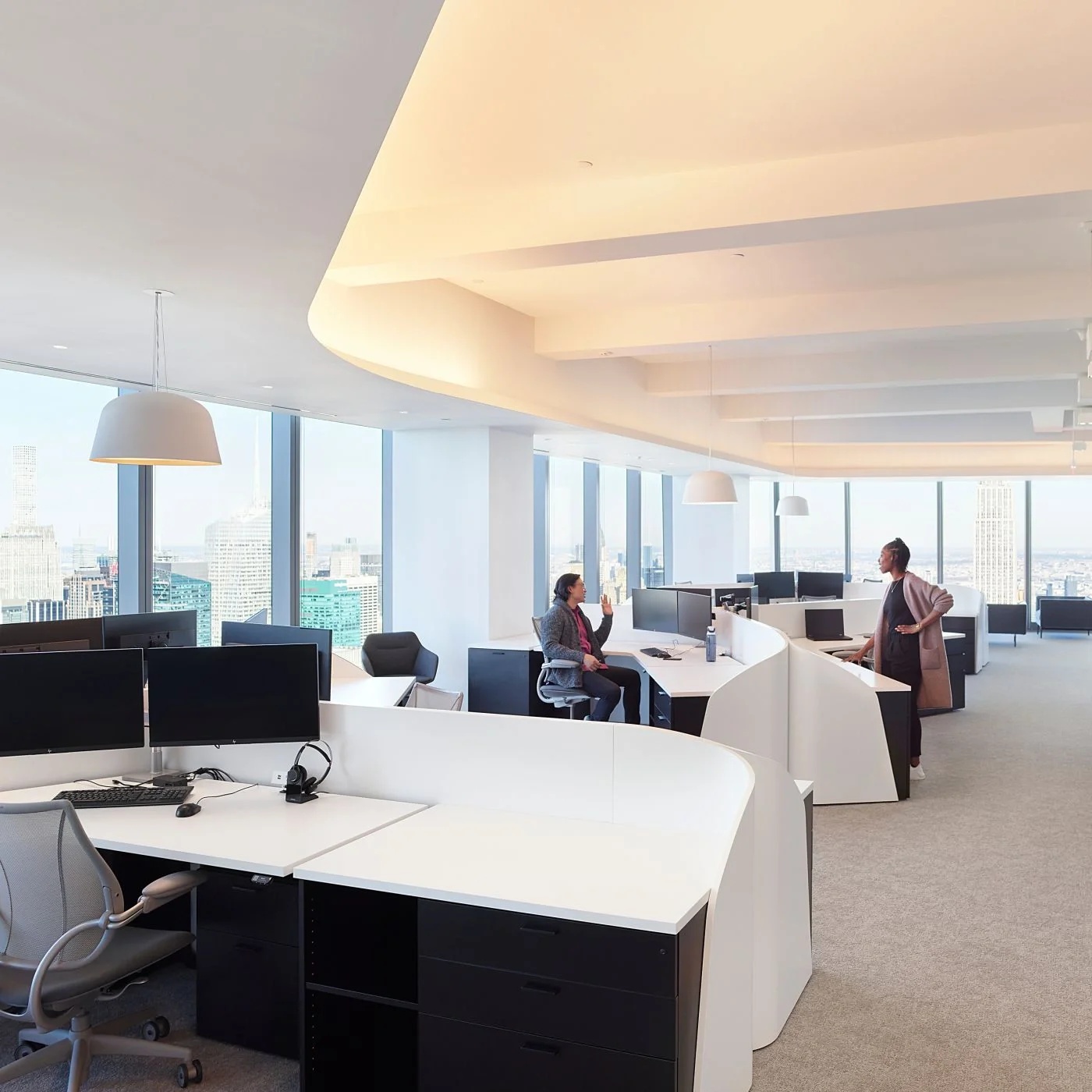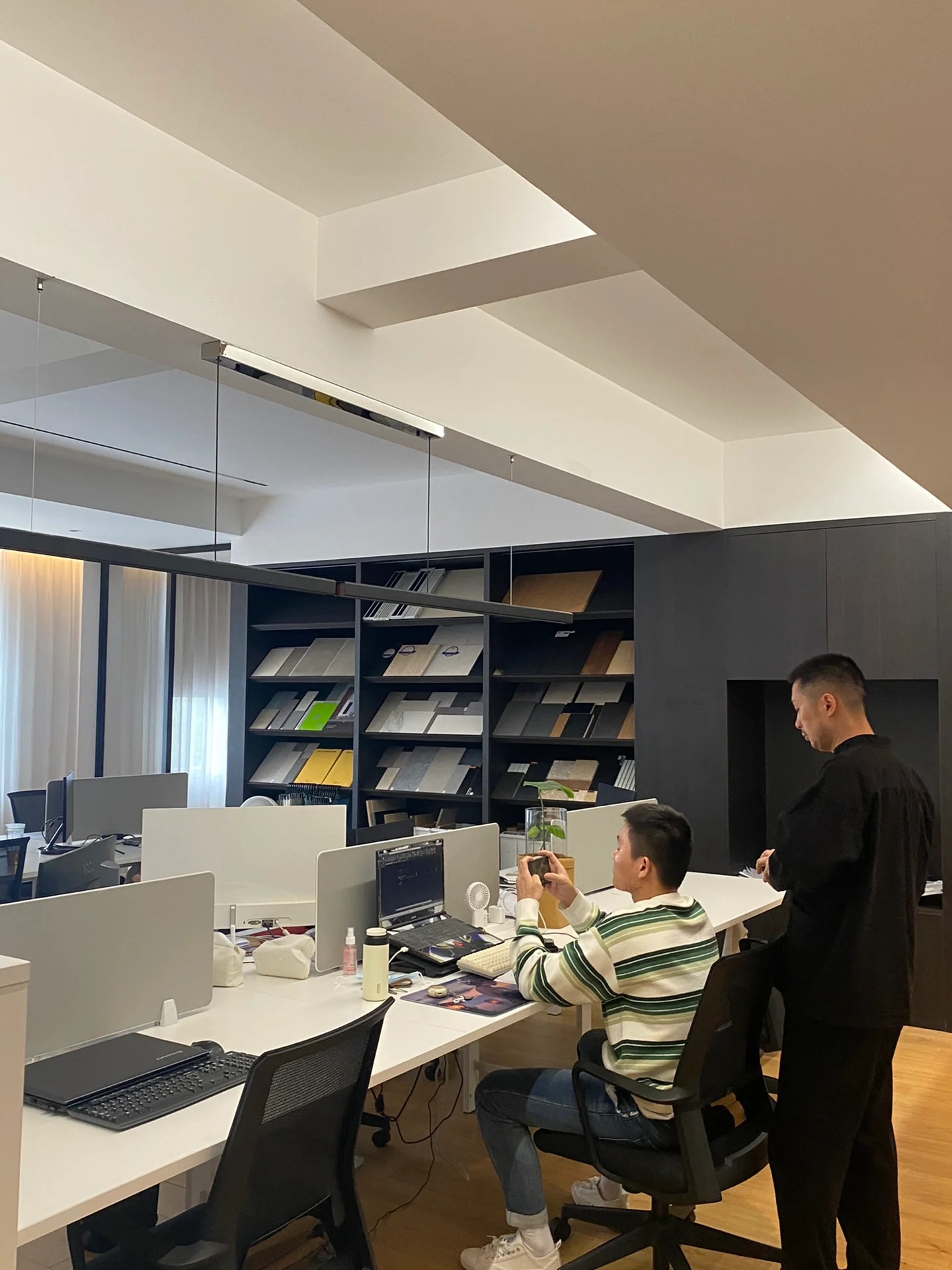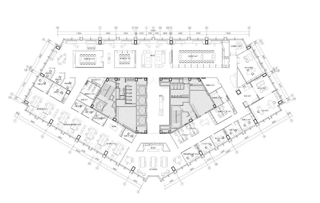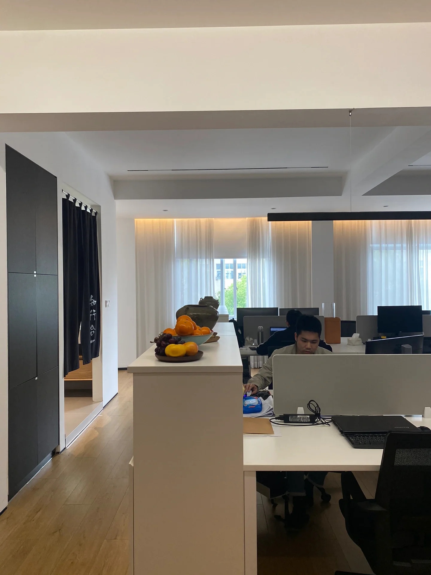 自由办公区运用黑色橡木作为基底,宽旷深邃,静默有力。办公区往内收合的“抑”,与接待区向外海纳的“扬”,形成反差,创造了不同情境下的转场体验。开与合的对比,抑与扬的反差,藏与露的统一,创造出静谧与光明的转场。