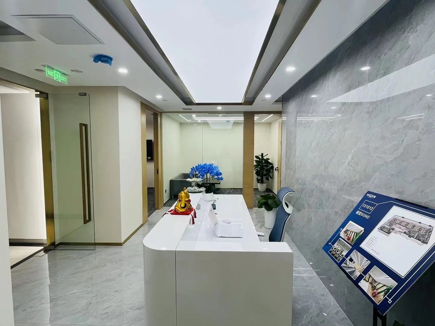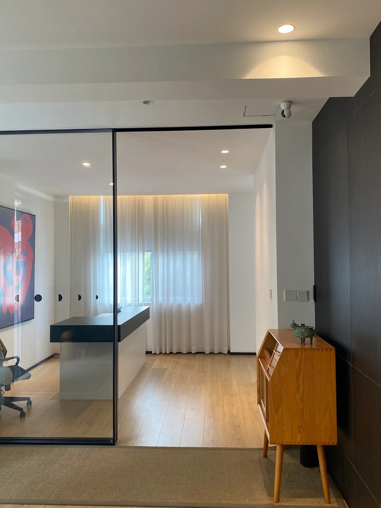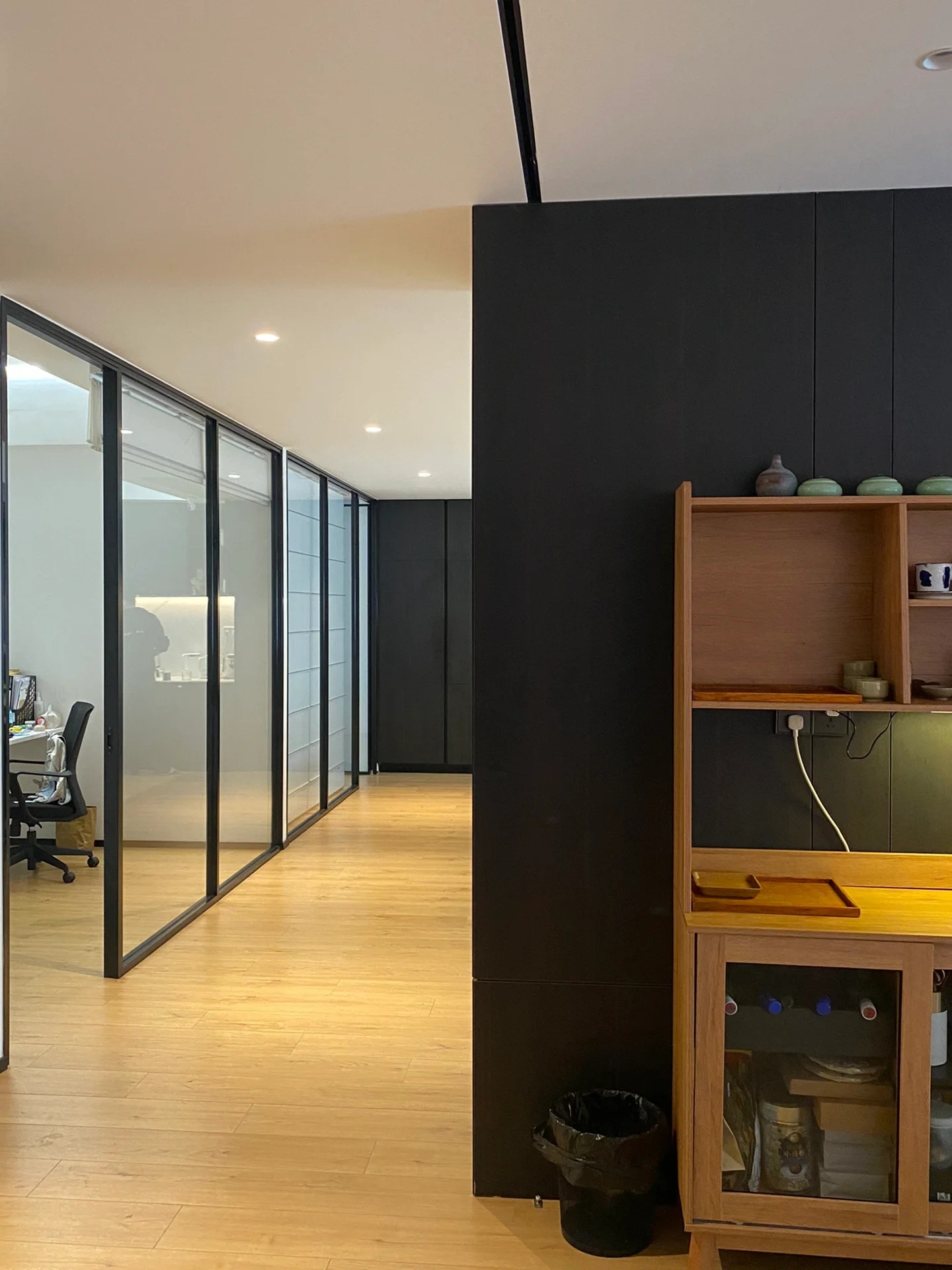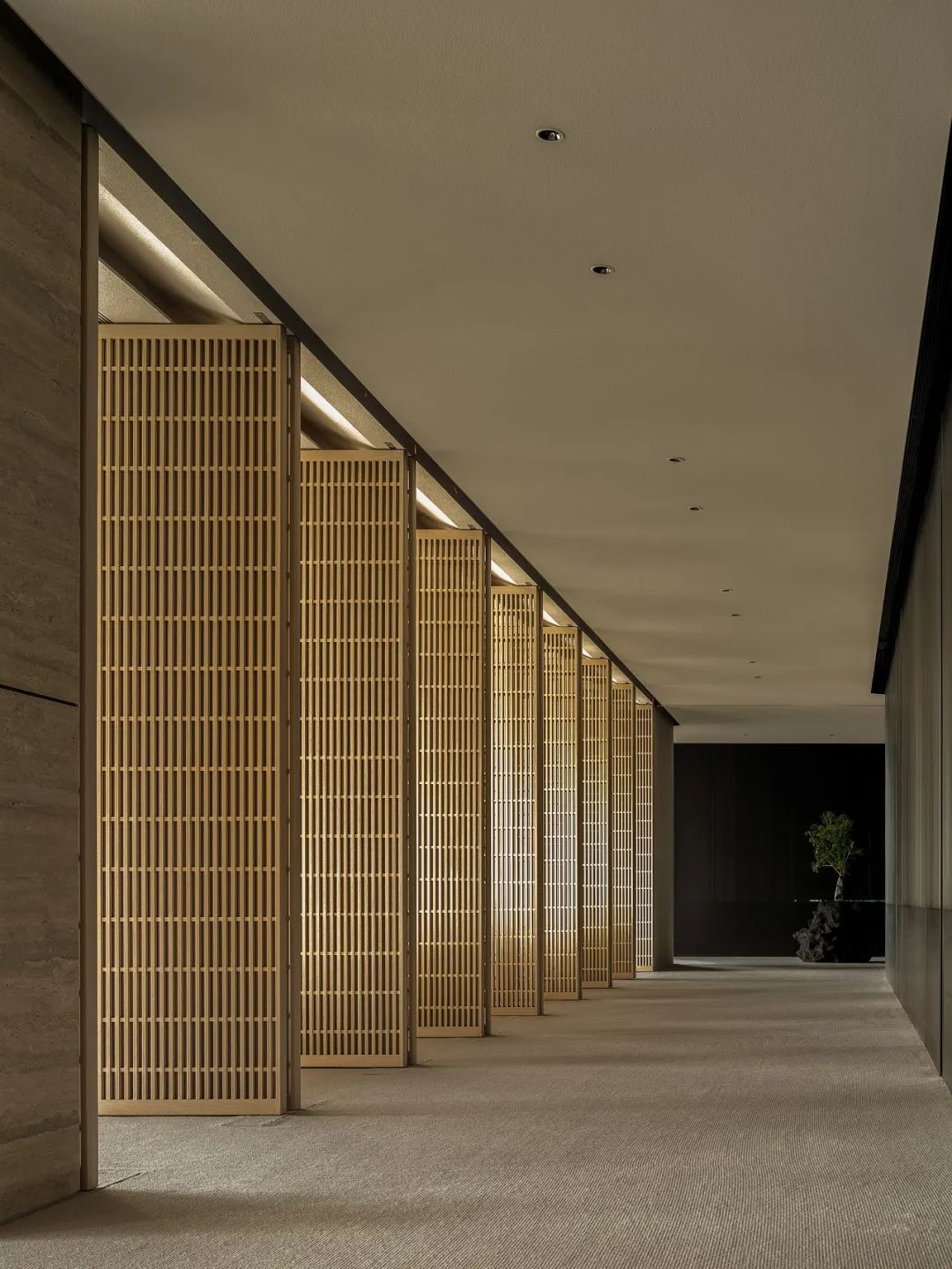 多功能会议区以木、石、玻璃三个盒子架构整个区域,木格栅电动旋转门连接至窗廊为大会议室,石块墙体围合成深色小会议室,中间以玻璃盒子做为连接,整体松紧有度,使用场景灵动。