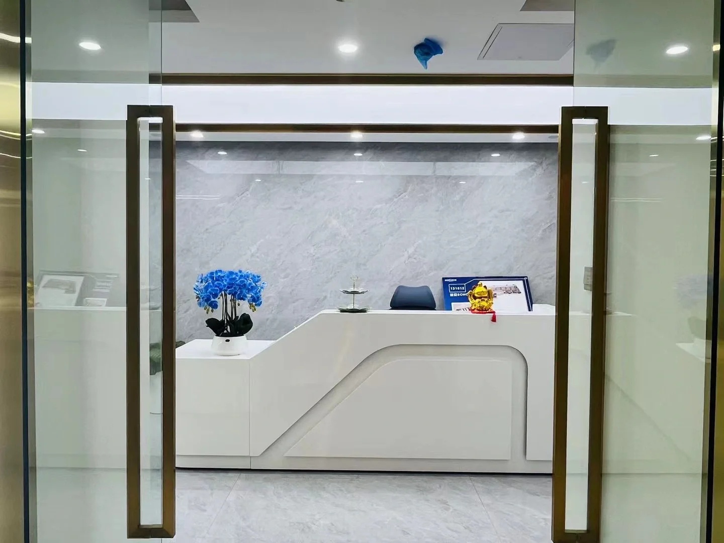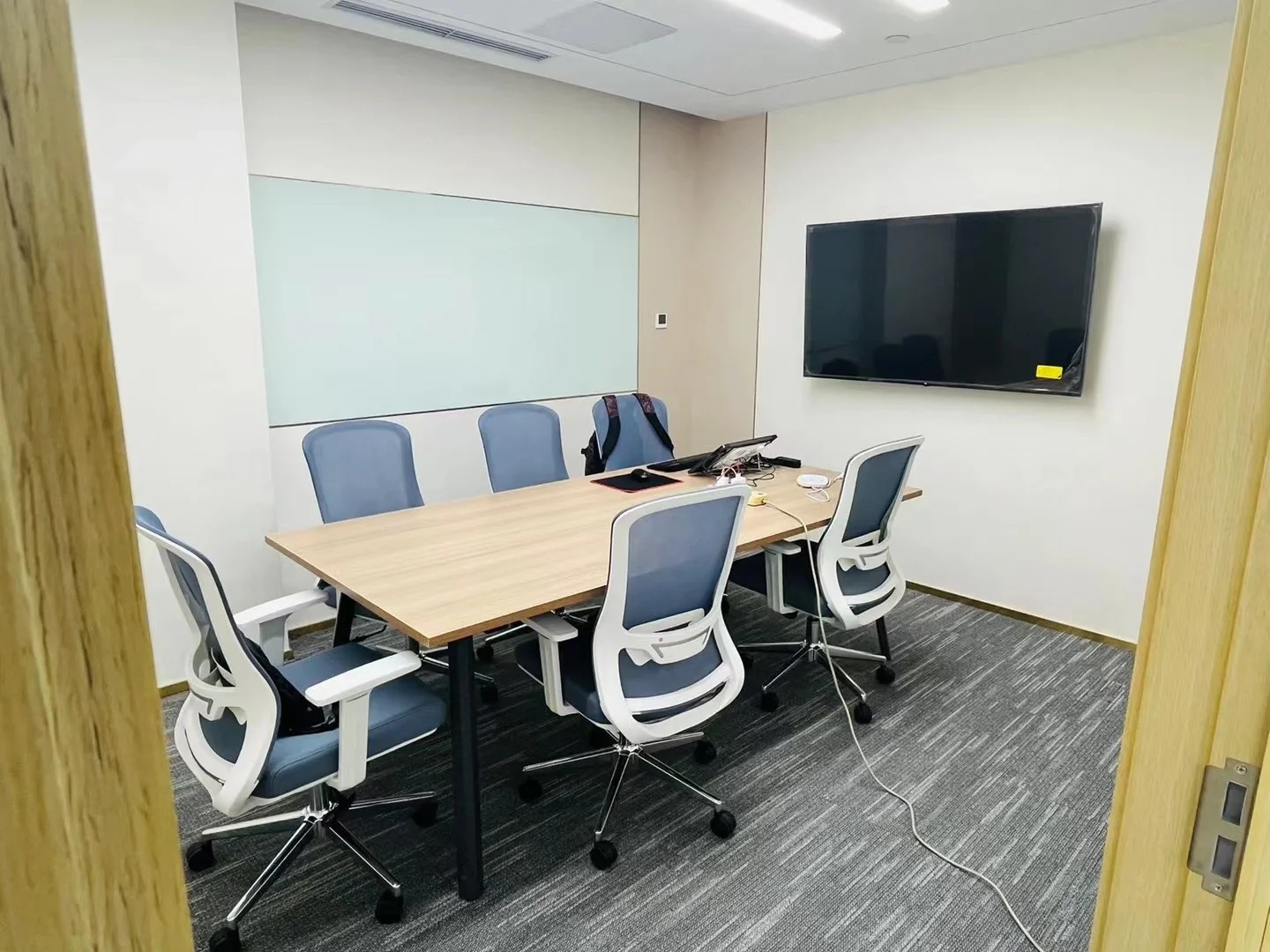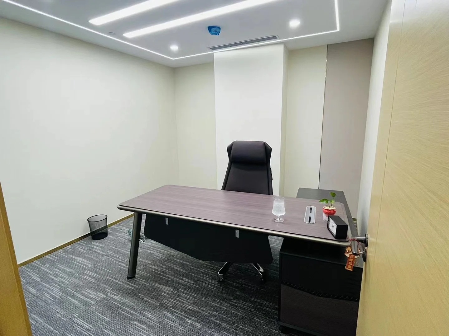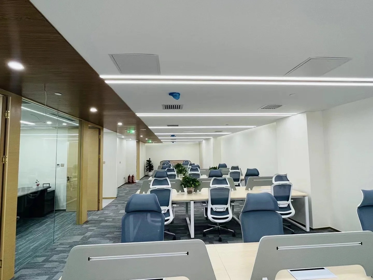多功能会议区以木、石、玻璃三个盒子架构整个区域,木格栅电动旋转门连接至窗廊为大会议室,石块墙体围合成深色小会议室,中间以玻璃盒子做为连接,整体松紧有度,使用场景灵动。