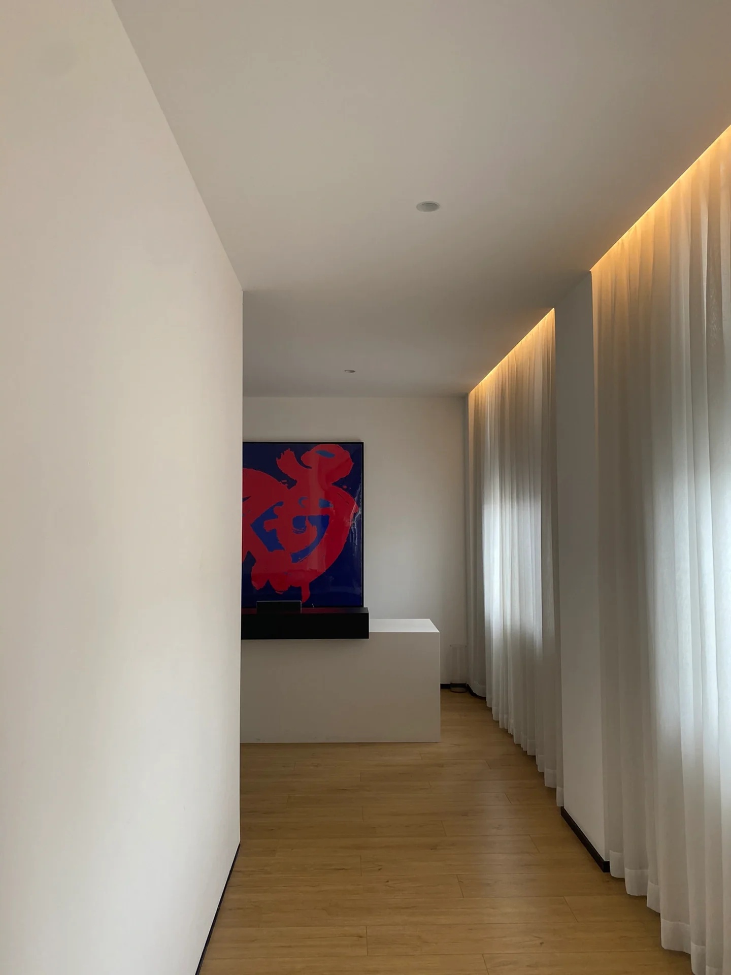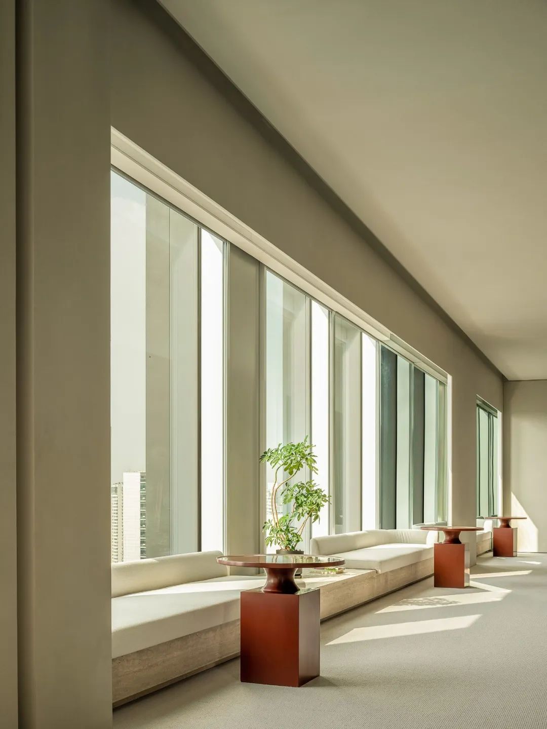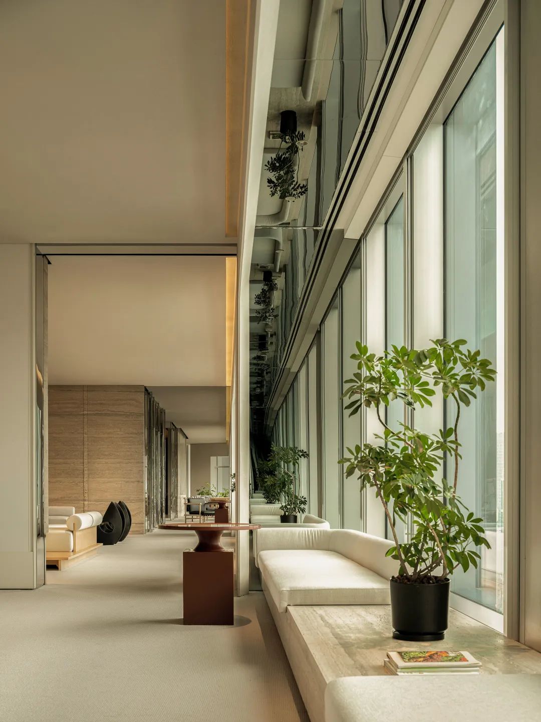 走廊窗两侧和顶面巧妙运用镜面不锈钢,将空间变成延绵不绝的城市宽幅全景图。窗外与镜内,交相辉映的城市街景,被重新拼接在一起。华灯初上,俯瞰浮华。精细的镜面边框,以高定珠宝般的时尚,不经意装点着来来往往的人。
