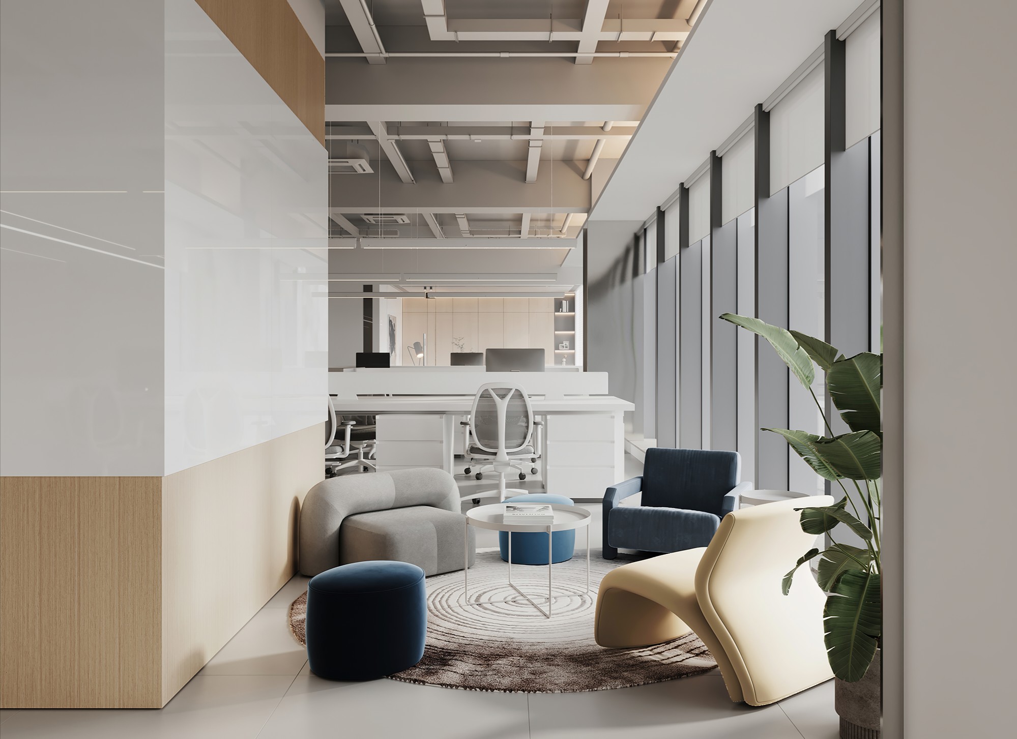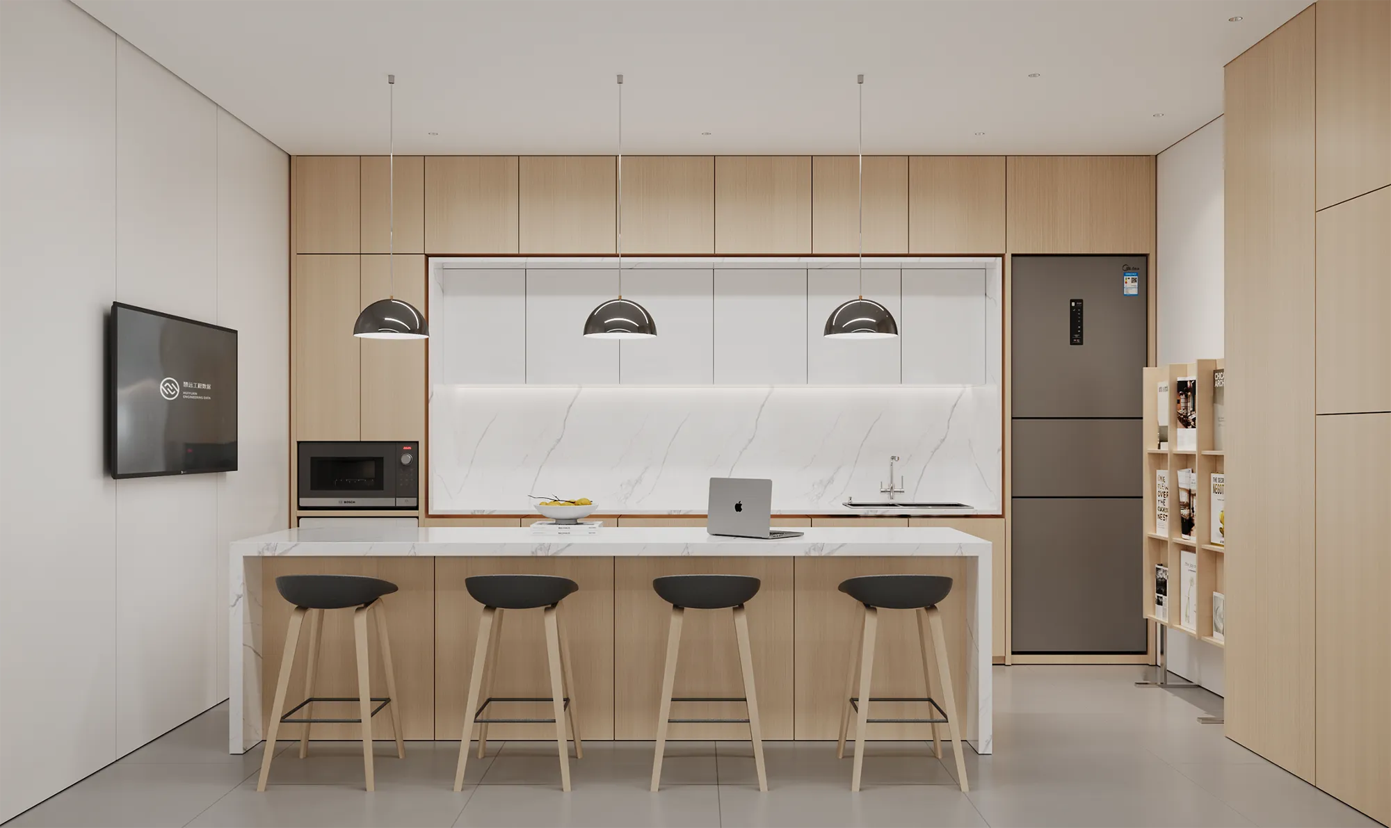 茶水间运用木质与大理石作为装饰,色调明快清爽,打造像家一般自在舒适的空间,从而提升员工的幸福感。同时,在办公区角落设置开放式洽谈区,除了洽商业务,也能作为员工工作之余的休闲场所。