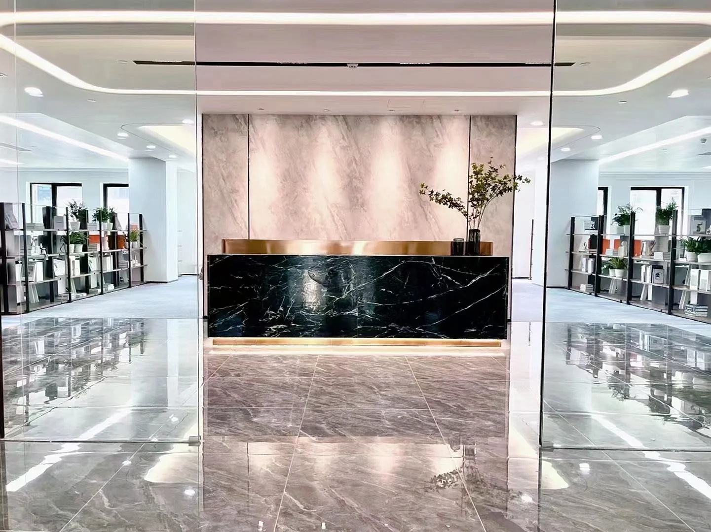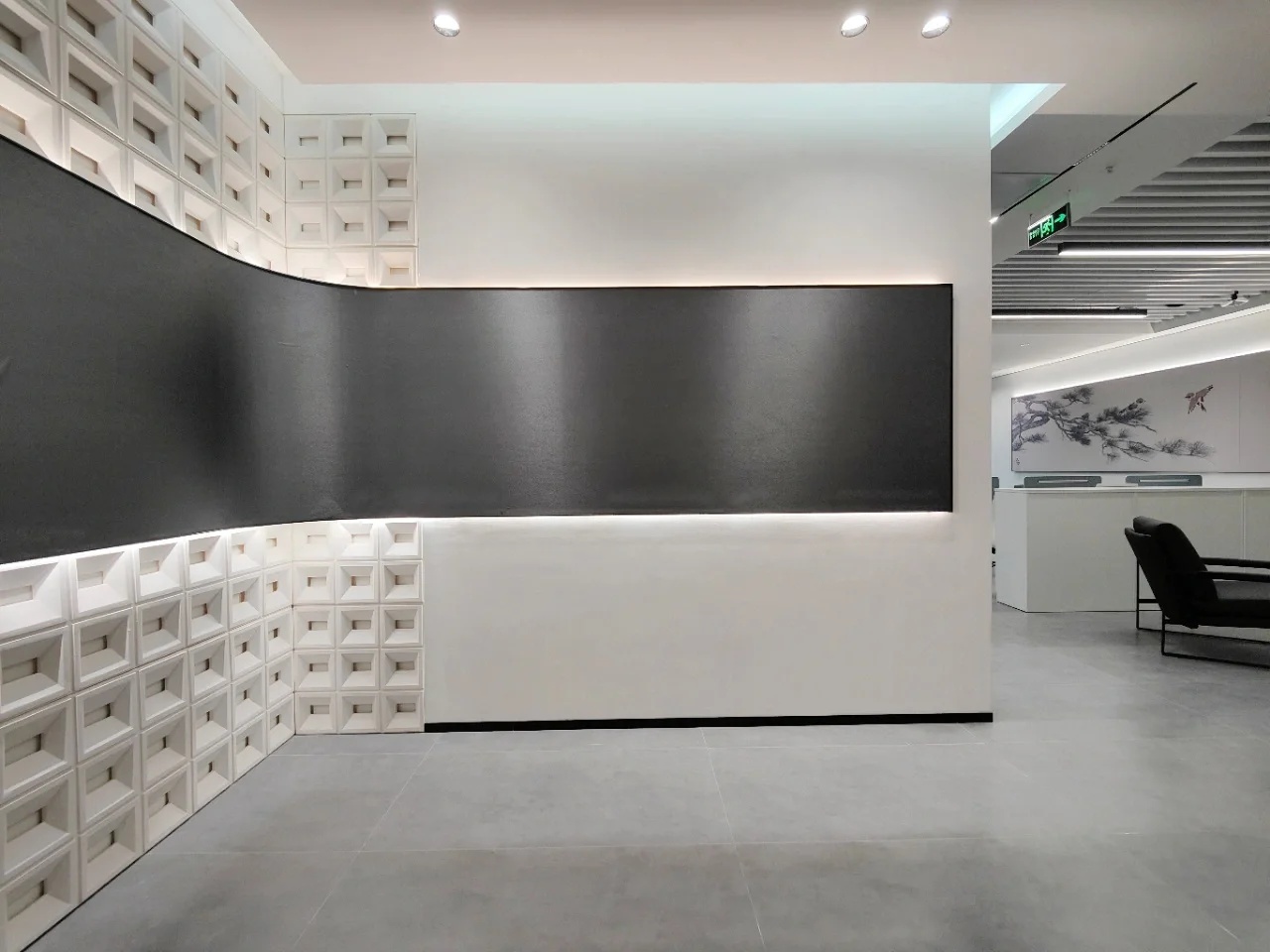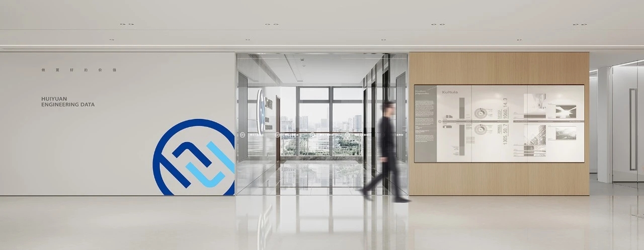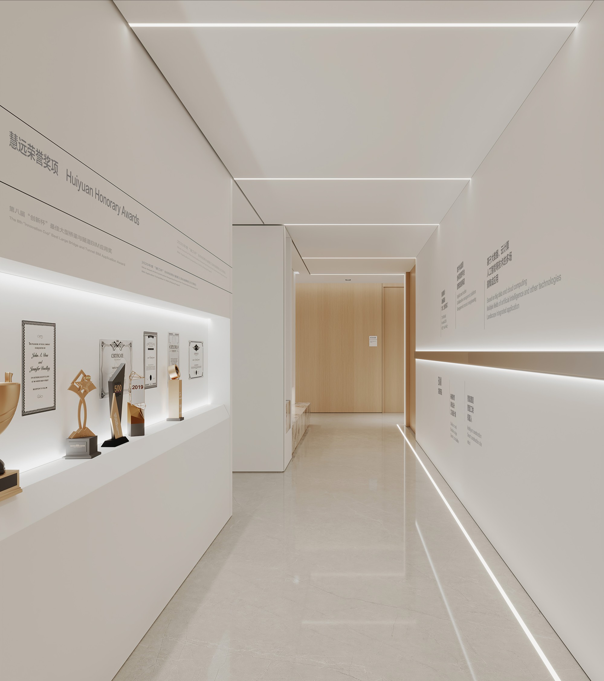 大厅没有过多的装饰元素,而是用简洁的形式打造灵动且现代的空间。在一侧放置沙发座椅作为等候区,对面即是数字屏幕墙,以便让人们在碎片时间了解企业文化。利用分隔的墙面串联起空间,在过道处展示荣誉与员工,从而建立起对企业的初步认知。