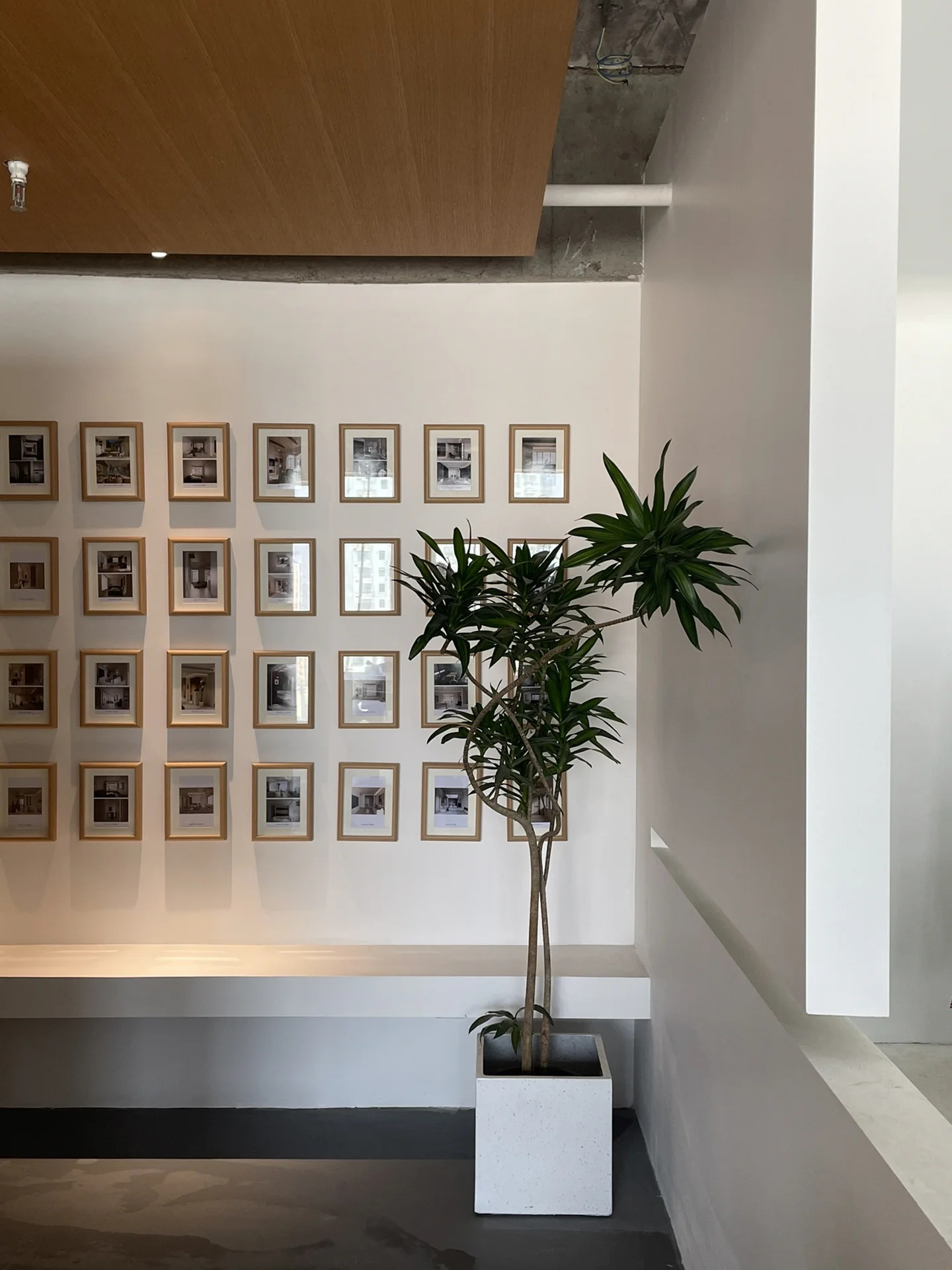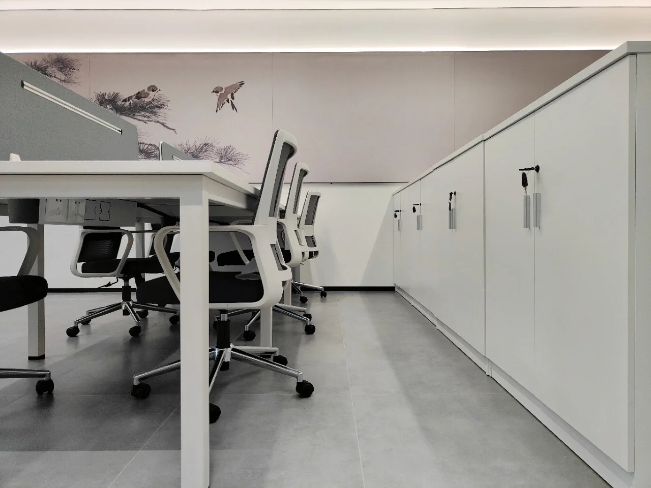 白色、灰色和咖色作为空间的主要色彩,互相映衬着,白色代表着高效、严谨,灰色则代表着沉稳、宁静,与柔和的咖色一起,中和大面积白色的冷肃感,塑造融洽舒适的办公空间。