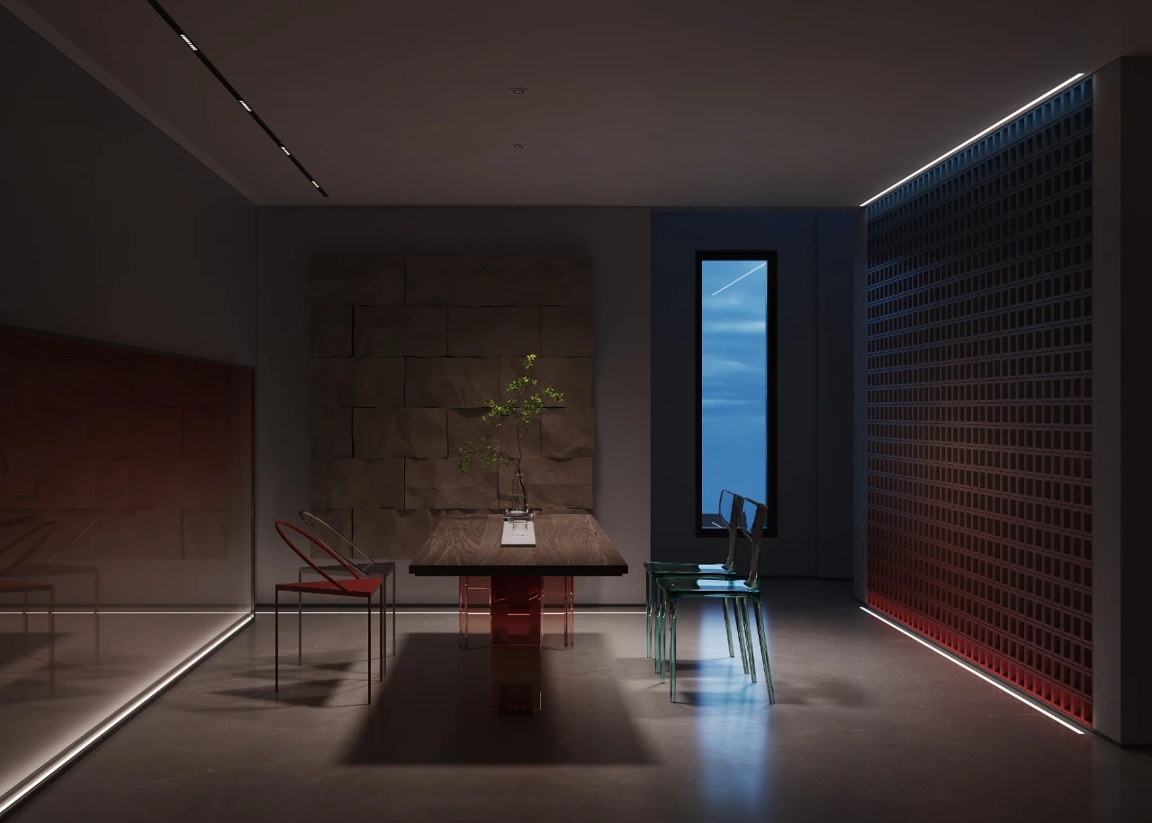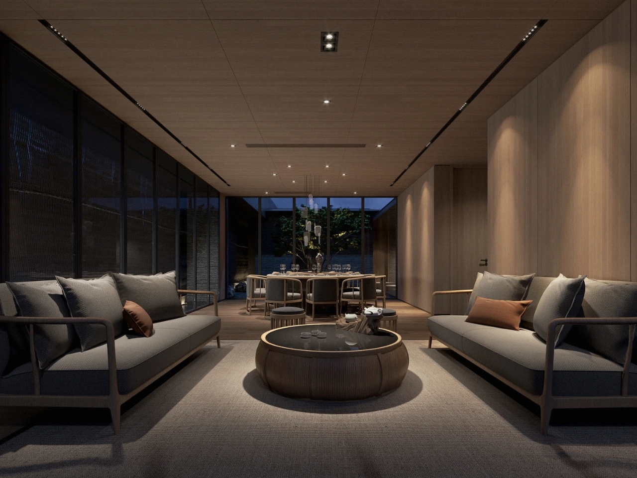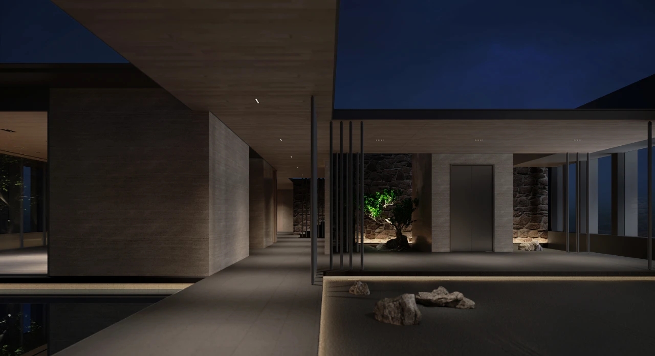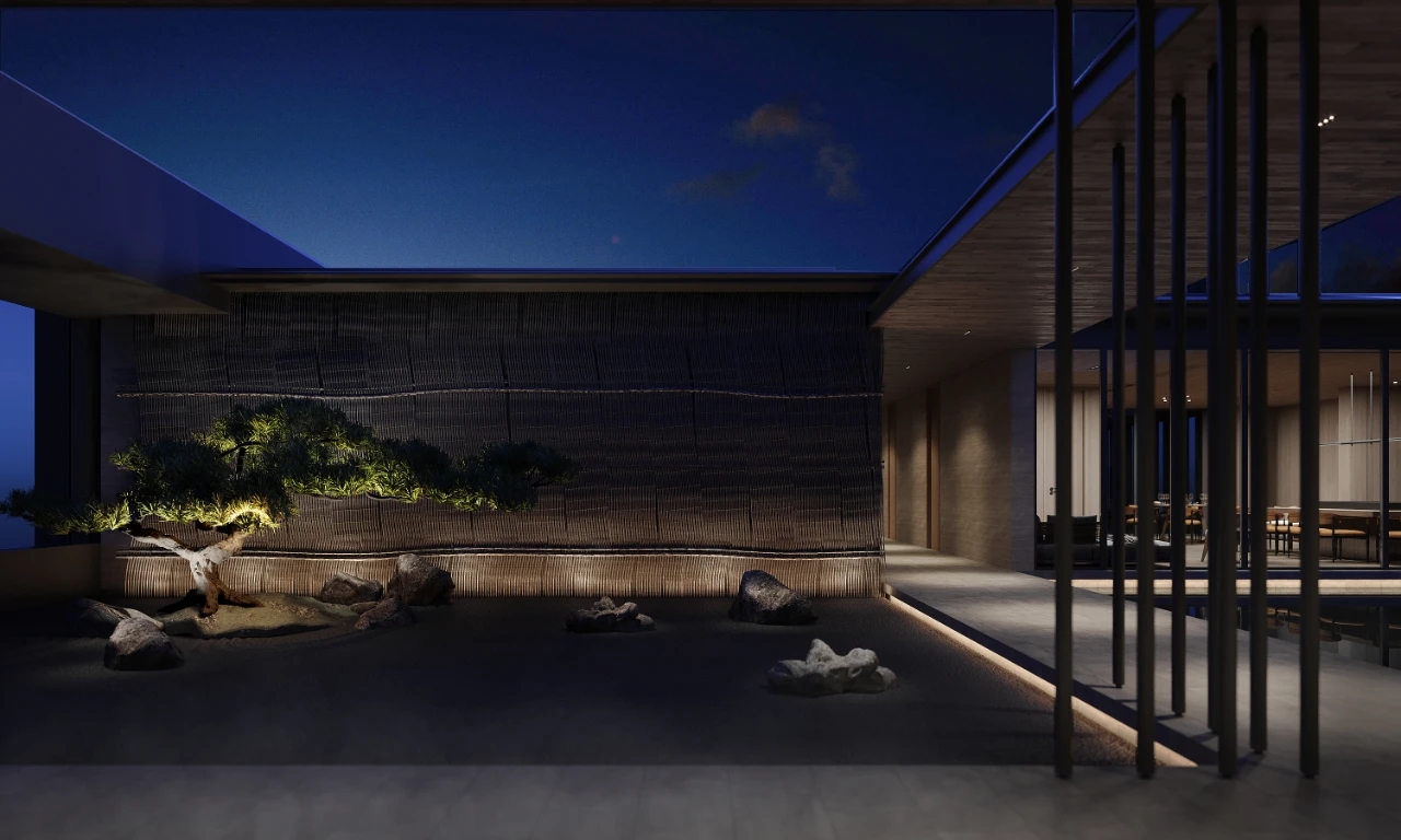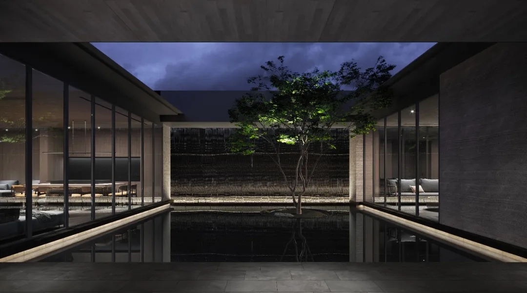 行至中庭,四方围合出一处小景,盈盈一汪浅水,树木立于之中。东方园林讲究“巧于因借”,两侧休憩空间中,人们透过窗户向外望去,灯光下竹影若现,水中树影微微荡漾,光与影的曼妙,交织在暮色之中,诉说不尽园林意。