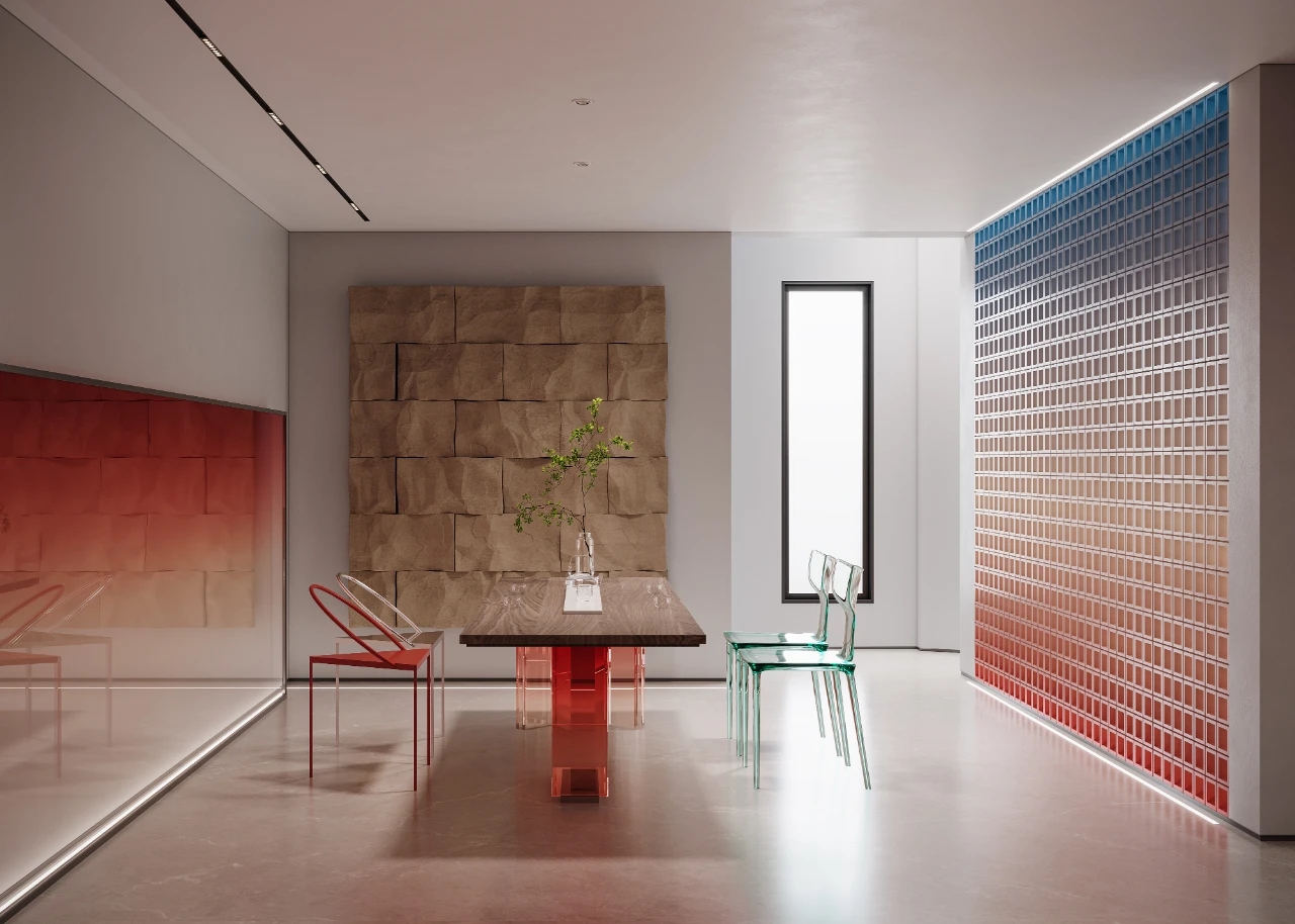 抛去承重的墙体,用材质界定空间范围。光带以方格造型,纵横交,以简造实;地毯的粗糙与瓷砖的平滑,以材质划分动静,井然有序地规划空间。阳光从大片的落地窗前洒落,照亮开阔且宽敞的空间。