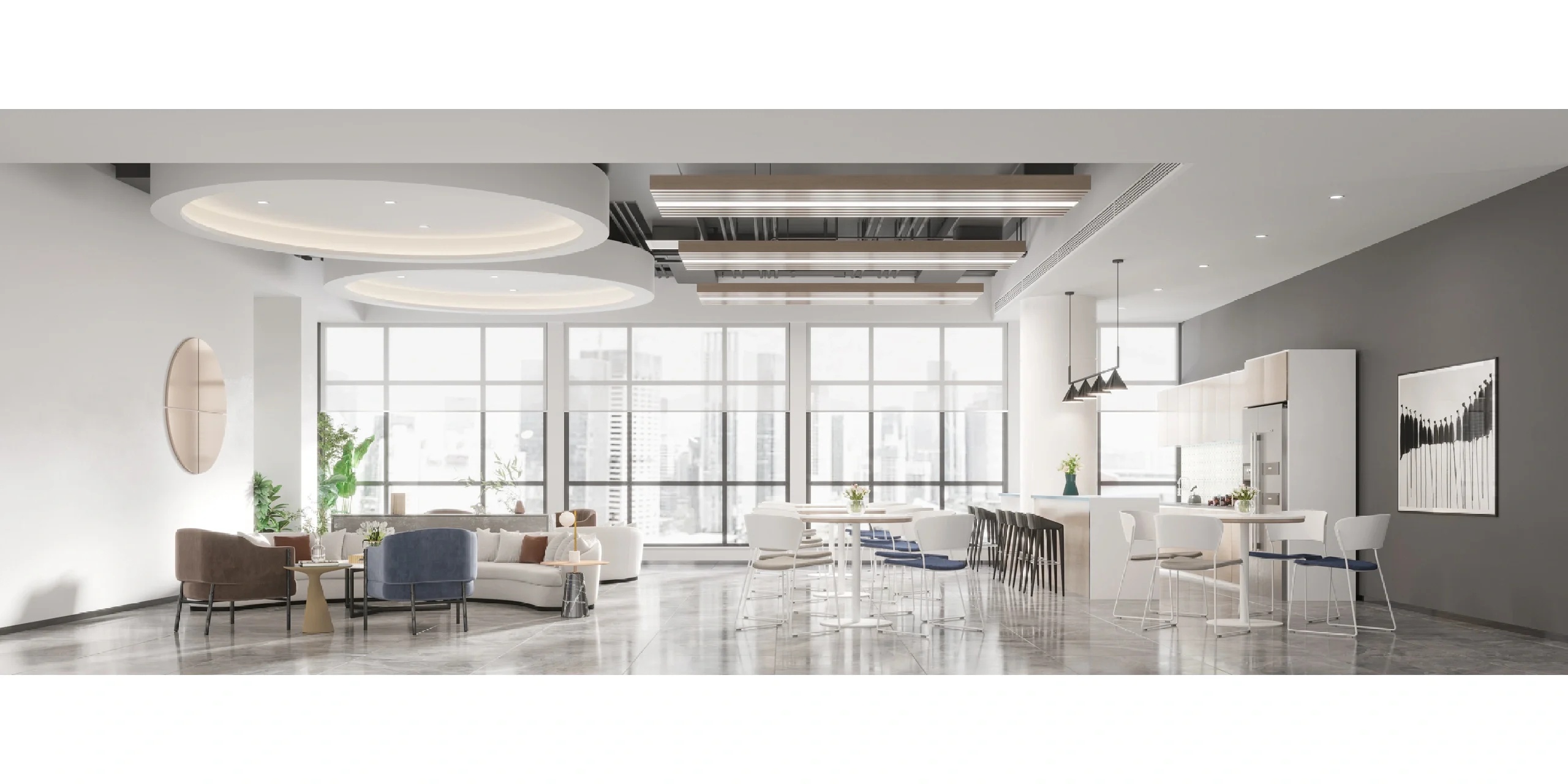 开放的办公模式,摆脱座椅的封闭限制,茶水间与办公区共同布置,空间彼此交融,颠覆传统办公的单一性,让办公空间承载社交空间属性,随时随地让交流在每个角落发生。