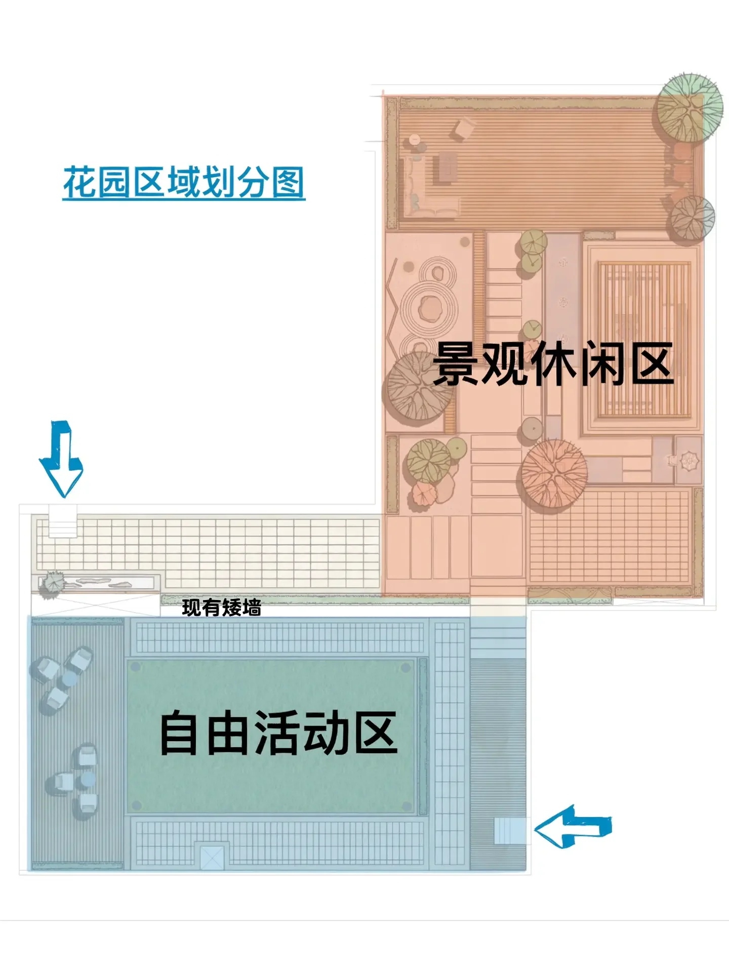 功能分区:根据现场格局来分析,通过现有矮墙将整个花园分成两个功能区,红色区域人视角处没有太多高大建筑物的遮挡,视线比较开阔,因此用来作为景观休闲区域;而蓝色区域几乎被办公楼所包围且处于两个入口处的连接处,因此可以作为活动场地来使用。