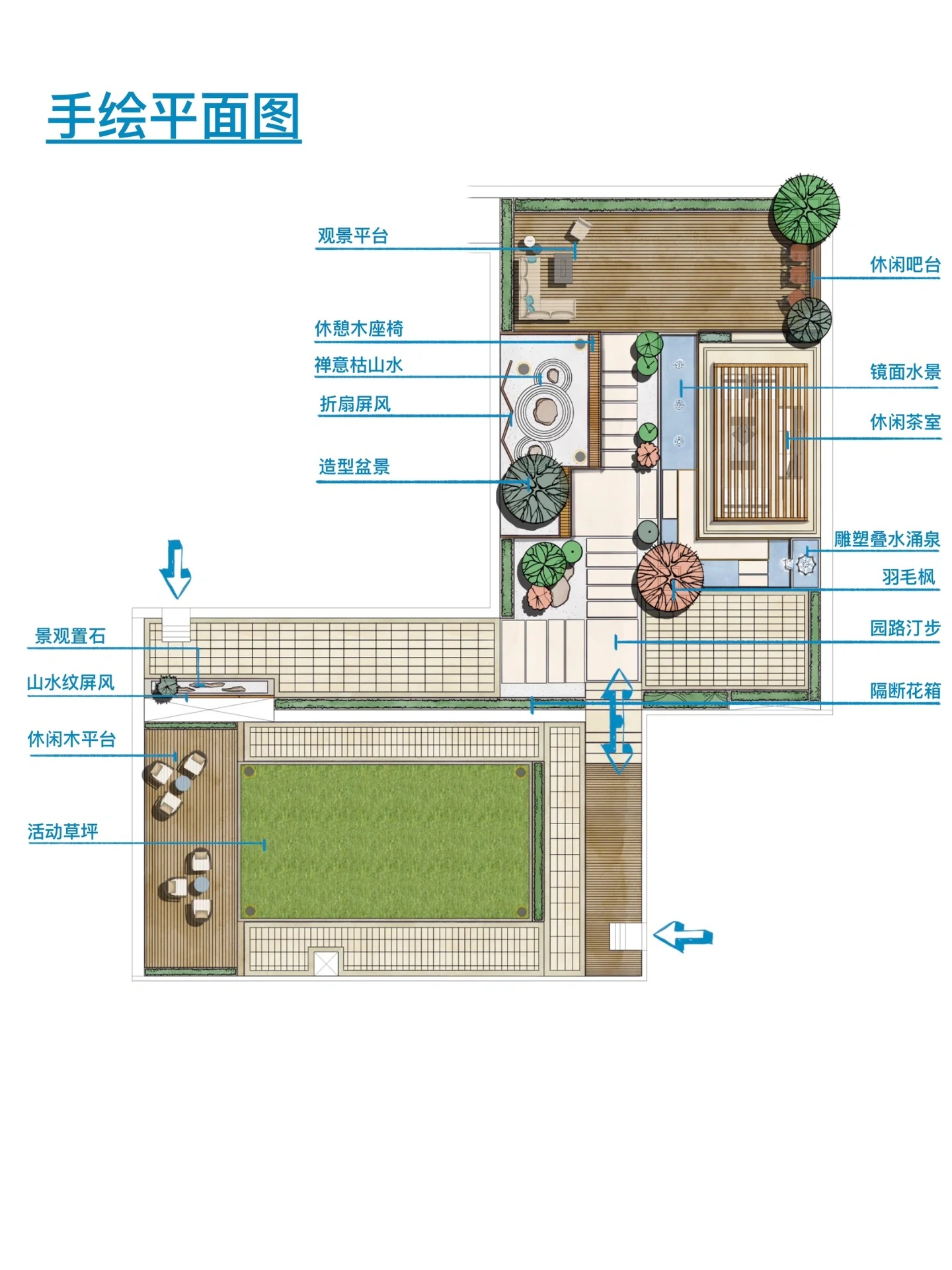 B、景观休息区:首先映入眼帘的是一棵造型独特的羽毛枫,它不仅作为视线焦点去引导人的目光同时也为其后的休闲茶室做一定的遮挡作用。踏过水中汀步,我们来到了整个景观休闲区域的亮点之处——静思亭,考虑到屋顶花园的后期打理及施工问题等,我没有设计复杂沉重的假山水池,而是选择了更为耐看型的跌水镜面水池。在静思亭的一侧,设计了莲花涌泉的景观装置,莲花寓为“真、善、美”,在美好寓意之下,结合泉水跳动跌宕,水势起伏、错落、重叠,将整个区域都浸润于水的空灵与轻盈之中。正对着静思亭的空间,设计了一处饱含禅意之感的“枯山水景观”,通过弧形的沙子图案来营造波浪的水面效果,而不同形状大小的景观置石则作为山的存在,置石下的灯圈则是水面泛起的涟漪,此处的景观为“侘静之景”,所说的便是精神的寄托、心灵的栖居。在办公楼与枯山水交接之处,设计了屏风作为隐私遮挡,围绕着枯山水景观做了一圈木栏杆和座椅结合的方式让其成为不被破坏的焦点之处。整个枯山水景观以高处的屏风、中间的造型盆景以及低处的景观置石相结合,形成一个多层次多通透的空间。此区域的尽头便是开阔的观景木平台,用简单的花箱做点缀,结合现有围墙增加了一处趣味吧台的设计,由此,整个空间有大面积聚会的休闲区也有饭后喝茶聊天的静思亭更有一人独乐的吧台景观。