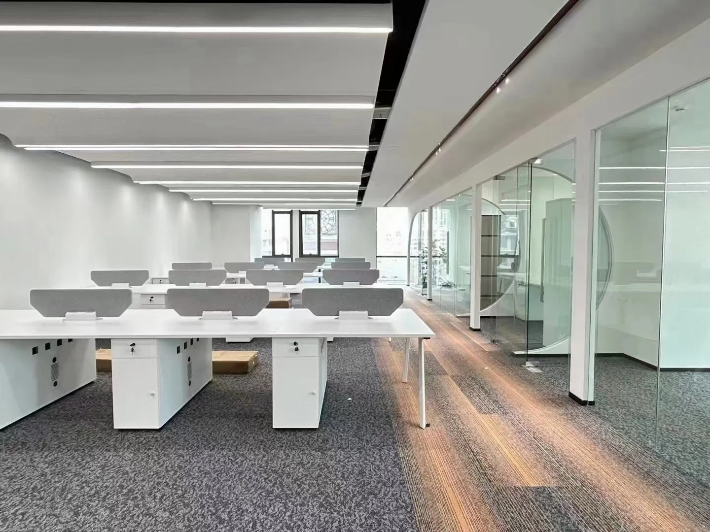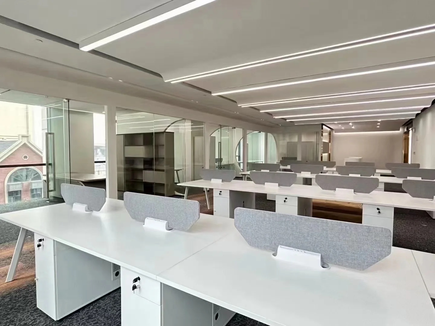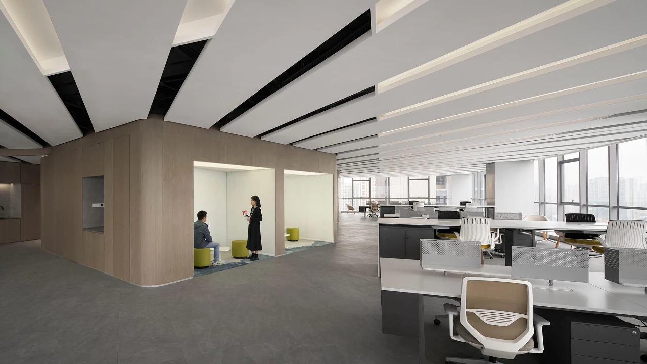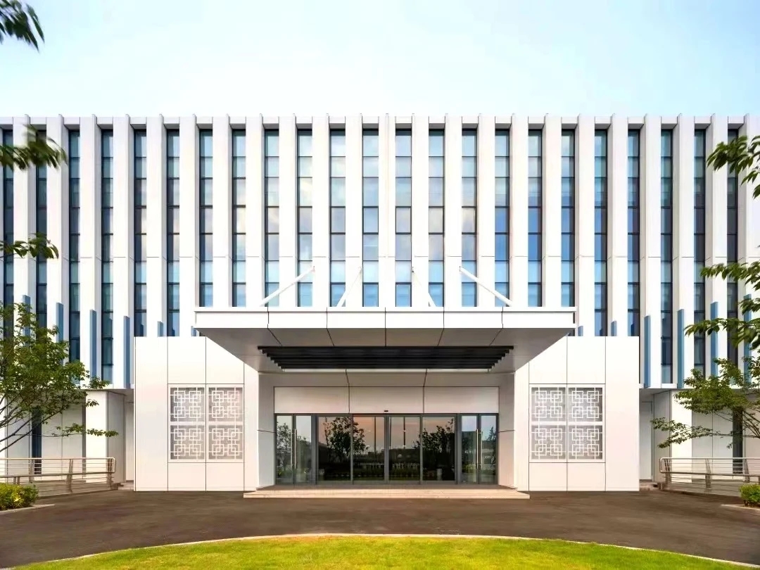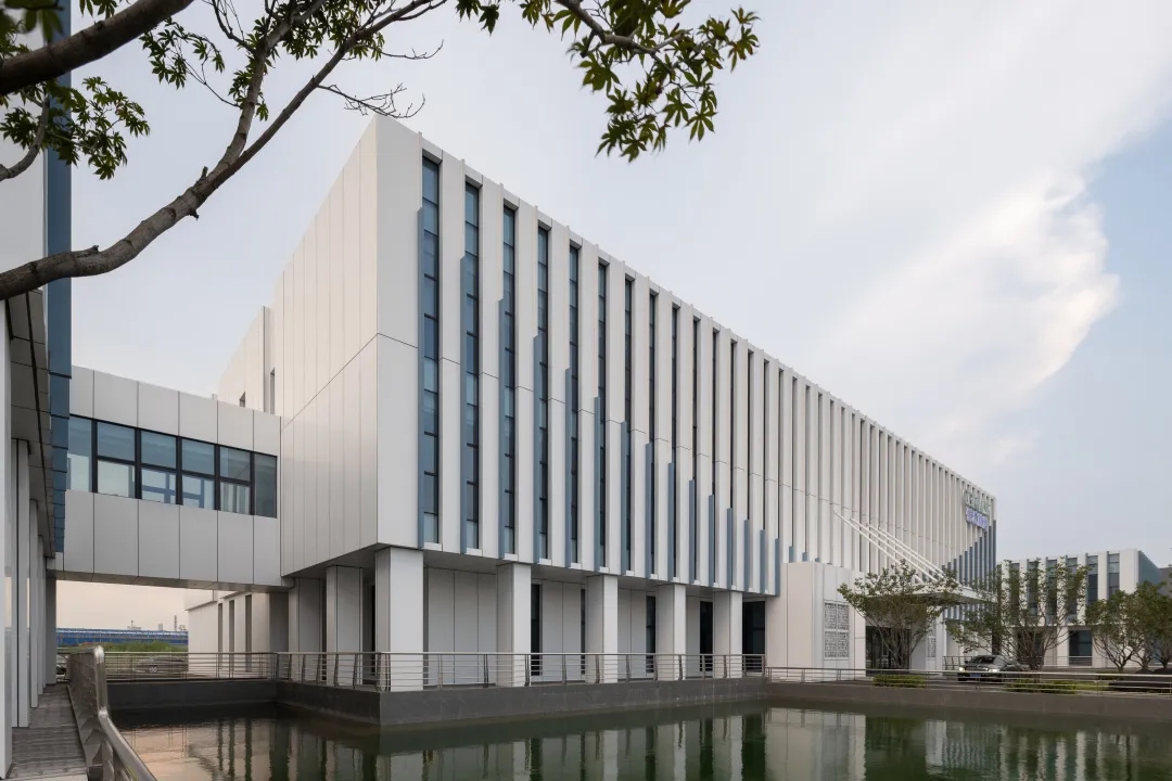 整体建筑设计采用国际化风格,建筑立面选用玻璃幕墙,金属格栅及干挂石材,整体色彩以浅色为主,配以蓝色的水面景观,营造科技感与时尚感,建筑形式简洁配以精致细节,保证落地效果;在充分考虑城市完整界面的同时,体现信汇集团科技创新的企业特点,彰显标志性、品质感及企业文化,打破传统化工企业的保守形象。