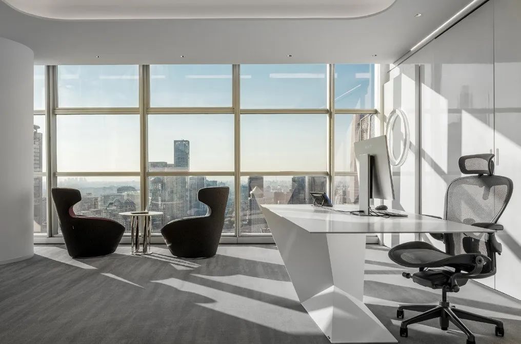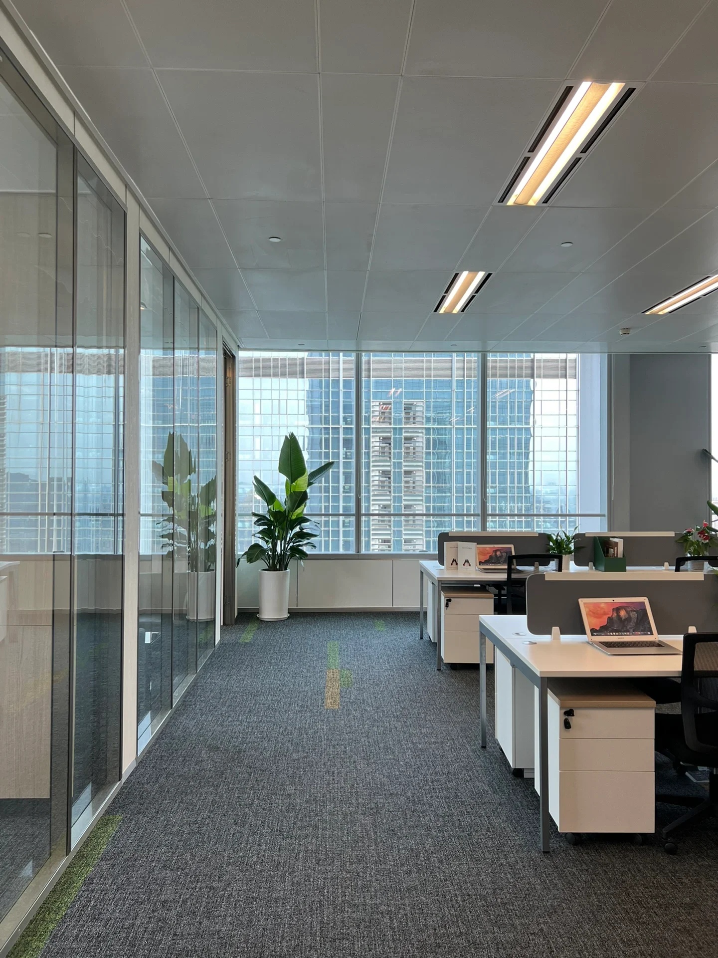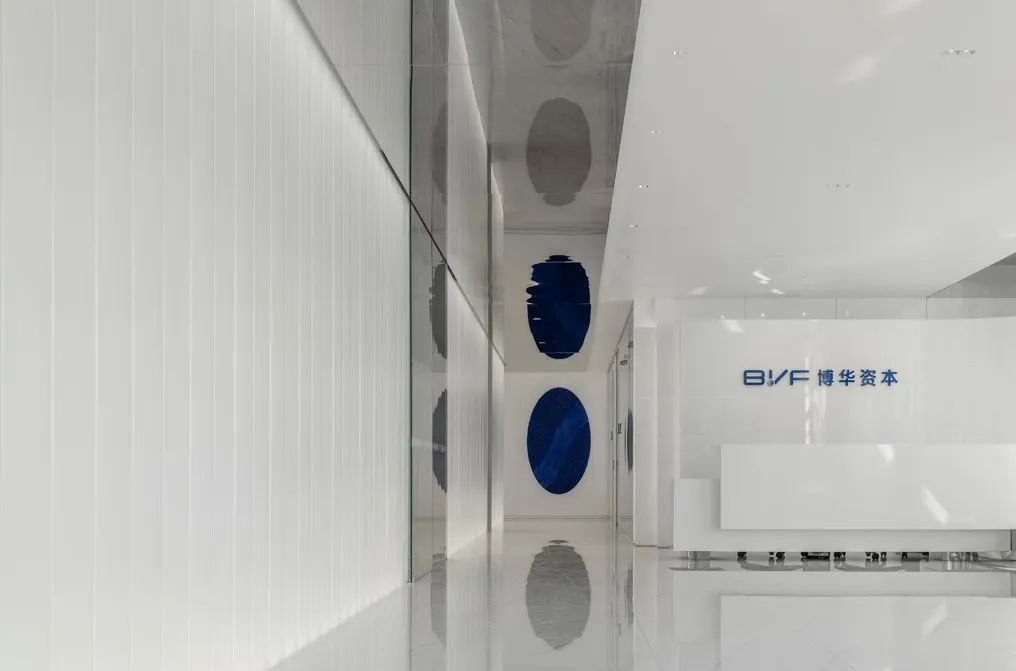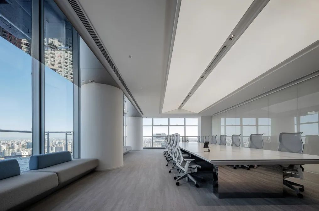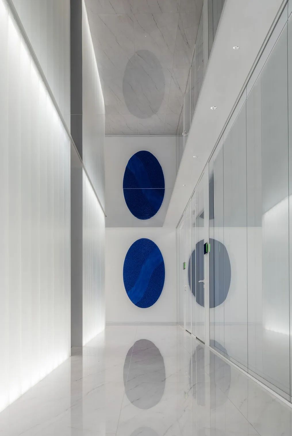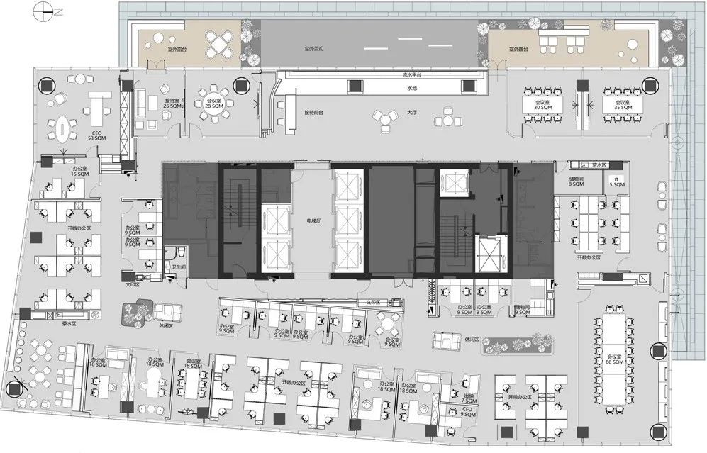 在空间布局上,将面西偏窄的空间作为接待区,与室外的露台连接,露台上的山石景观与室内的流水景观融为一体;将露台的两侧作为户外休息区,对接待功能做更广的延伸。平面图的东侧与南侧为后场工位区,将所有员工工位临窗,最大化地让员工享受到明媚的自然光和眺望远方的视野。 在材料运用上,接待区地面与墙面全部采用岩板,靠近核心筒的墙面使用 U 型玻璃,让实体的结构墙显得轻盈透亮。办公区的地面全部采用编织地毯代替传统的尼龙地毯。镜面不锈钢在天花板上的应用是整个空间的亮点, 所有的过道均形成倒影,游走其中便能感受到空间的延伸与变化。