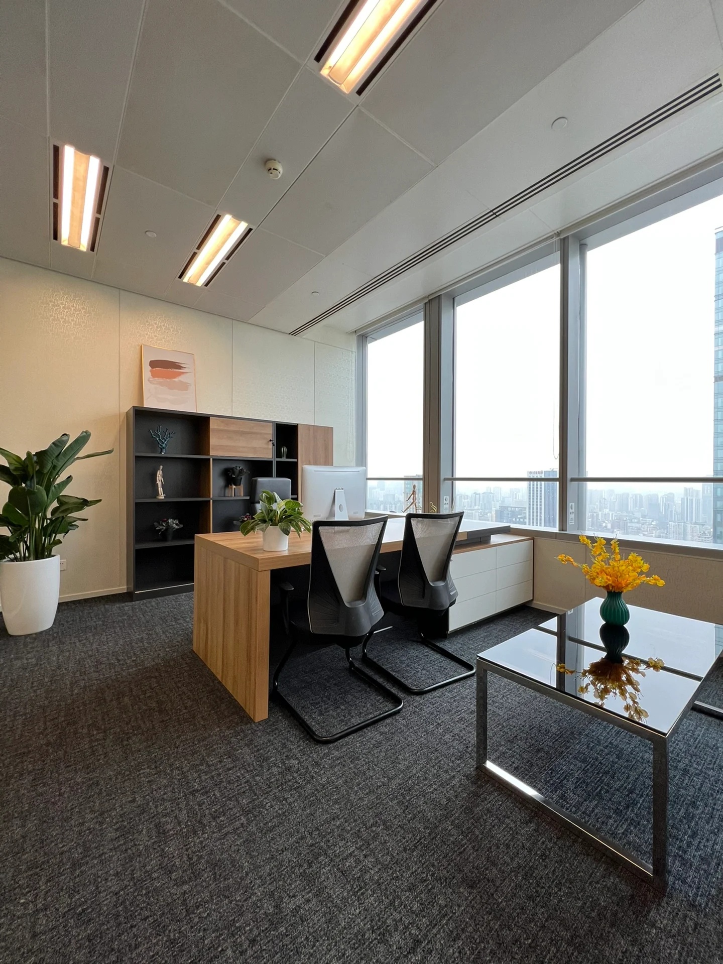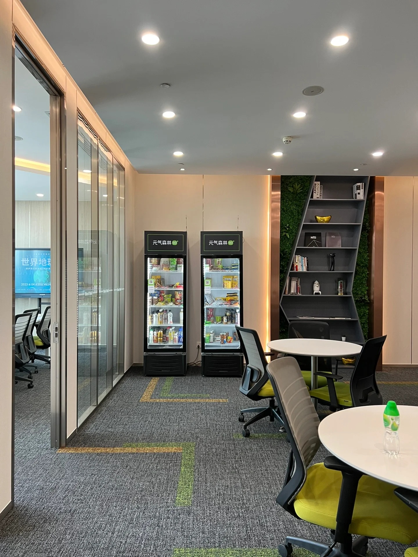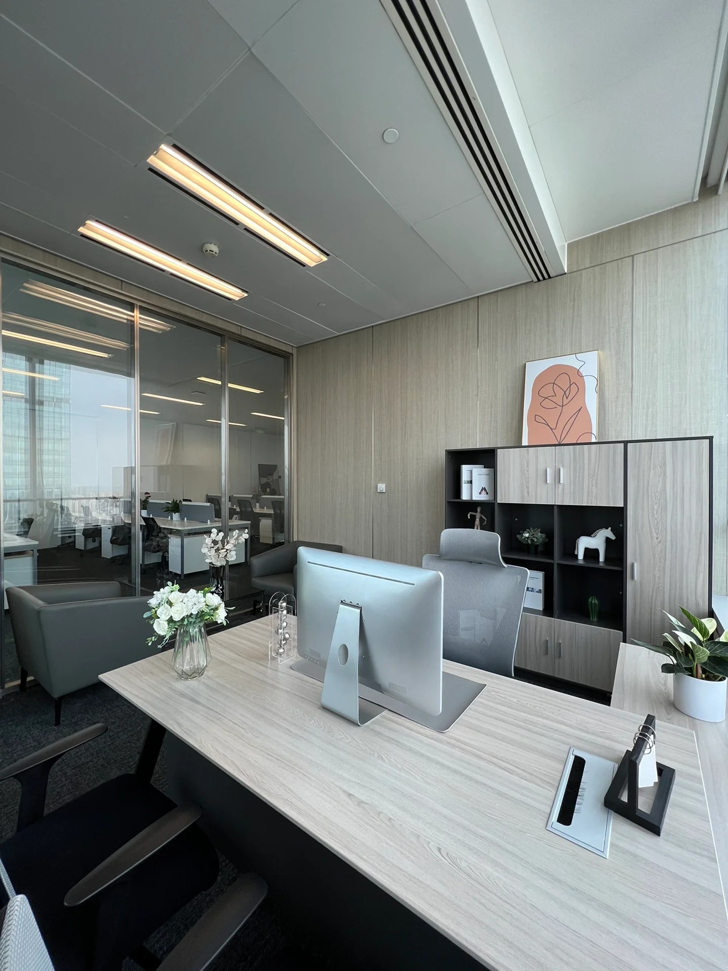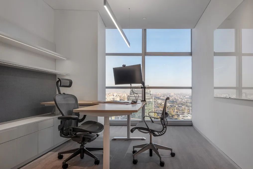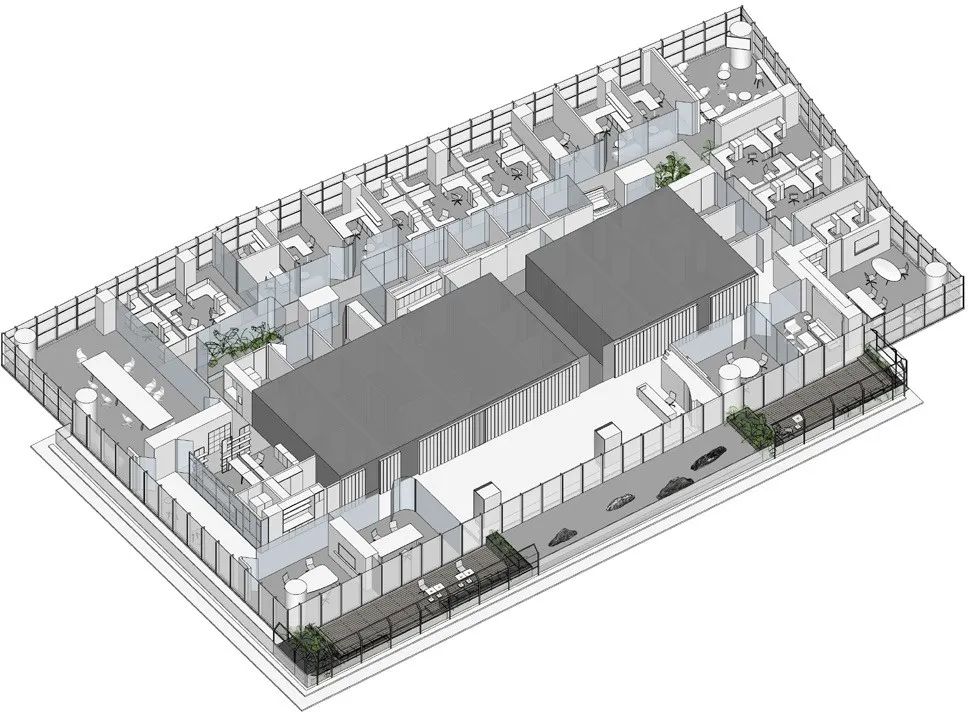 在空间布局上,将面西偏窄的空间作为接待区,与室外的露台连接,露台上的山石景观与室内的流水景观融为一体;将露台的两侧作为户外休息区,对接待功能做更广的延伸。平面图的东侧与南侧为后场工位区,将所有员工工位临窗,最大化地让员工享受到明媚的自然光和眺望远方的视野。 在材料运用上,接待区地面与墙面全部采用岩板,靠近核心筒的墙面使用 U 型玻璃,让实体的结构墙显得轻盈透亮。办公区的地面全部采用编织地毯代替传统的尼龙地毯。镜面不锈钢在天花板上的应用是整个空间的亮点, 所有的过道均形成倒影,游走其中便能感受到空间的延伸与变化。