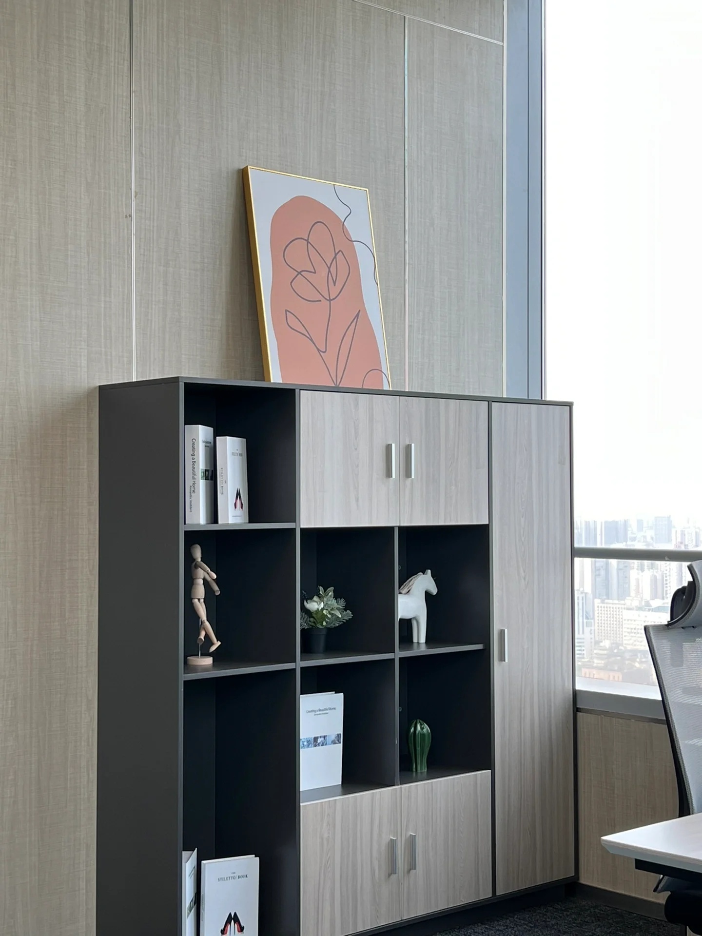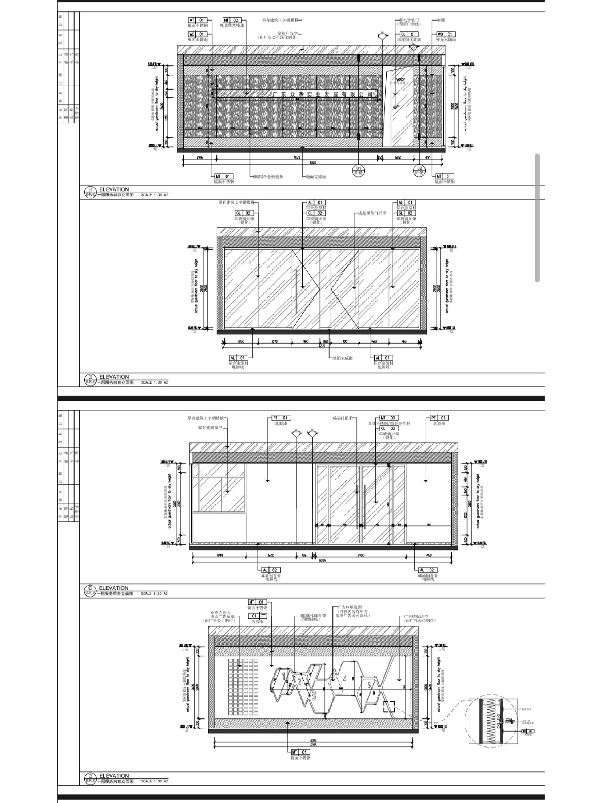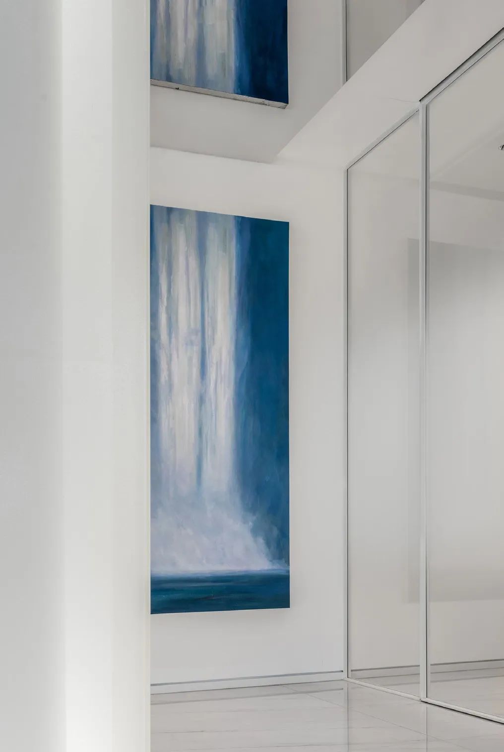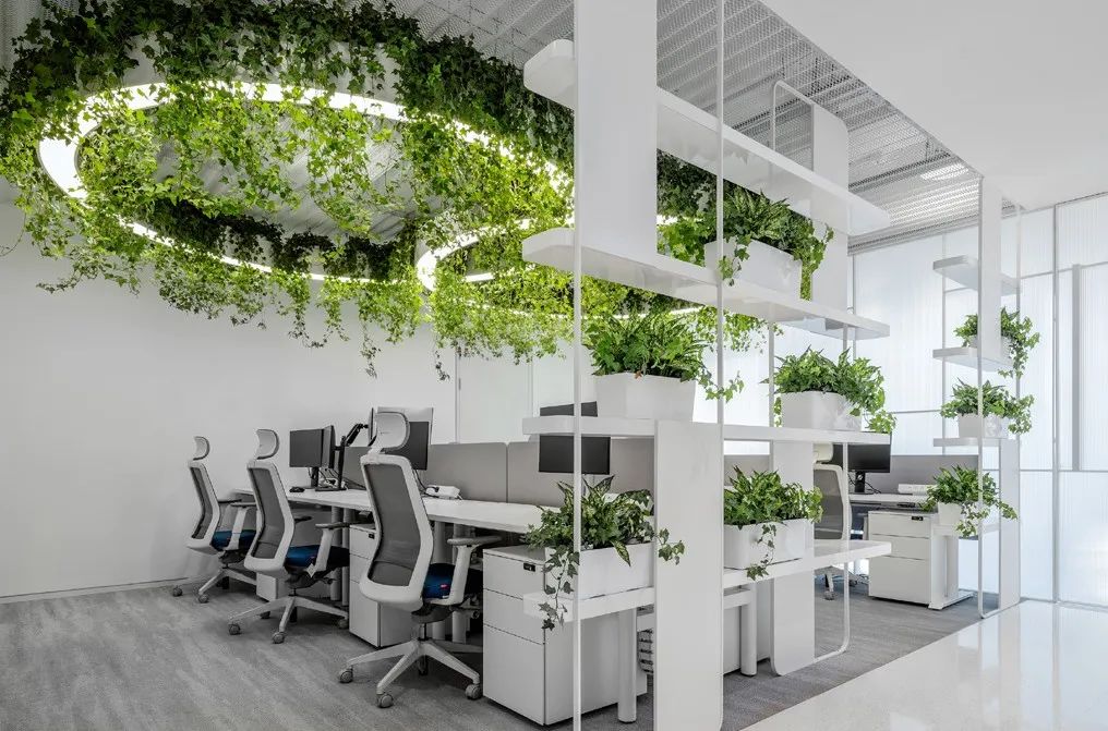 在空间布局上,将面西偏窄的空间作为接待区,与室外的露台连接,露台上的山石景观与室内的流水景观融为一体;将露台的两侧作为户外休息区,对接待功能做更广的延伸。平面图的东侧与南侧为后场工位区,将所有员工工位临窗,最大化地让员工享受到明媚的自然光和眺望远方的视野。 在材料运用上,接待区地面与墙面全部采用岩板,靠近核心筒的墙面使用 U 型玻璃,让实体的结构墙显得轻盈透亮。办公区的地面全部采用编织地毯代替传统的尼龙地毯。镜面不锈钢在天花板上的应用是整个空间的亮点, 所有的过道均形成倒影,游走其中便能感受到空间的延伸与变化。