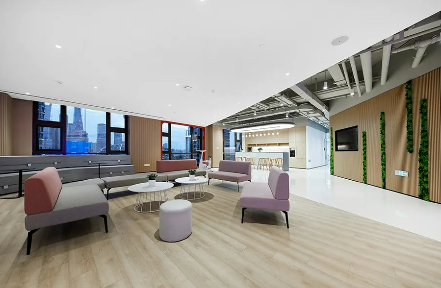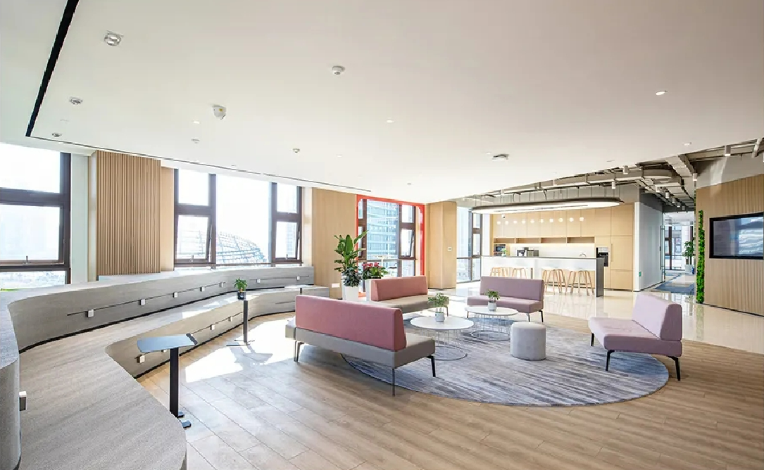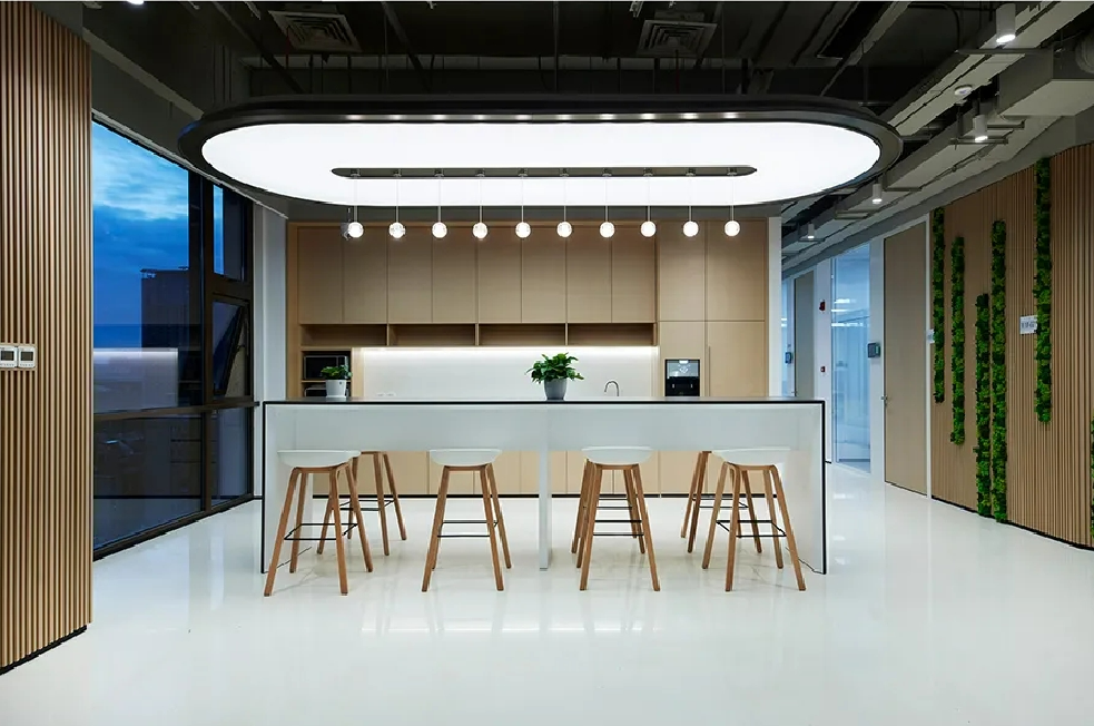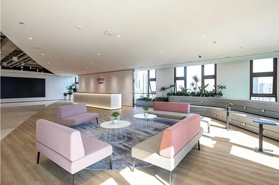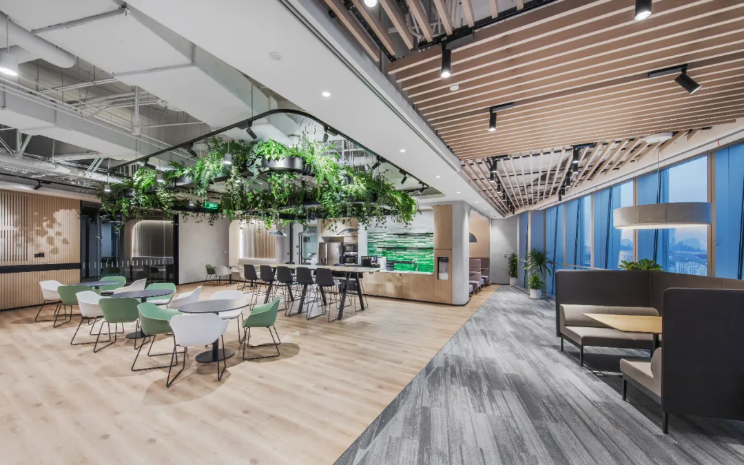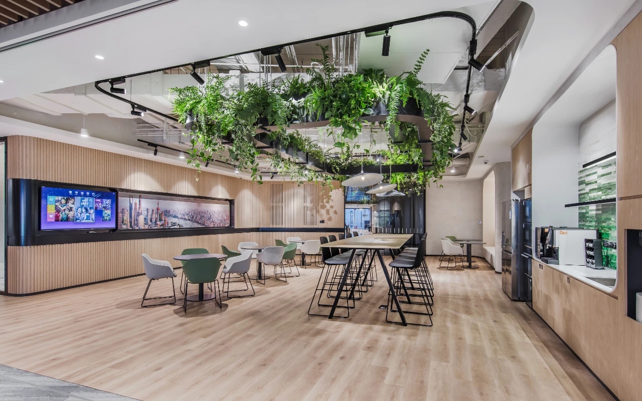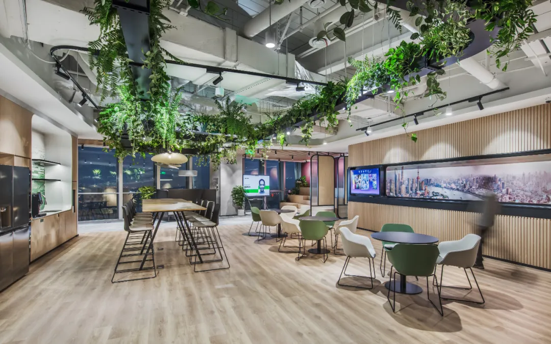 设计中体现了社区精神、展现了上海本土文化,提倡工作与生活平衡的设计理念。为了体现HALEON上海办公室的人文理念,设计师从上海市中心的植物园区域中汲取灵感,创造了一个“社区公园”的概念。这些充满城市能量和文化的景观元素,在设计中充分的体现;大面积的绿植应用在办公空间的各个区域中,给人一种置身于花园中的感受,不仅丰富了空间的层次,也缓解了工作中的视觉疲劳。