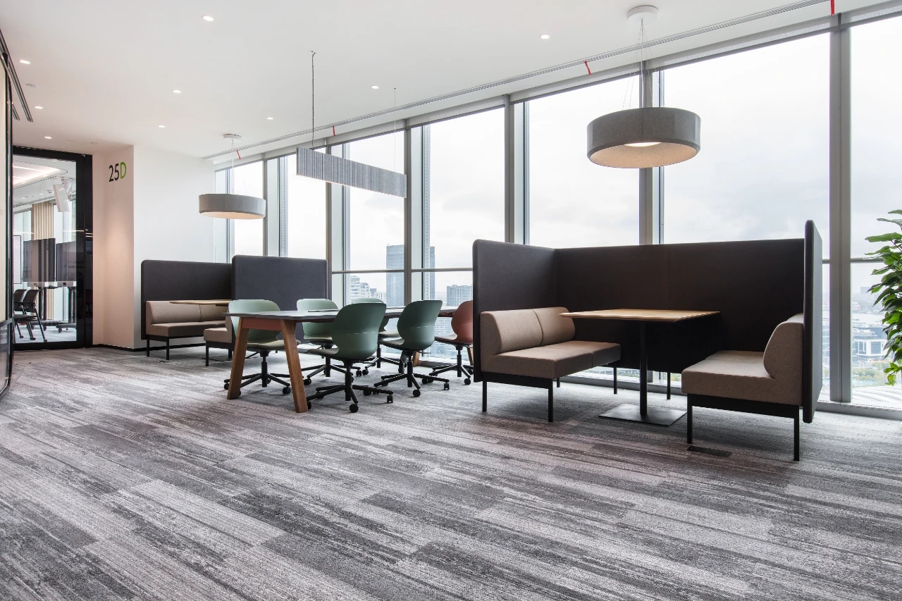 设计师相信,自然的色彩能够使员工产生积极的情绪,从而能对生产力产生深远的影响。绿色和白色等自然色调可以提高效率和专注力,而暖黄色可以激发乐观、创造力和新鲜活力。灰色的中性本质也用作色调注入,与主要的白色一起为空间带来深度。设计中,通过使用具有相似色调的石材、木材、软木和金属来扩展二次色,让空间变得健康、温暖而富有活力。室内的充足的高度,提供了充满自然采光的明亮空间,也为引入自然植物提供了充足的条件。空间的设计中引入自然的元素:墙壁上设有活的绿色植物,天花板上设有植物和花盒,木纹的贴膜。这些自然元素和家具融为一体,并根据每个区域的功能设计不同的材料、纹理、家具和颜色,以鼓励注意力、放松和创造力,让人们在一个空间内享受多重体验。