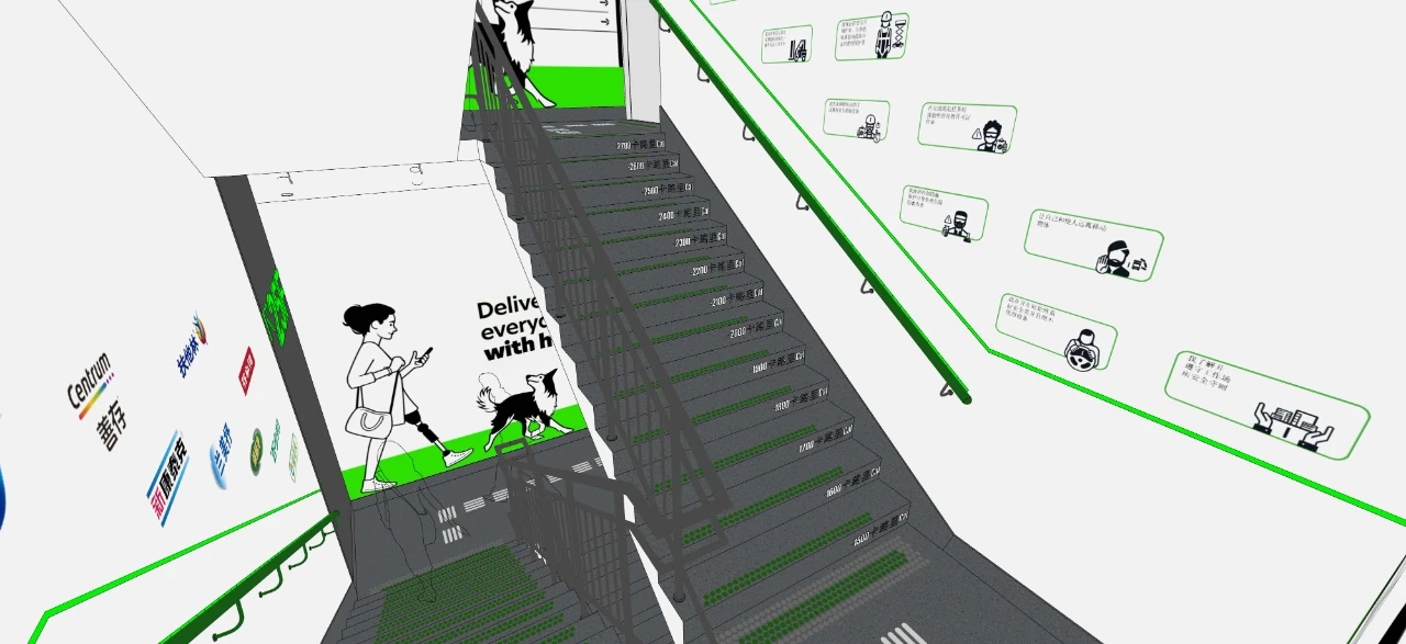 为了鼓励员工保持良好的健身习惯,设计师将楼梯间打造成一个趣味运动空间,每一楼层都呈现不同的海报,每一个台阶都标注了卡路里数,既让楼梯间美观,又增添了运动的乐趣。